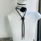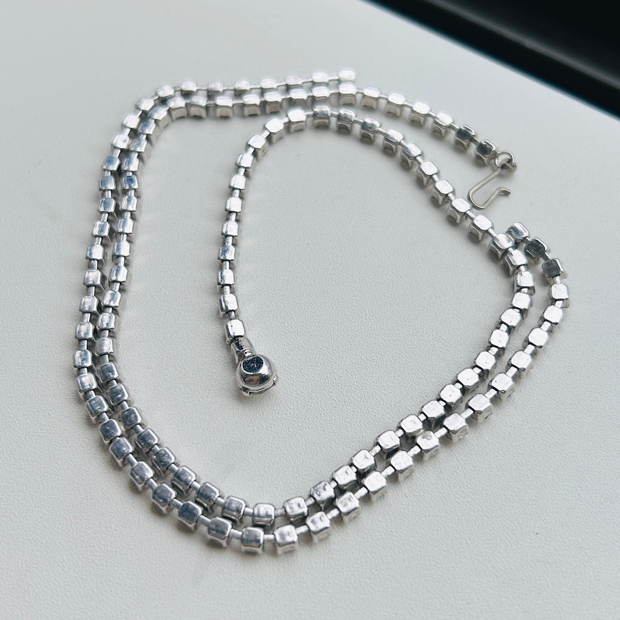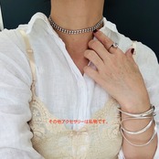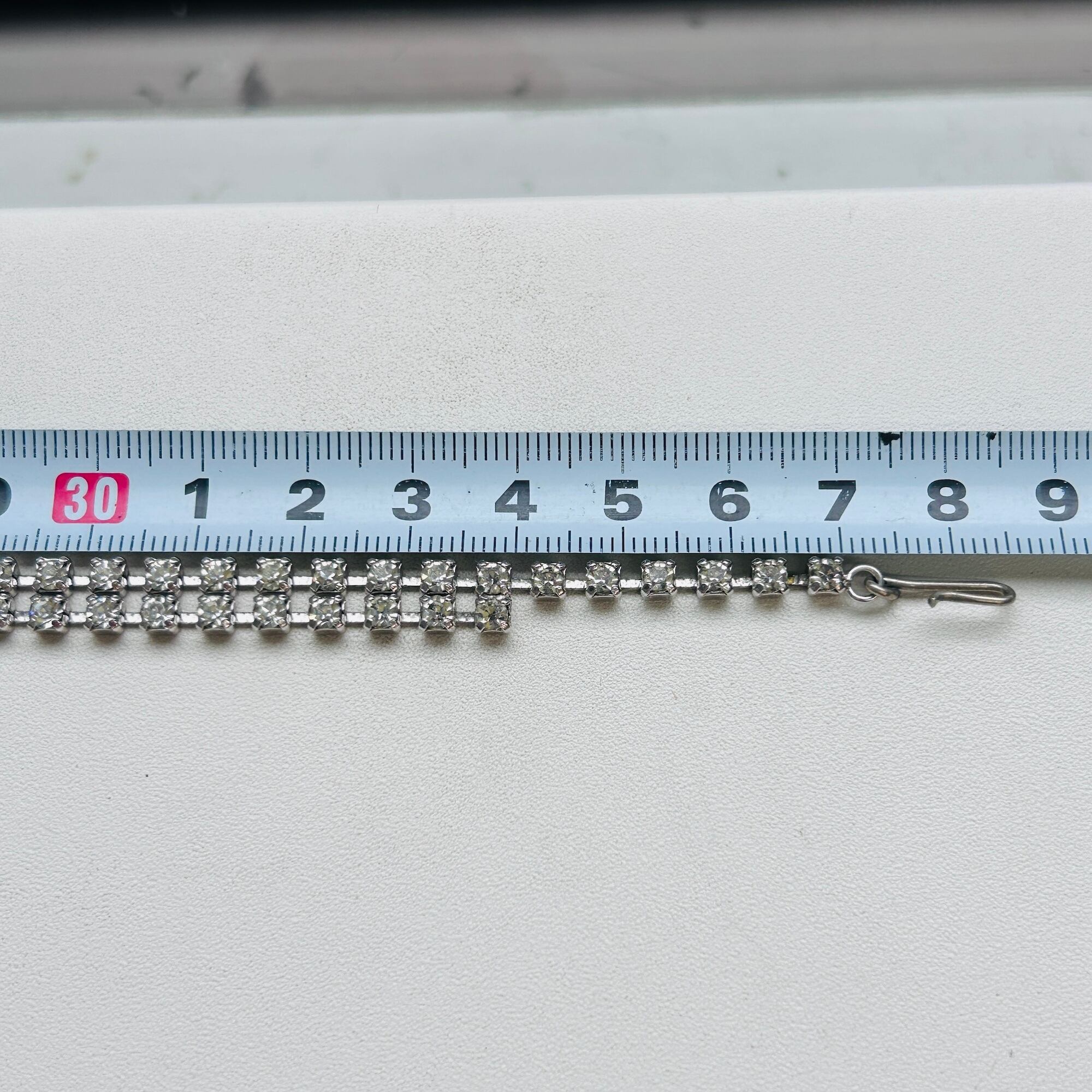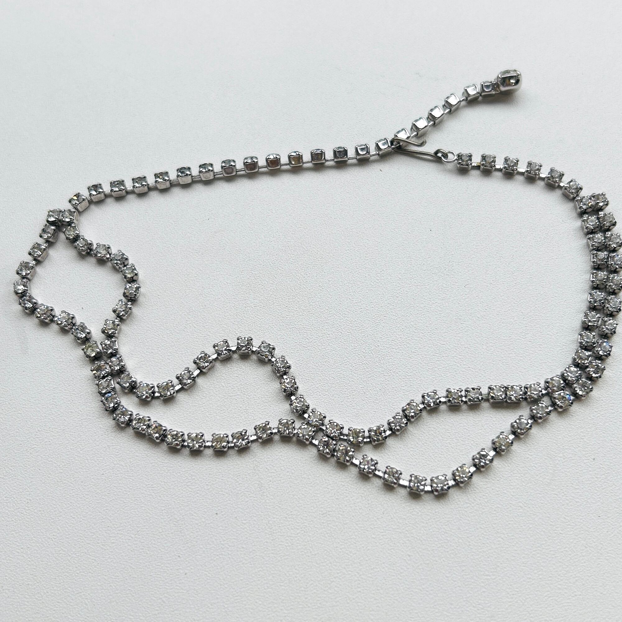 シンプルなラインストーンチョーカー。前面は2列になっていて2箇所接着されています。引っ掛けるだけのJフックはラインストーンが垂れ下がって後ろ姿もキレイに見えます。シャツだと見えないですが、、クルーネックやタートルネックは是非アップスタイルで:):)フックはストーンとストーンの間に背面から引っ掛けて下さい(写真5)。使用感のないキレイなお品です。シルバーネックレスとの重ね着けもオススメです。