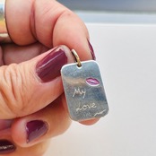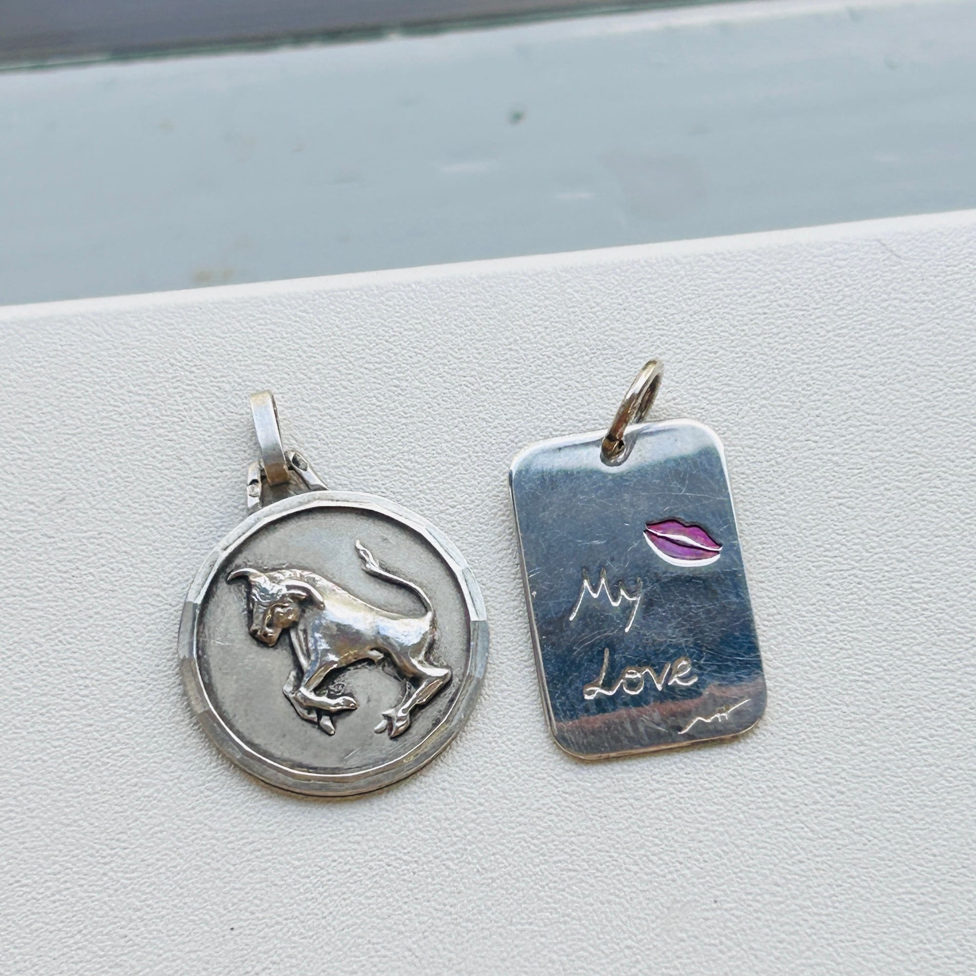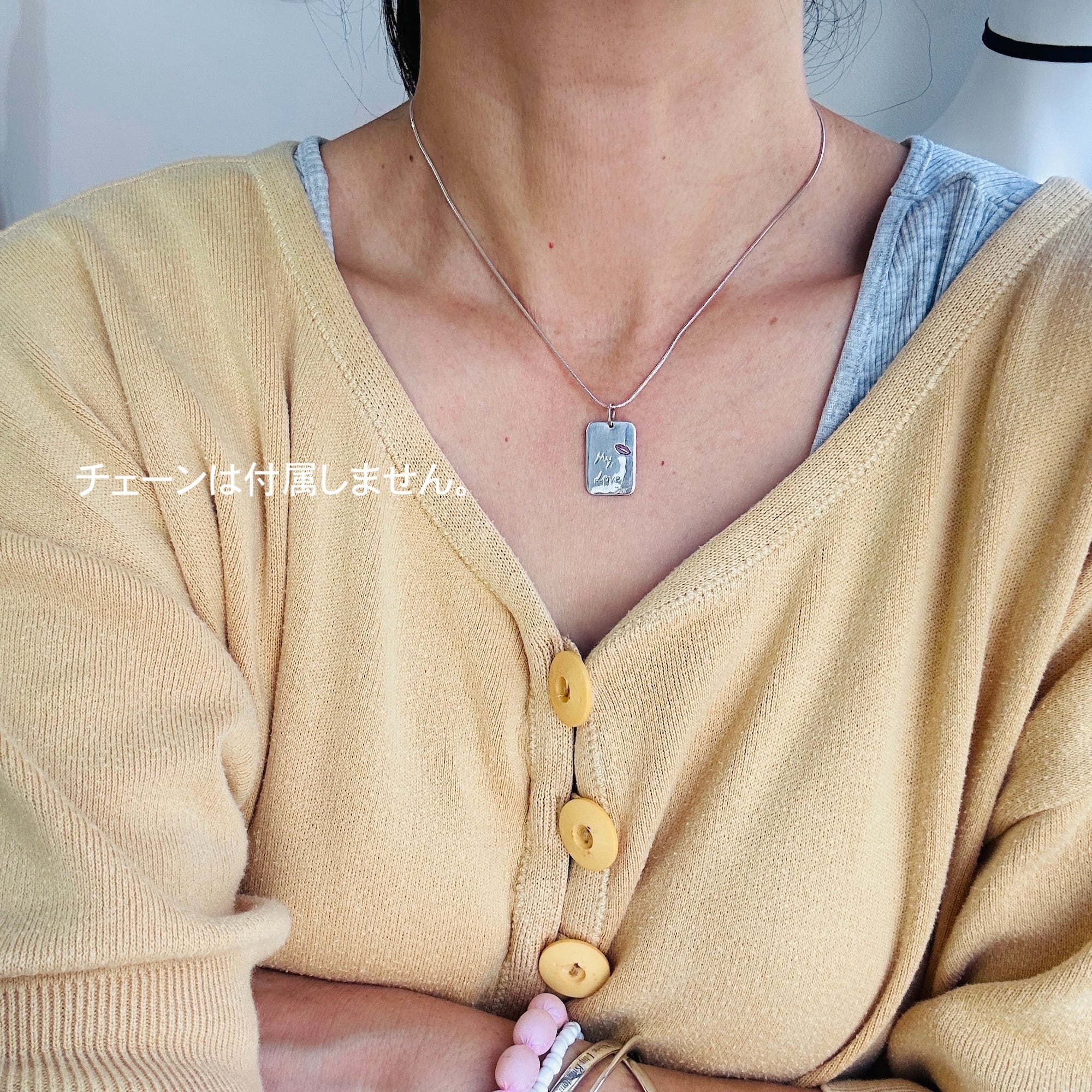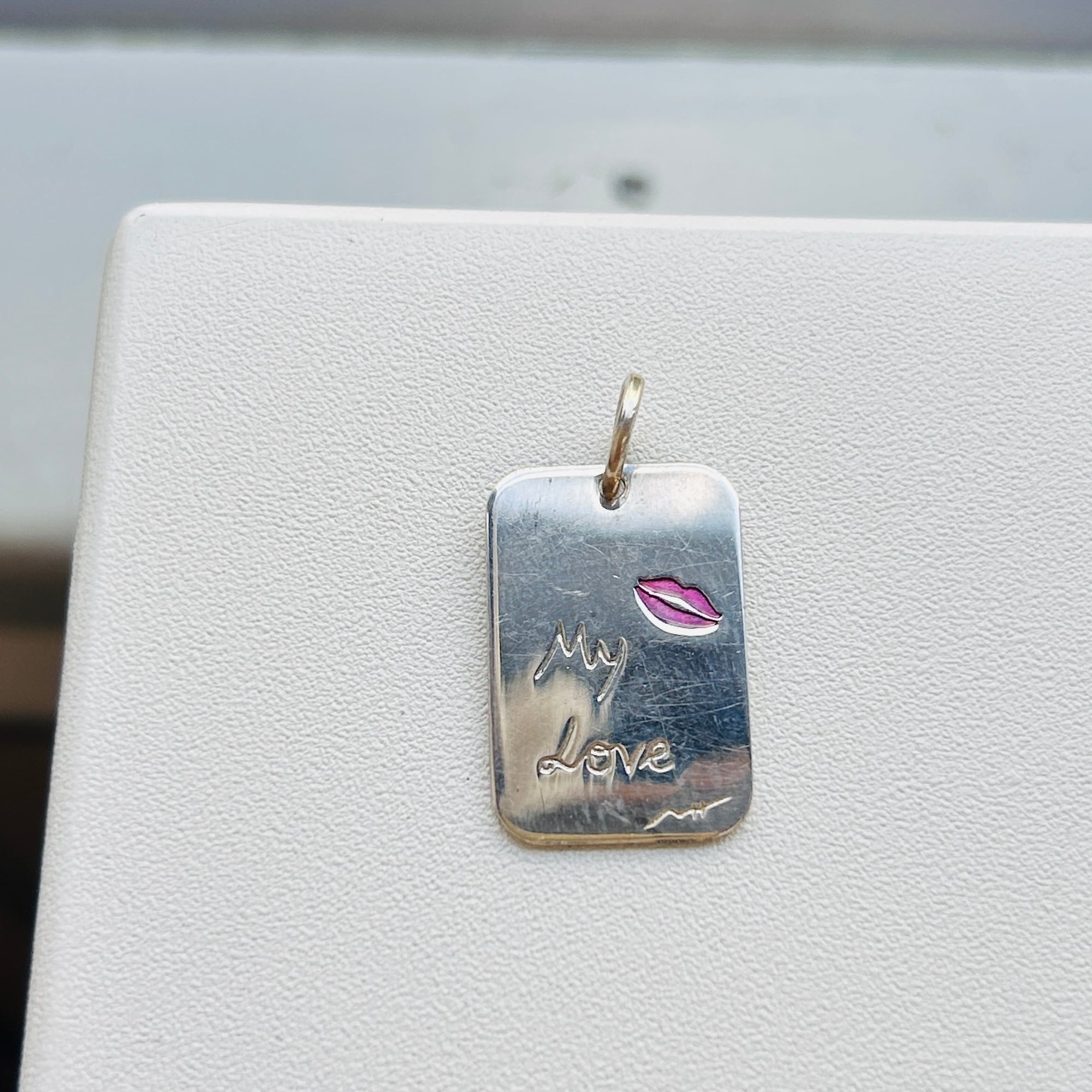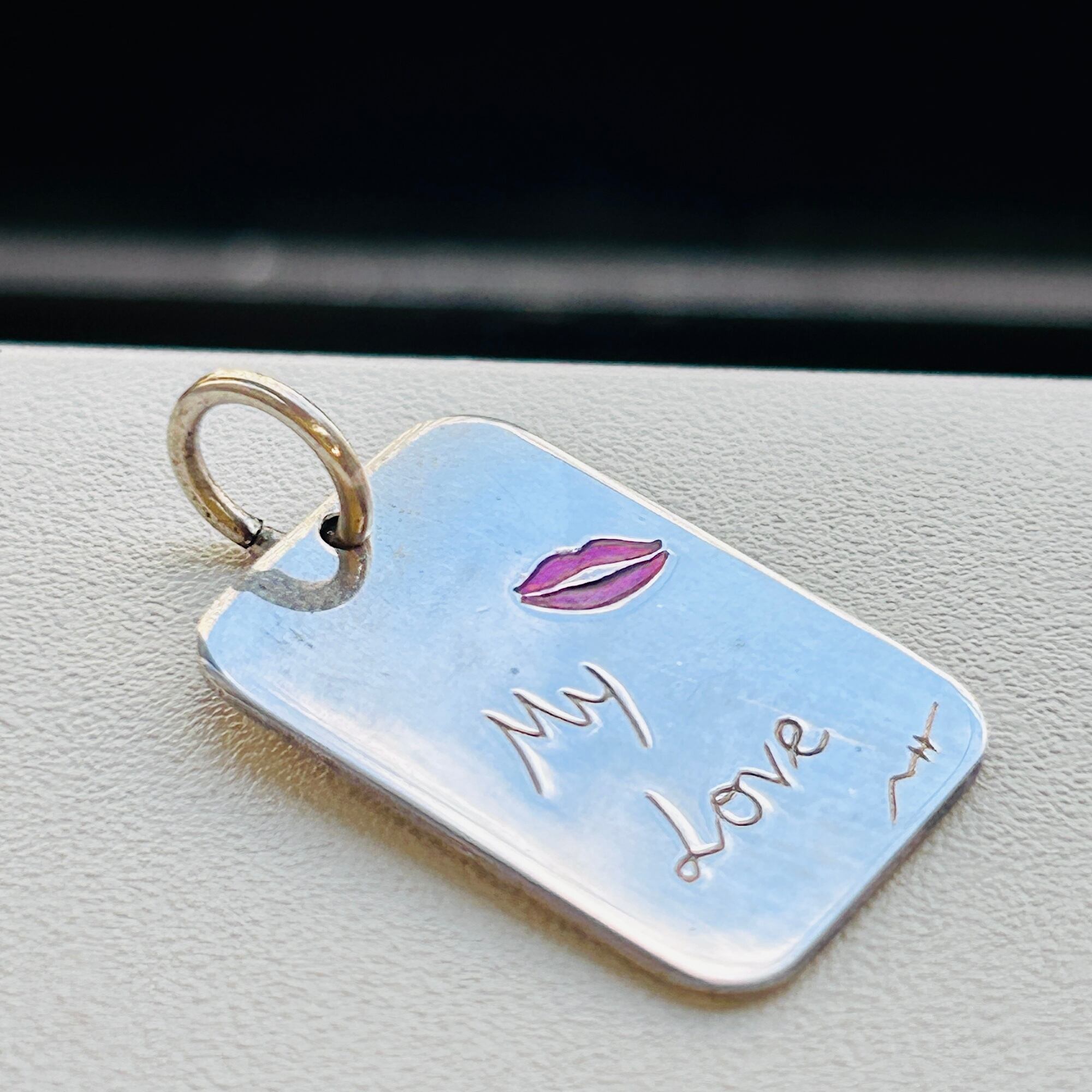 長方形プレートタグに「My Love」とKissマーク。フランスらしい愛のあるキュートなタグです。右下はおそらく描いた方のサイン。裏にフランスメーカーマークと「925」。光沢ある艶やかなシルバープレート。角が丸くて滑らかで手触りがいいです。シルバー925丸カン(内径4mm)はこちらで付けました。お手持ちのチェーンや革紐やコードと合わせて着用ください。
