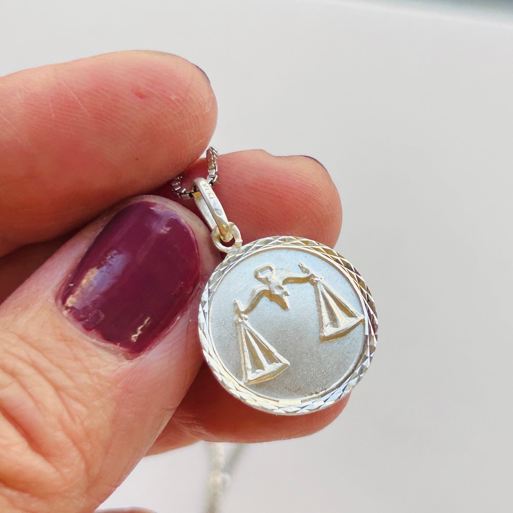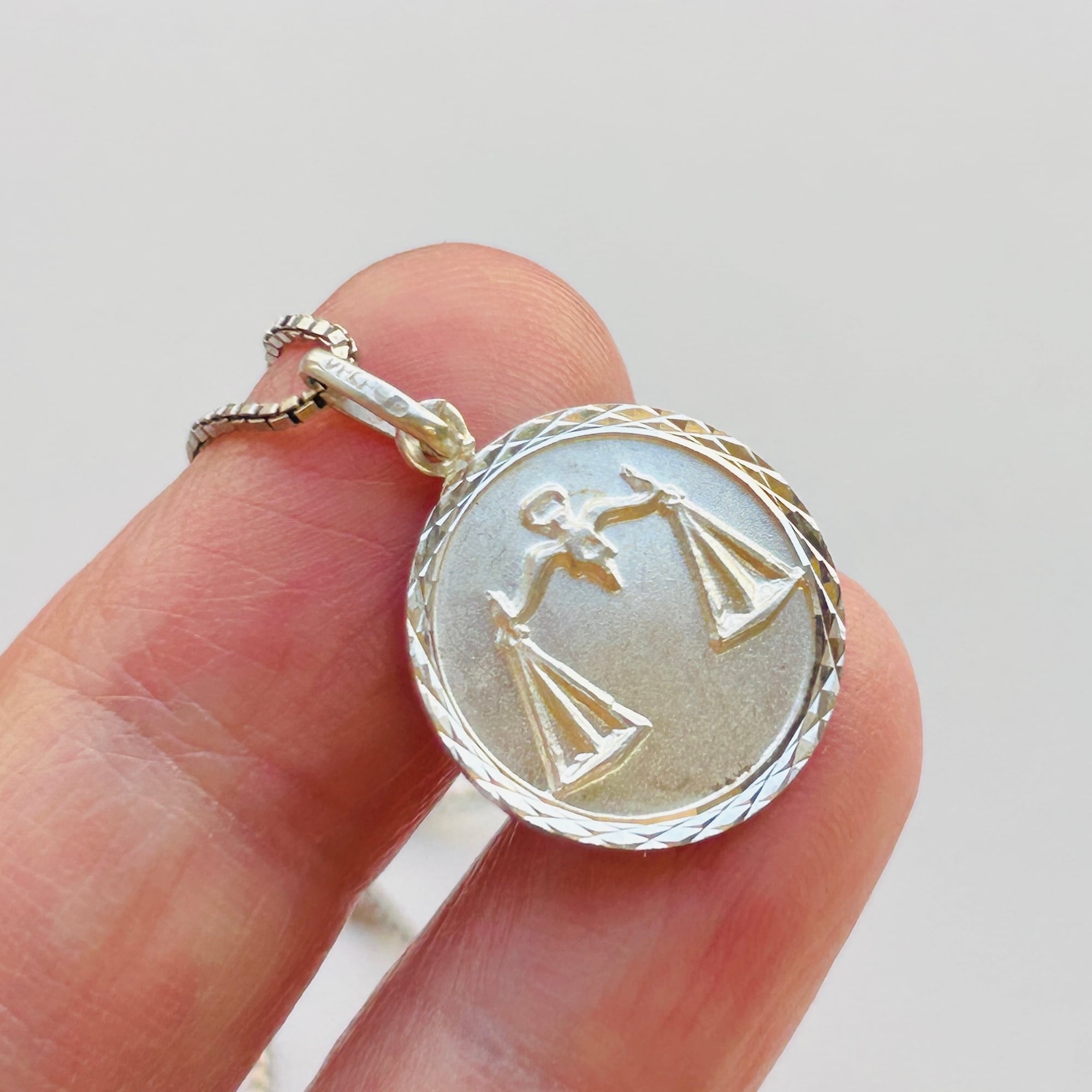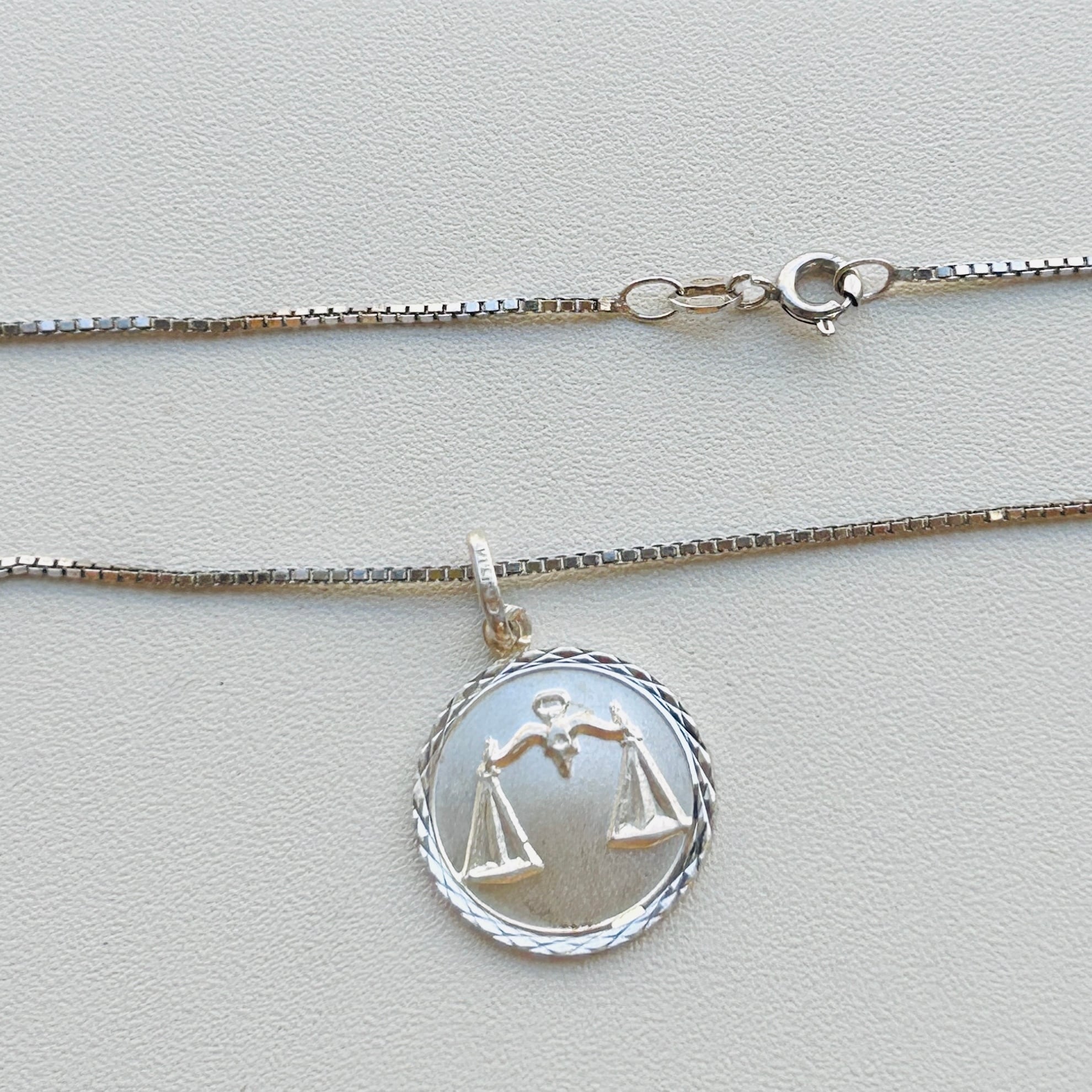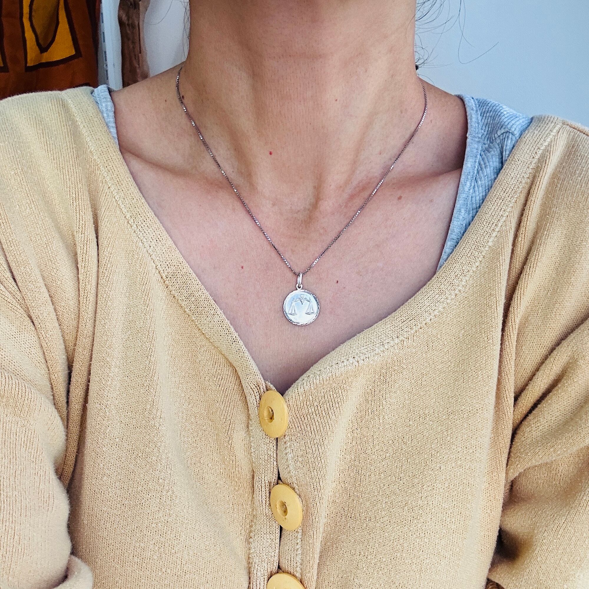 フランスから届いた星座チャームネックレス。直径1.7cmのメダルに天秤座マークのエンボス。縦長の丸カンに読み取れない刻印とメーカーマークらしき刻印。ボックスチェーンはキラキラっとメタリックな輝きでメダルチャームのフレームとよくマッチしています。入荷当初は変色してましたがクリーニングすると驚くほどピカピカになりました。またご自身でエイジングを楽しみながら着けて頂ければと思います。チェーンに「925」とイタリアンシルバー刻印。