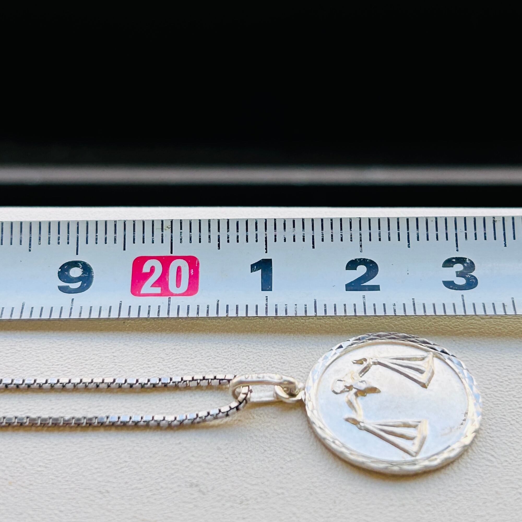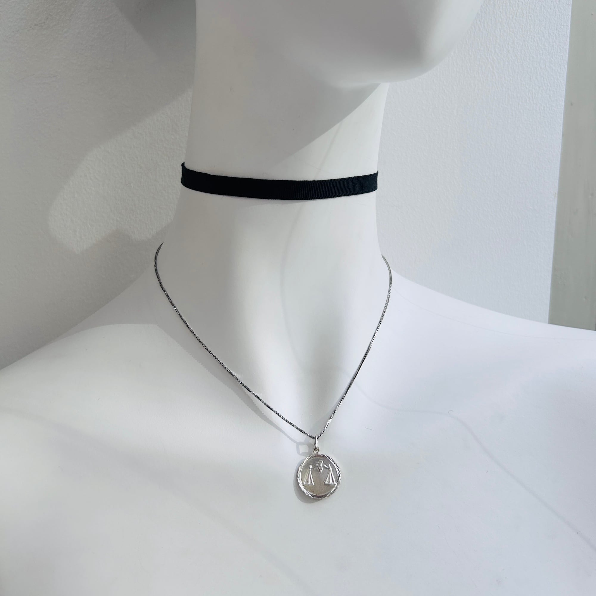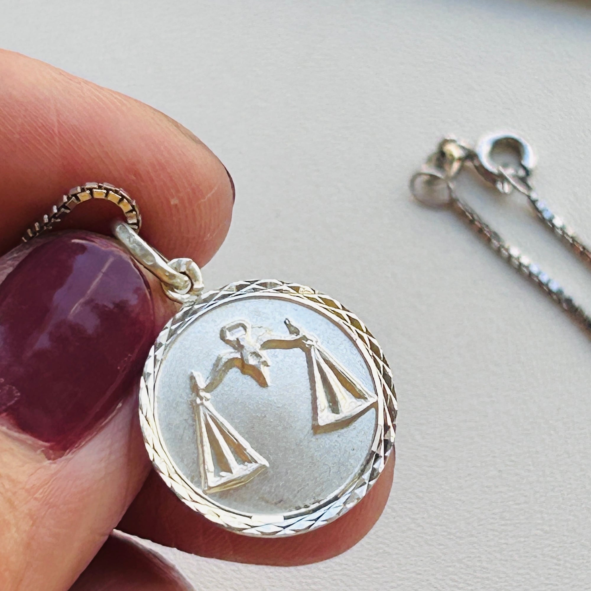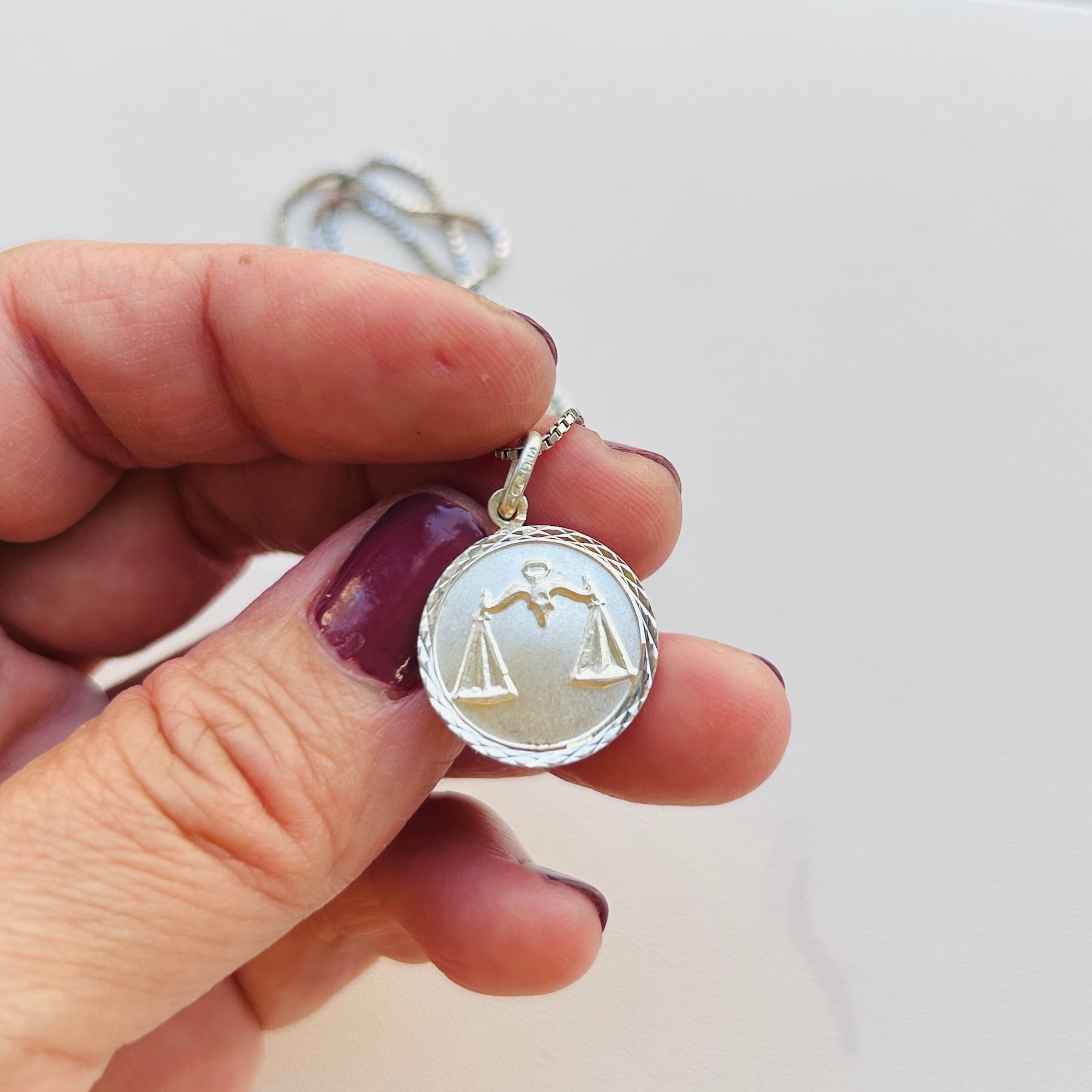 フランスから届いた星座チャームネックレス。直径1.7cmのメダルに天秤座マークのエンボス。縦長の丸カンに読み取れない刻印とメーカーマークらしき刻印。ボックスチェーンはキラキラっとメタリックな輝きでメダルチャームのフレームとよくマッチしています。入荷当初は変色してましたがクリーニングすると驚くほどピカピカになりました。またご自身でエイジングを楽しみながら着けて頂ければと思います。チェーンに「925」とイタリアンシルバー刻印。