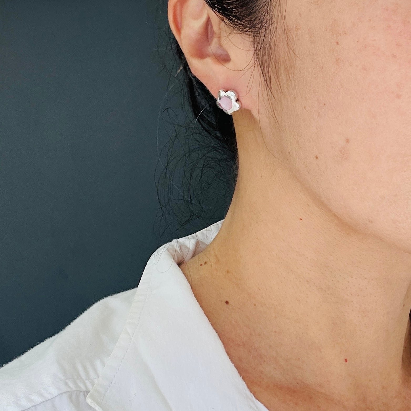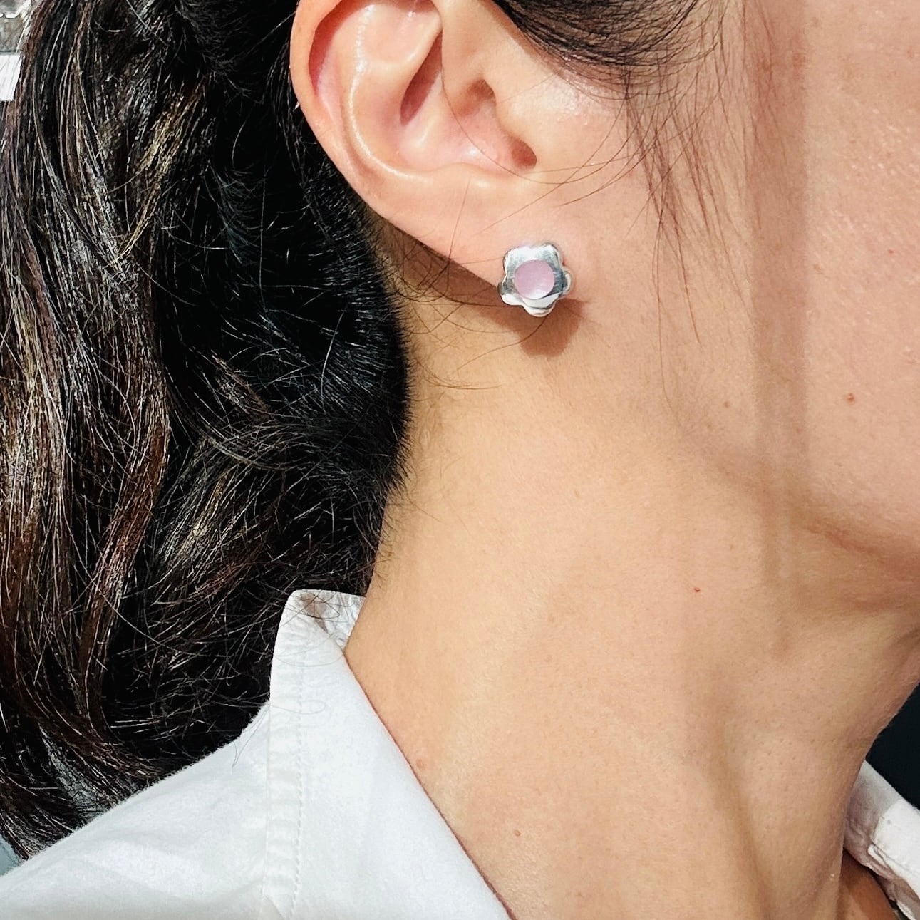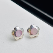 フランスから届いたシルバーピアス。中央にシェルが埋め込まれたミニフラワーピアス。薄い桃色のシェルです。そこそこ厚みがありしっかりした作りです。裏に「925」「TH」とメーカーマーク。針の位置はやや上より。長さ11mmです。