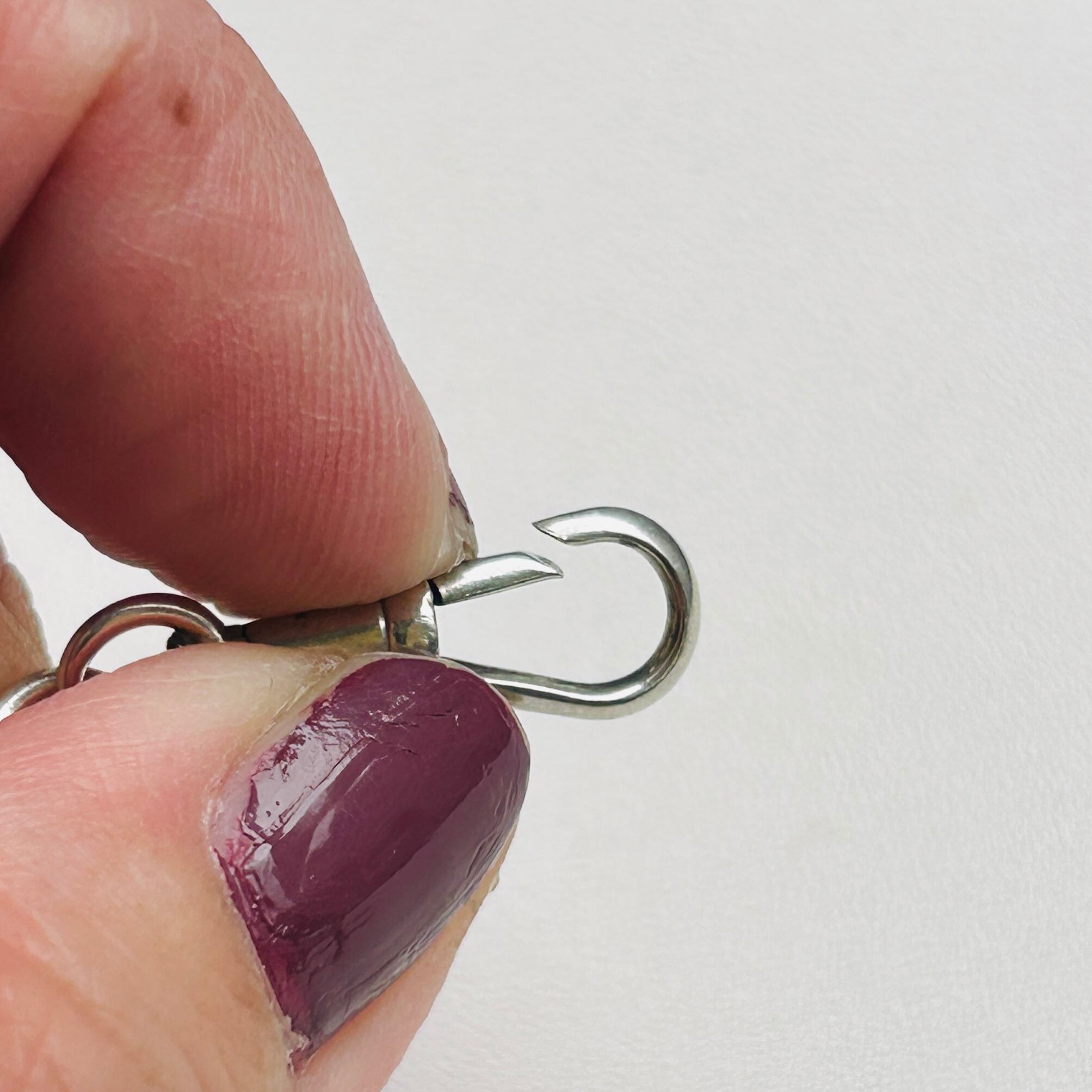 フランスシルバー800ウォッチチェーン。かなりくすんでいましたが磨くと美しい艶を取り戻しました。プリプリと瑞瑞しい、とてもいいチェーンです。雫型の引っ掛け金具に向かって太さが細くなっています。こちらは懐中時計用だけでなく、南京錠型のパドロックハートと合わせてブレスレットとしても使って頂けます。私の場合は引っ掛け金具の手前、刻印が押してある輪に引っ掛けるとちょうどいい長さになります。刻印はcrab2つとフランスメーカーマーク。crab(カニ)はフランス製シルバー800を最低保証する、1838〜1984年まで使用されたマークです。