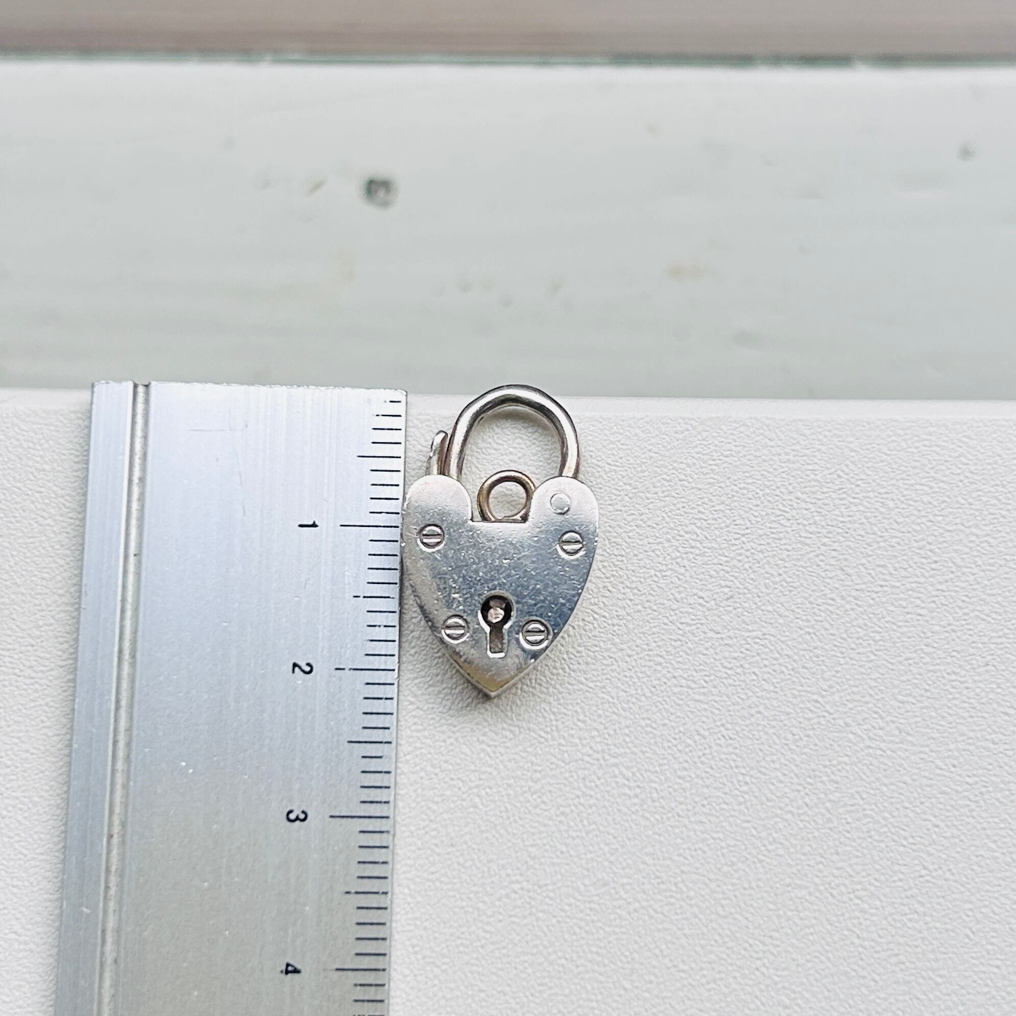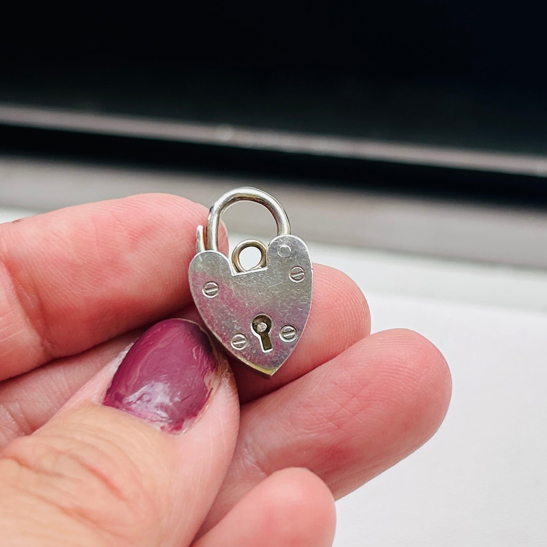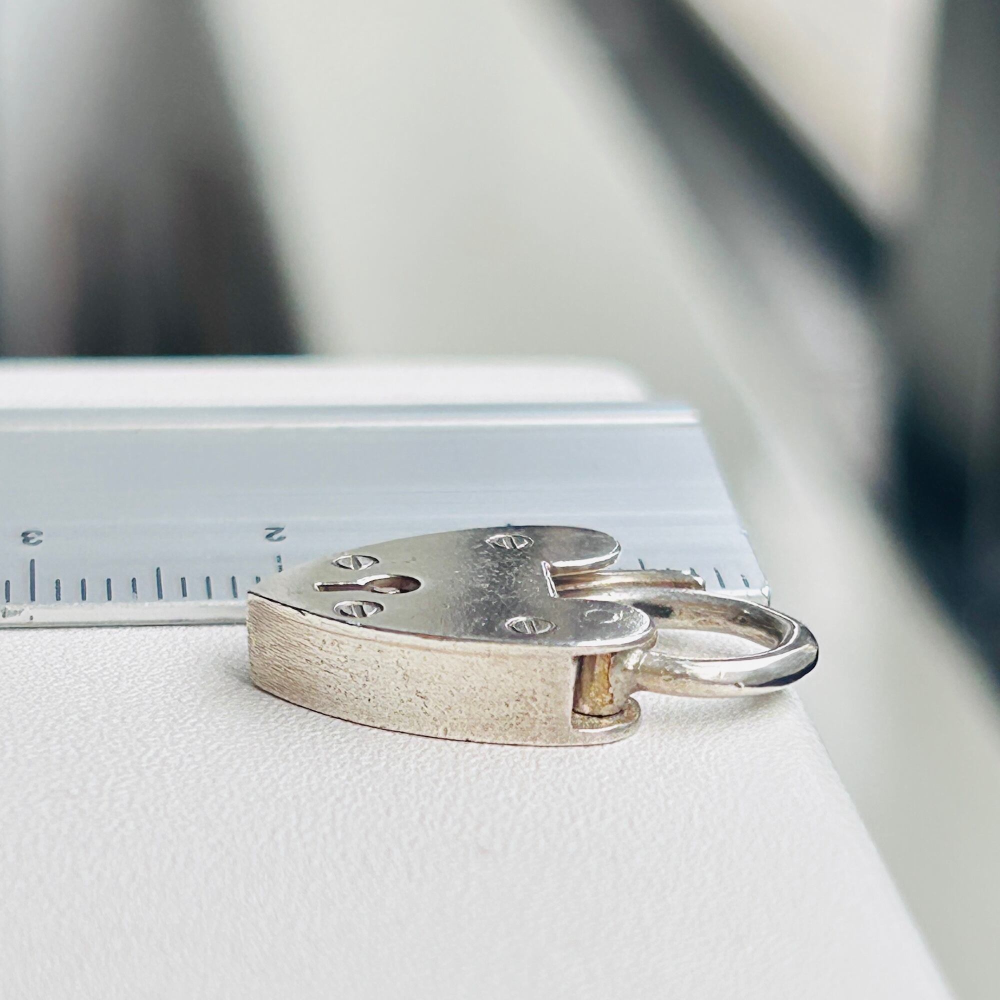 イギリス・ヴィンテージシルバーブレスレットに付いていたハート型南京錠をチャームとして販売致します。こちらは厚み4mm。半円フックもやや太めで通常より全体的にチャンキーな形が魅力です。半円フックは内側に押すと開きます。チェーンコマに引っかけたり、着画のようにチェーンに通したり出来ます。裏の刻印にイギリス・バーミンガムを表す碇マーク。半円フック裏側にもイギリスシルバー刻印。年代を表すアルファベットから1967年製であることが分かります。