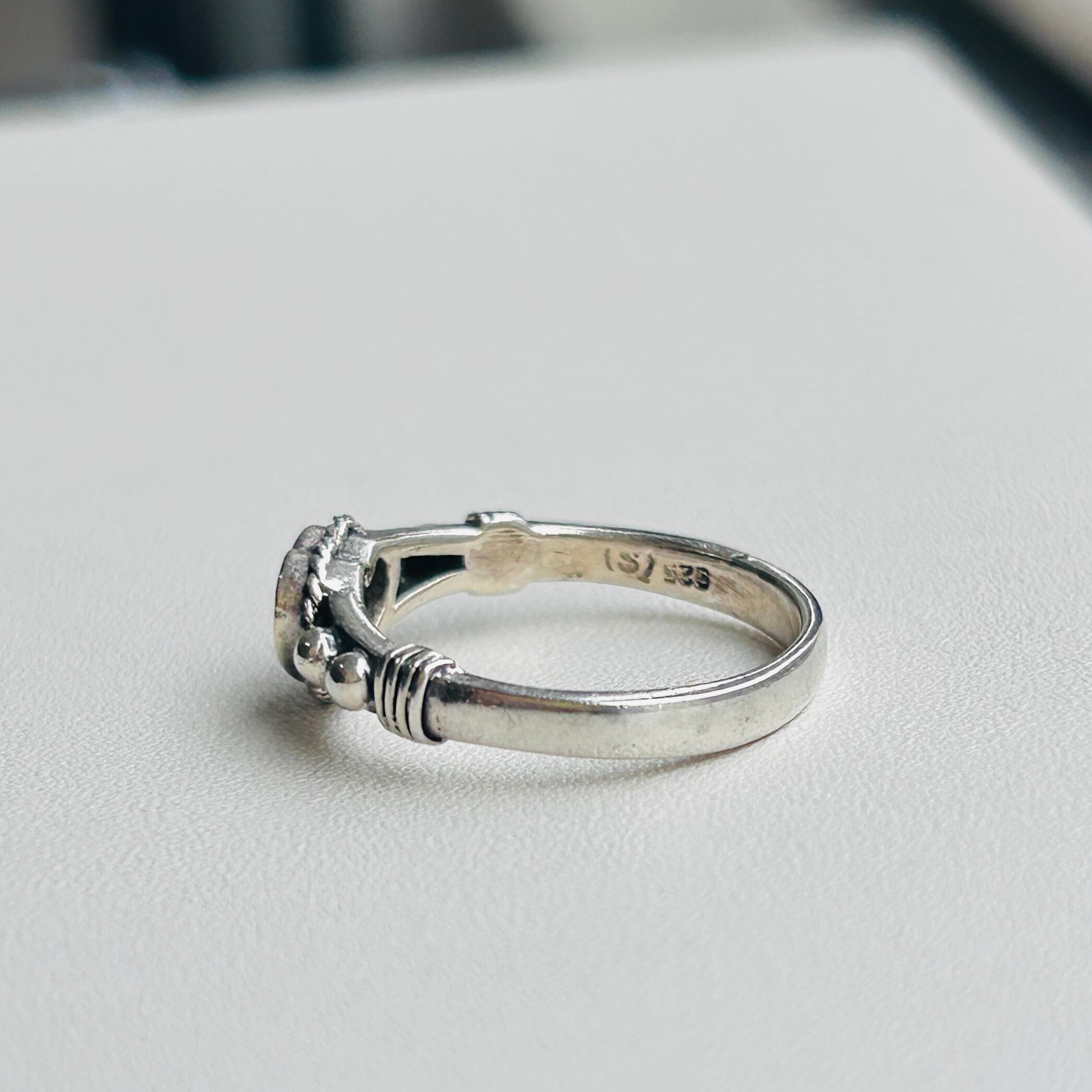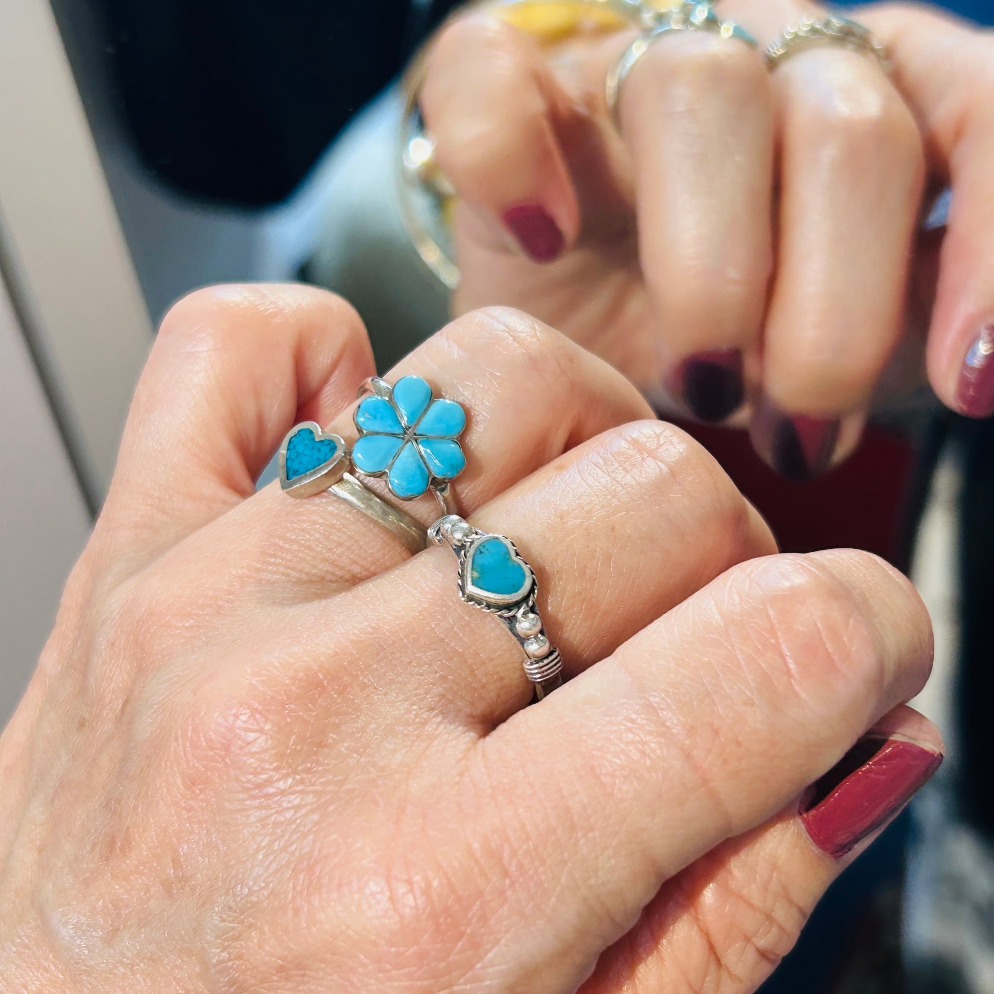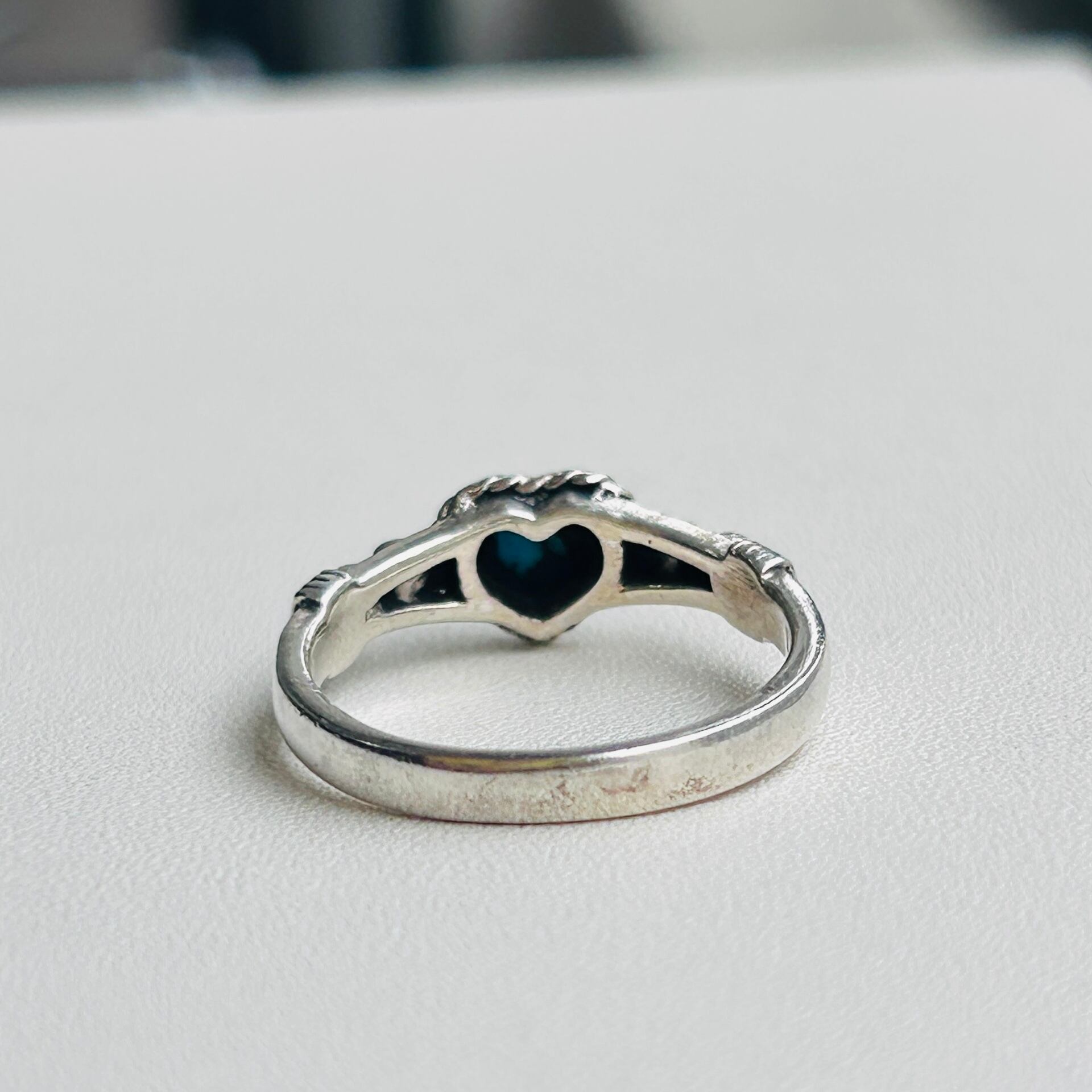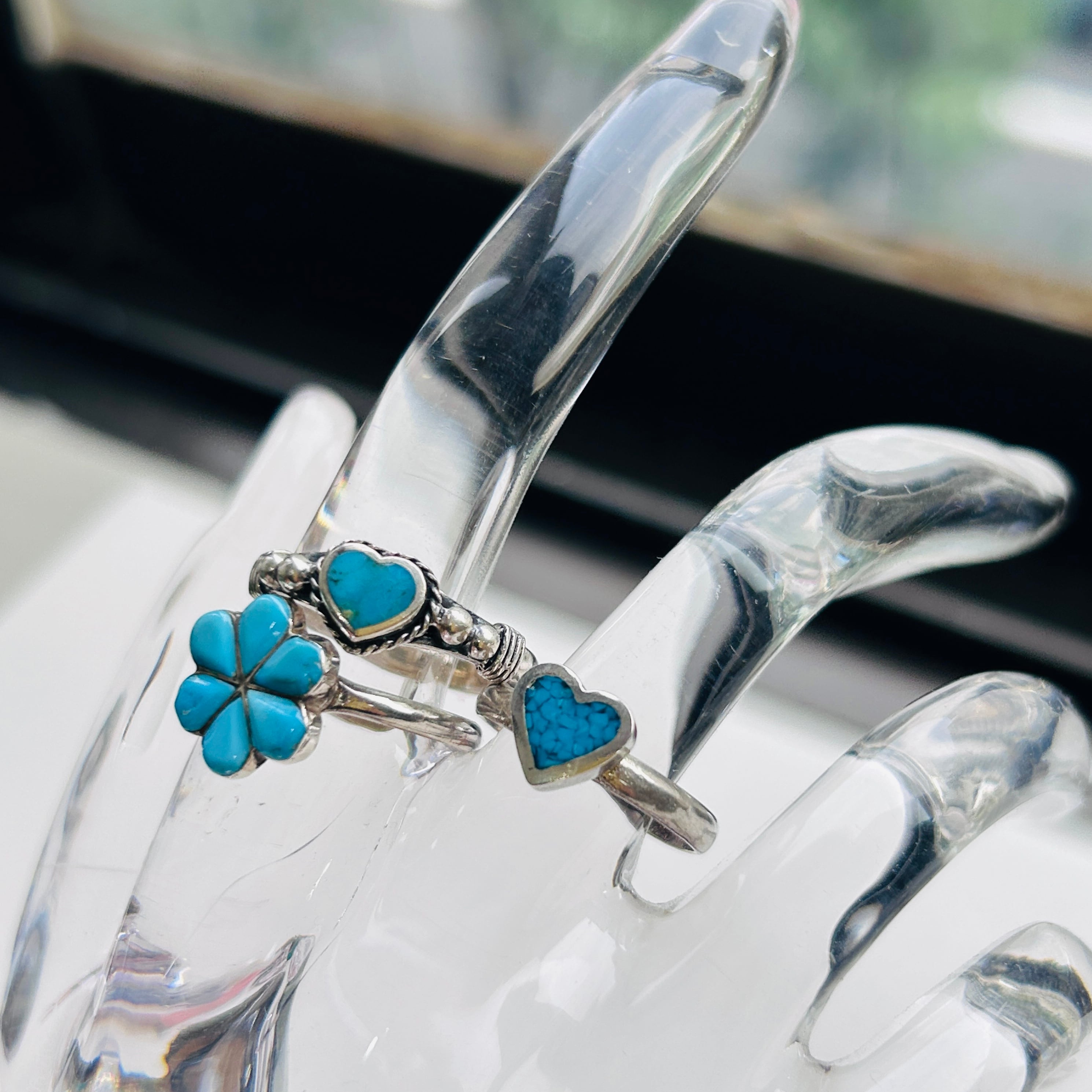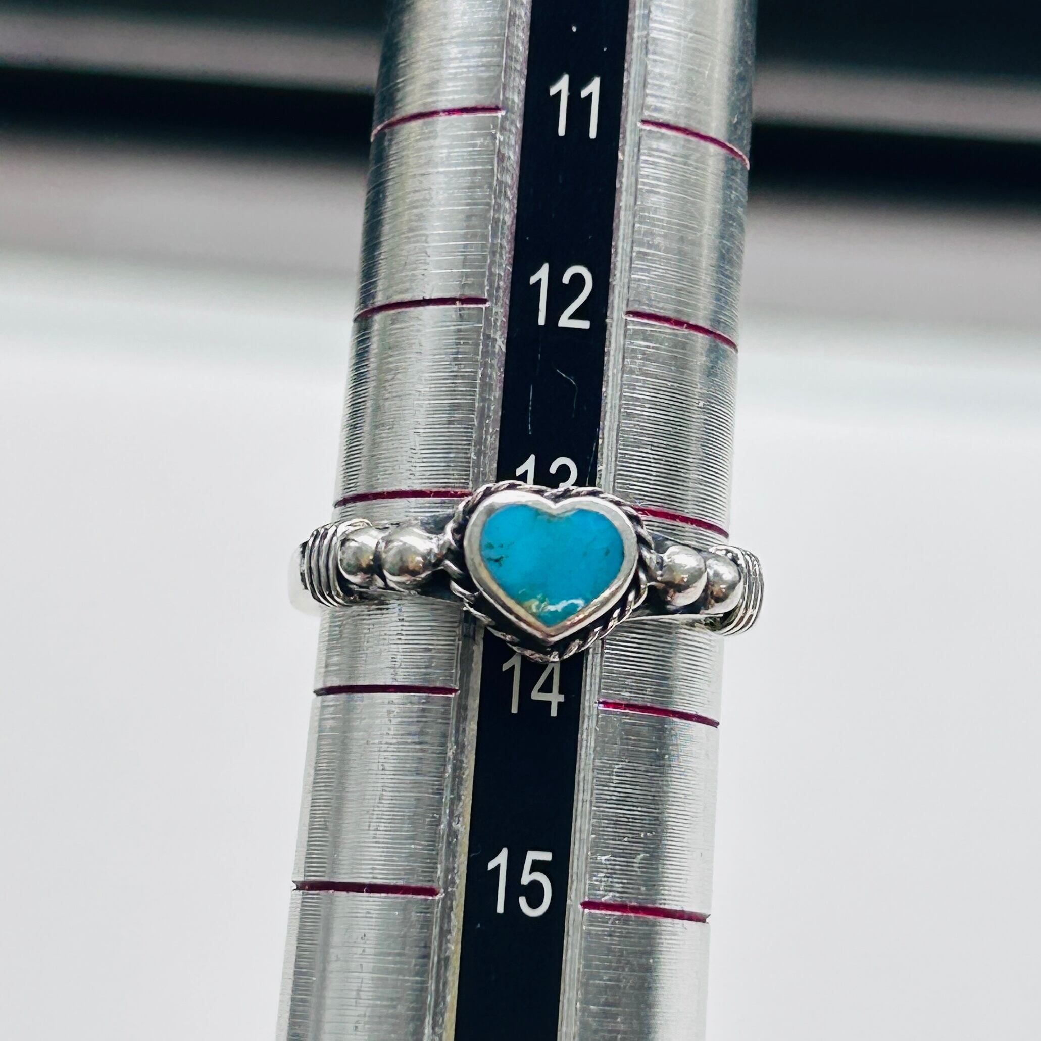 小さなターコイズハート。ロープフレームやストーンサイドの装飾があり小ぶりでも存在感が会って可愛いです。バンドは厚みがあり全体的に丈夫な作りです。古着と合ういい感じのリング。ヴィンテージLoverにオススメのリングです。内側に「925」とメーカーマーク。