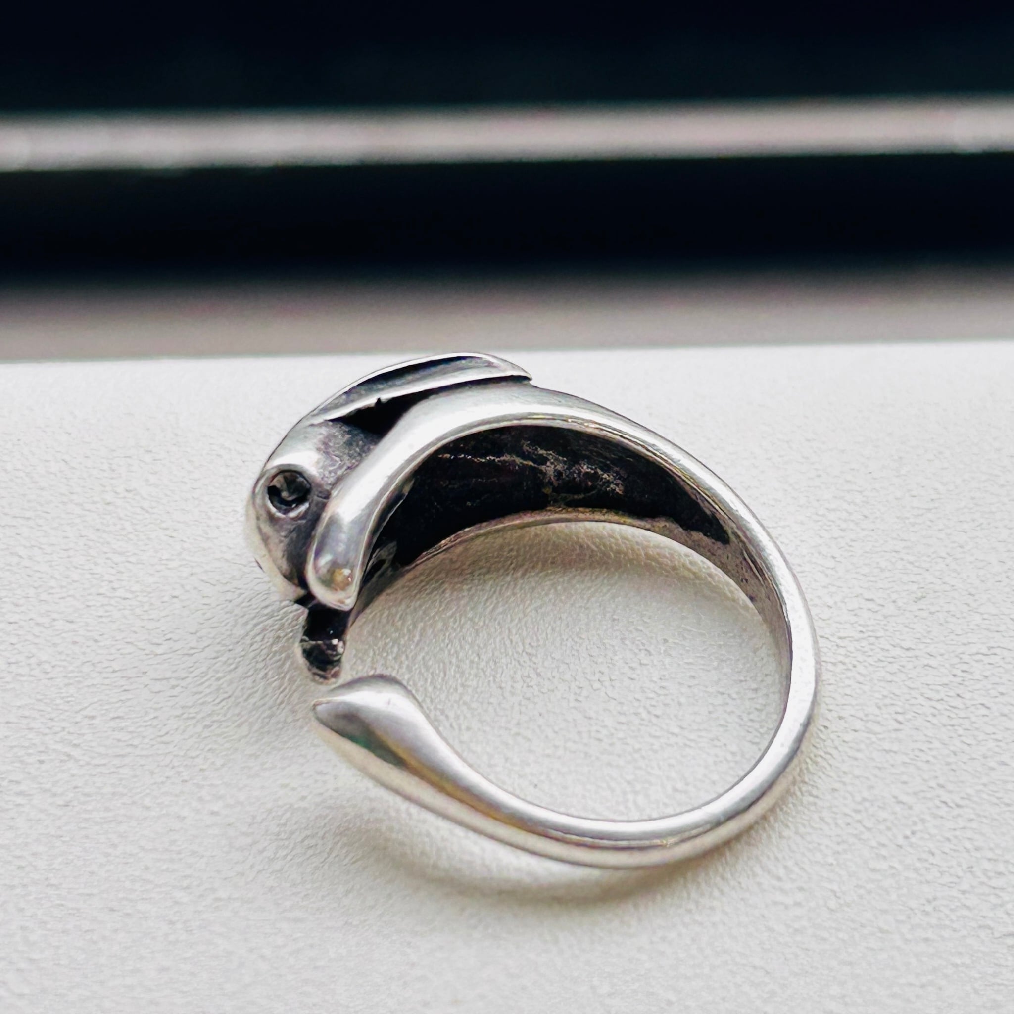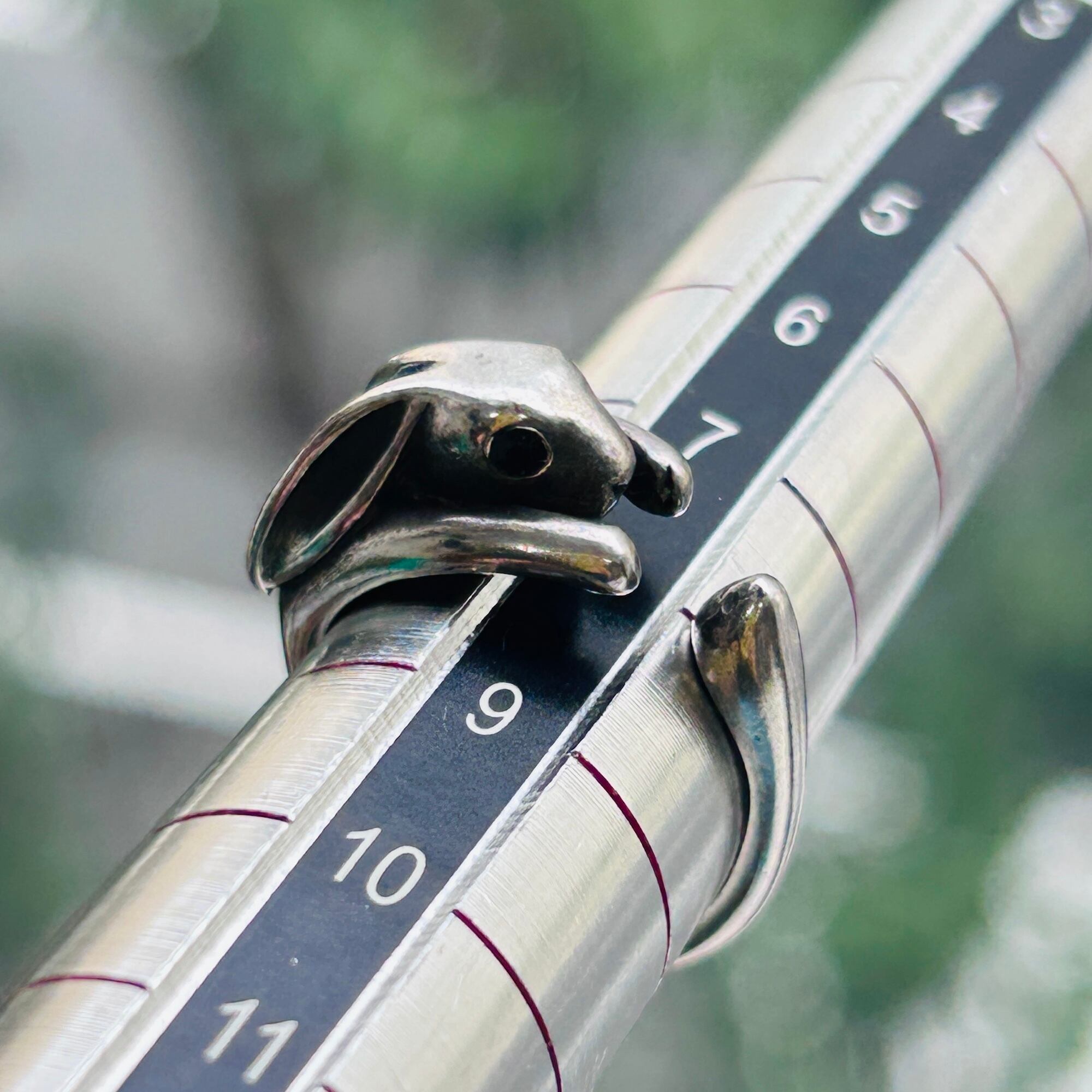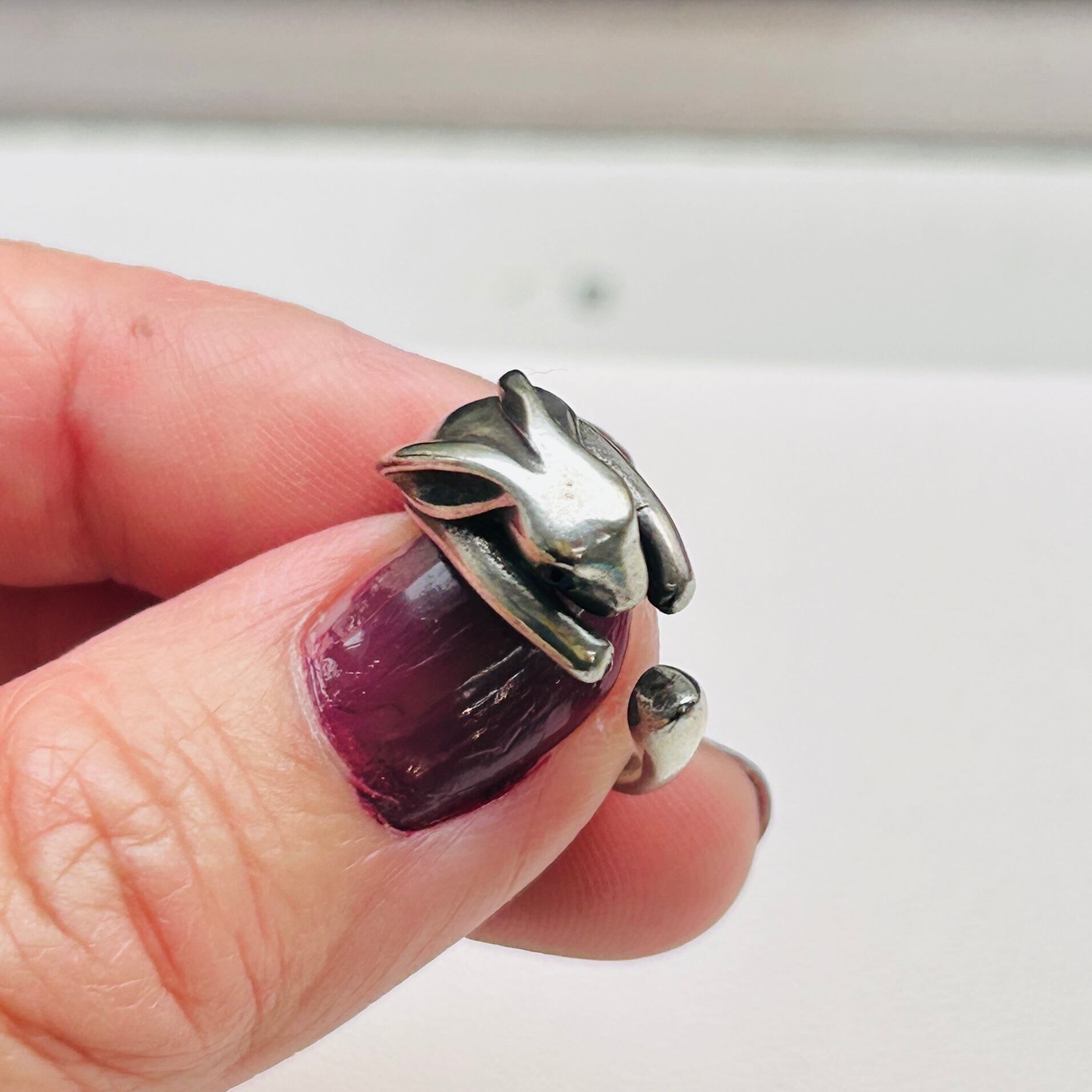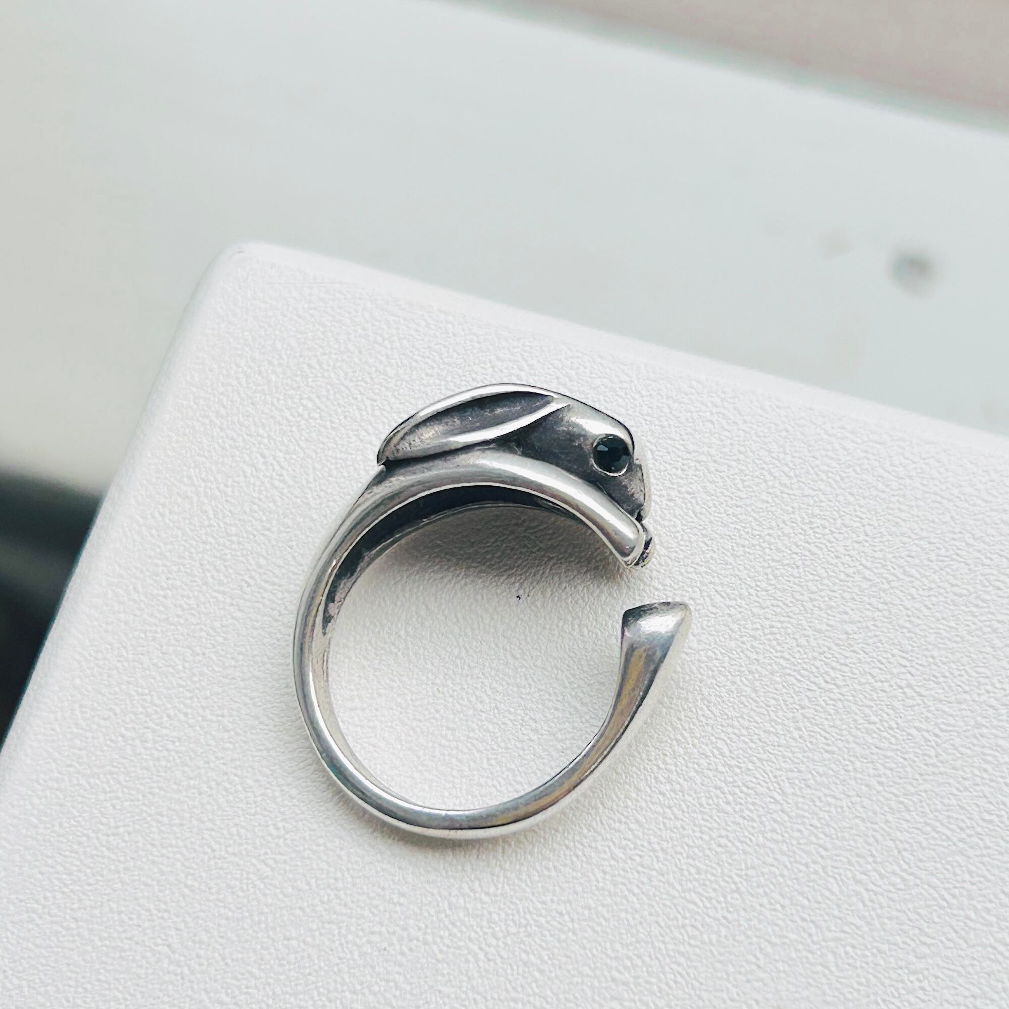ウサギのラップリング。キュートなモチーフと銀古美シルバーが合わさって大人な雰囲気があります。目に入っているのはフレンチジェット(黒いガラス)です。写真で気付いた方もおられるかもしれませんが片目のストーンが取れています。ストーンを改めて入れることも可能です。代金はお好きな天然石1粒2,200円です。お好きなといいつつ金額が変わったり取り扱い不可のストーンもあります(オパール、真珠は不可)のでご興味ある方はまずご相談くださいませ。リングに刻印はありませんがシルバーです。着用感は8.5〜9号に近いように思います。