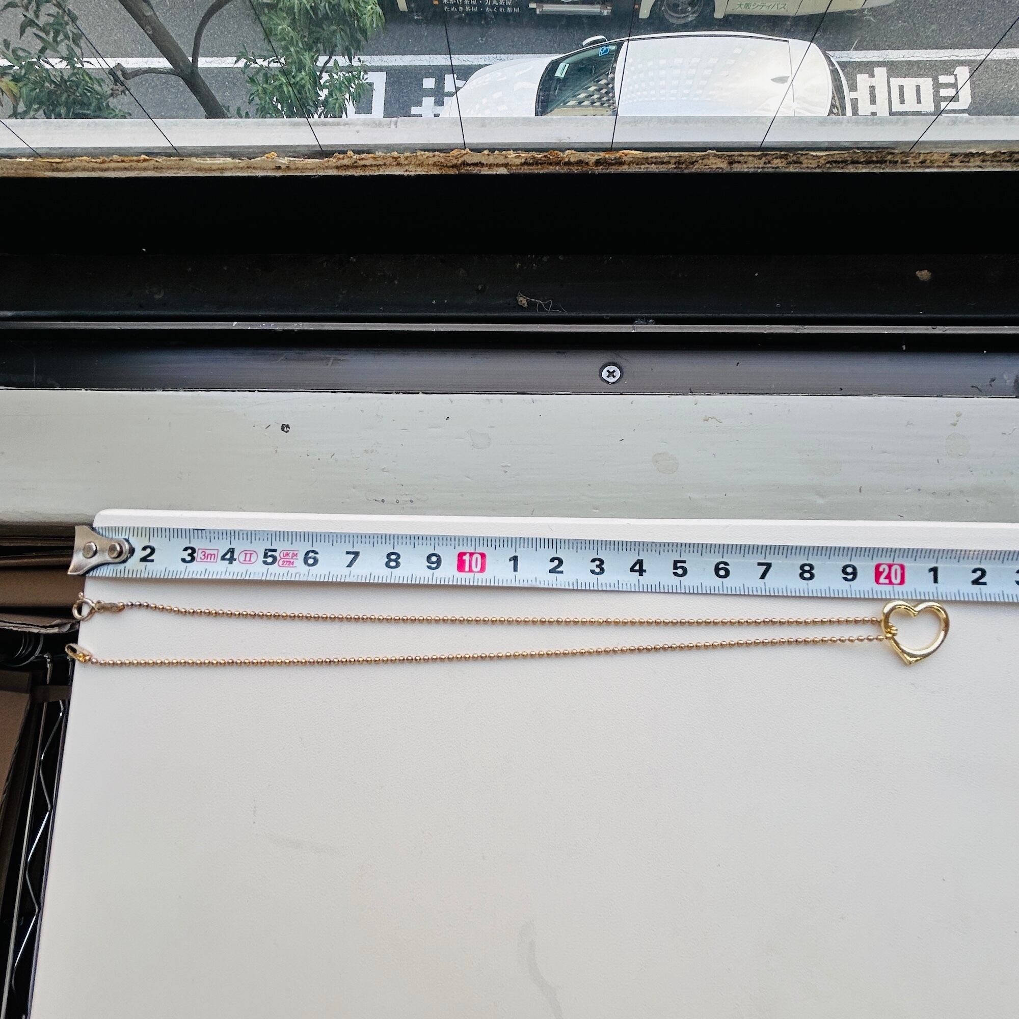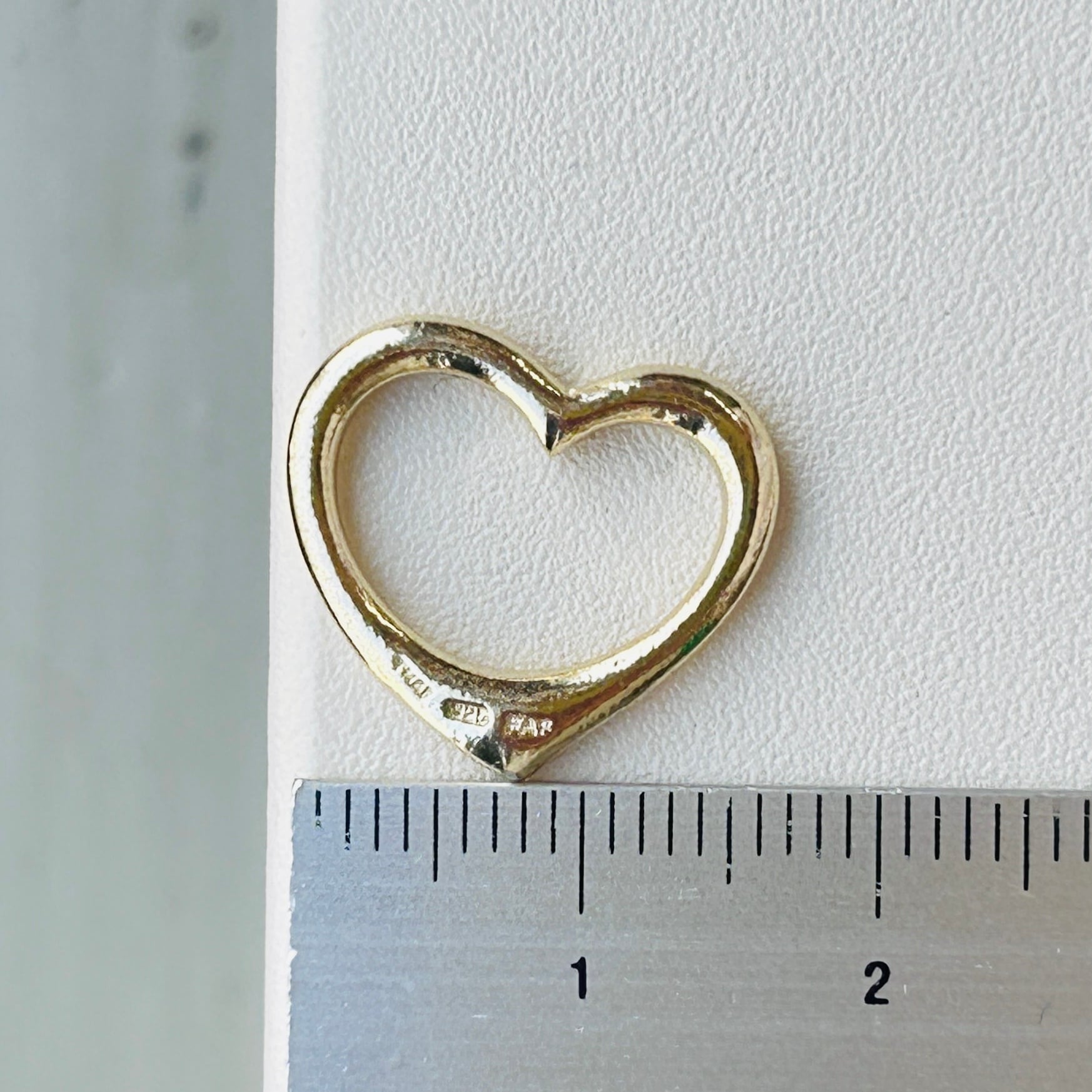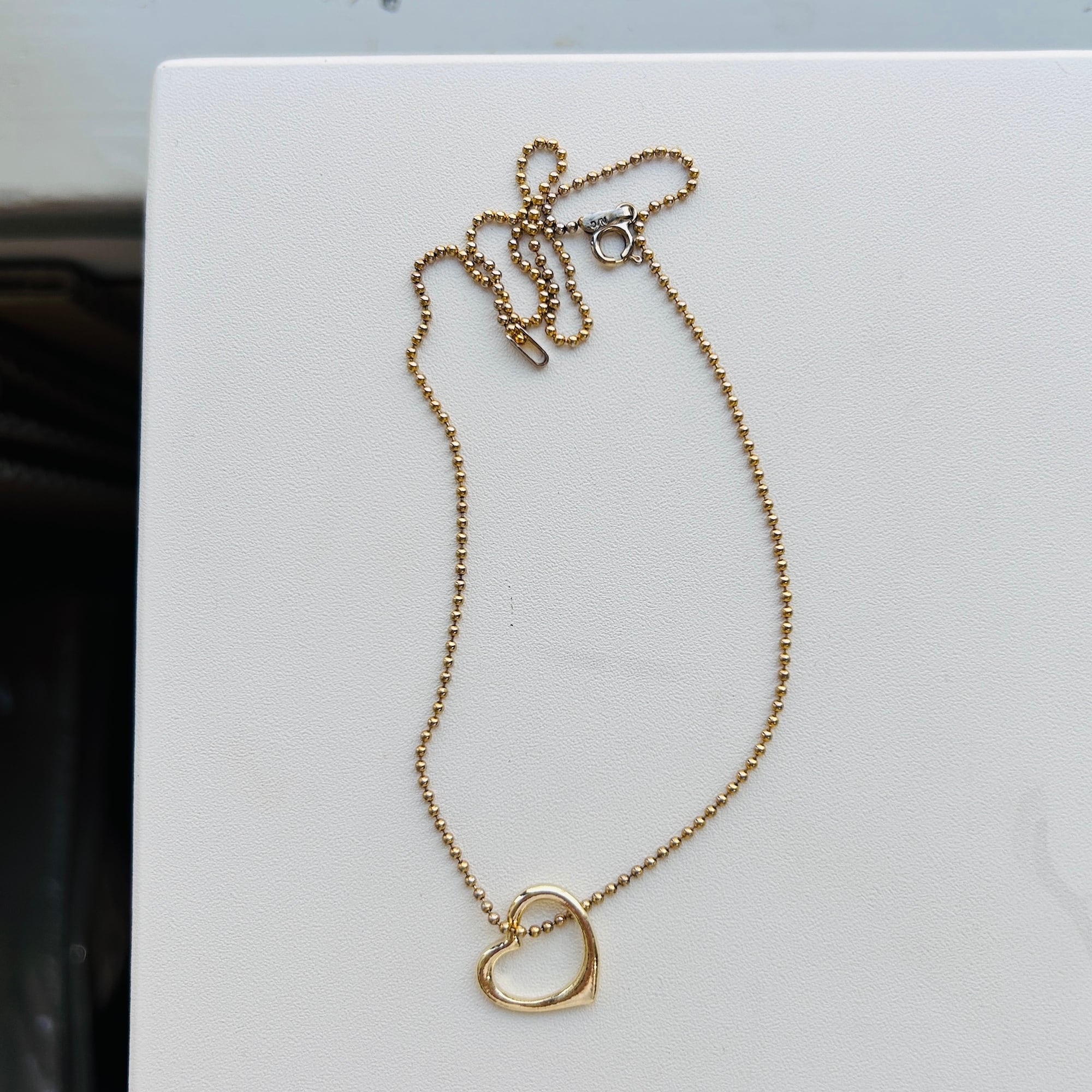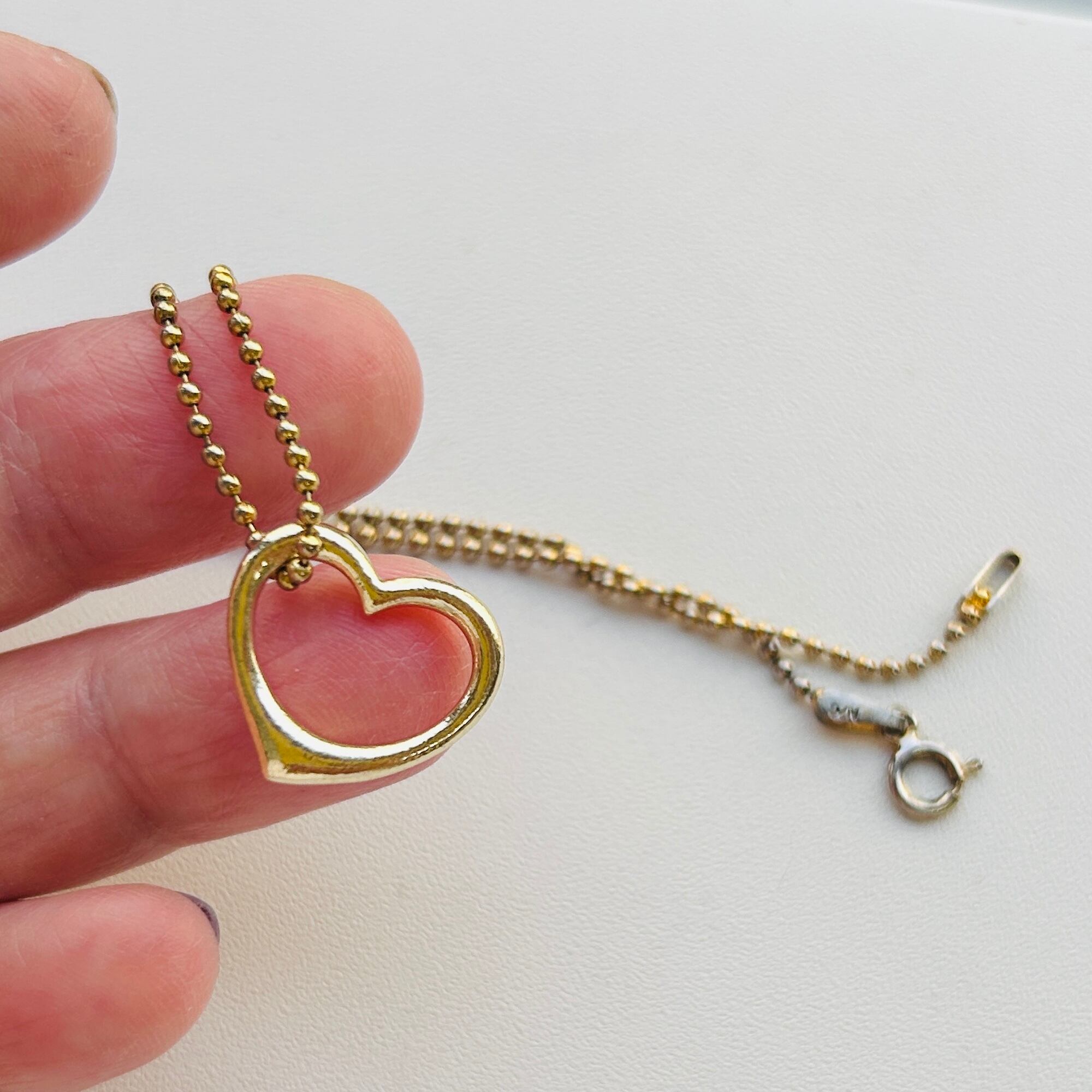 アウトラインハートのネックレス。金色の短いハートネックレス。ガーリィで可愛いです。極小ボールチェーンは華奢でデリケートです。金具周りの金メッキがハゲていてややUSED感ございます。アウトラインハートの色味はやや薄い金色です。チェーンに「925」、ハートに「925」「THAI」メーカー名。