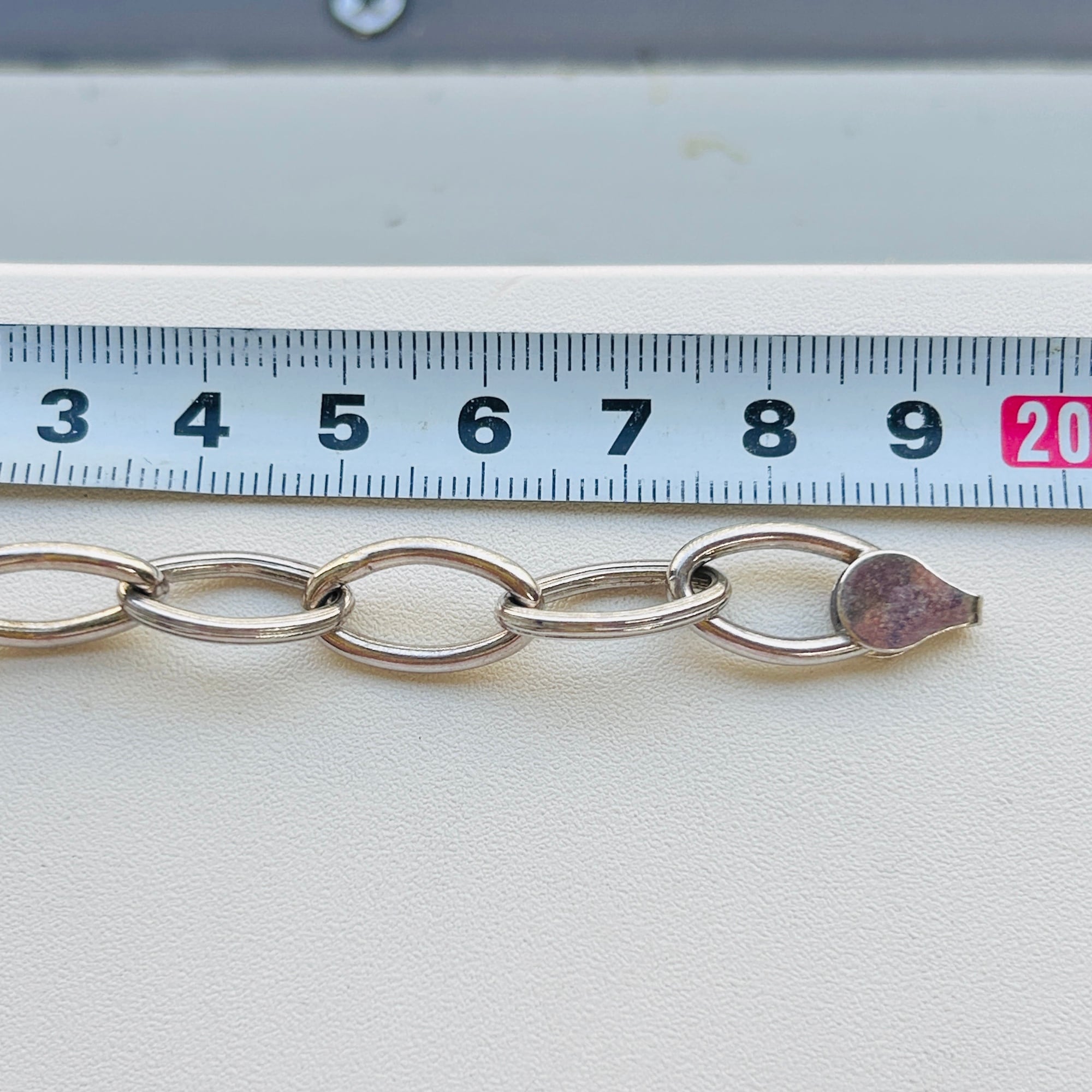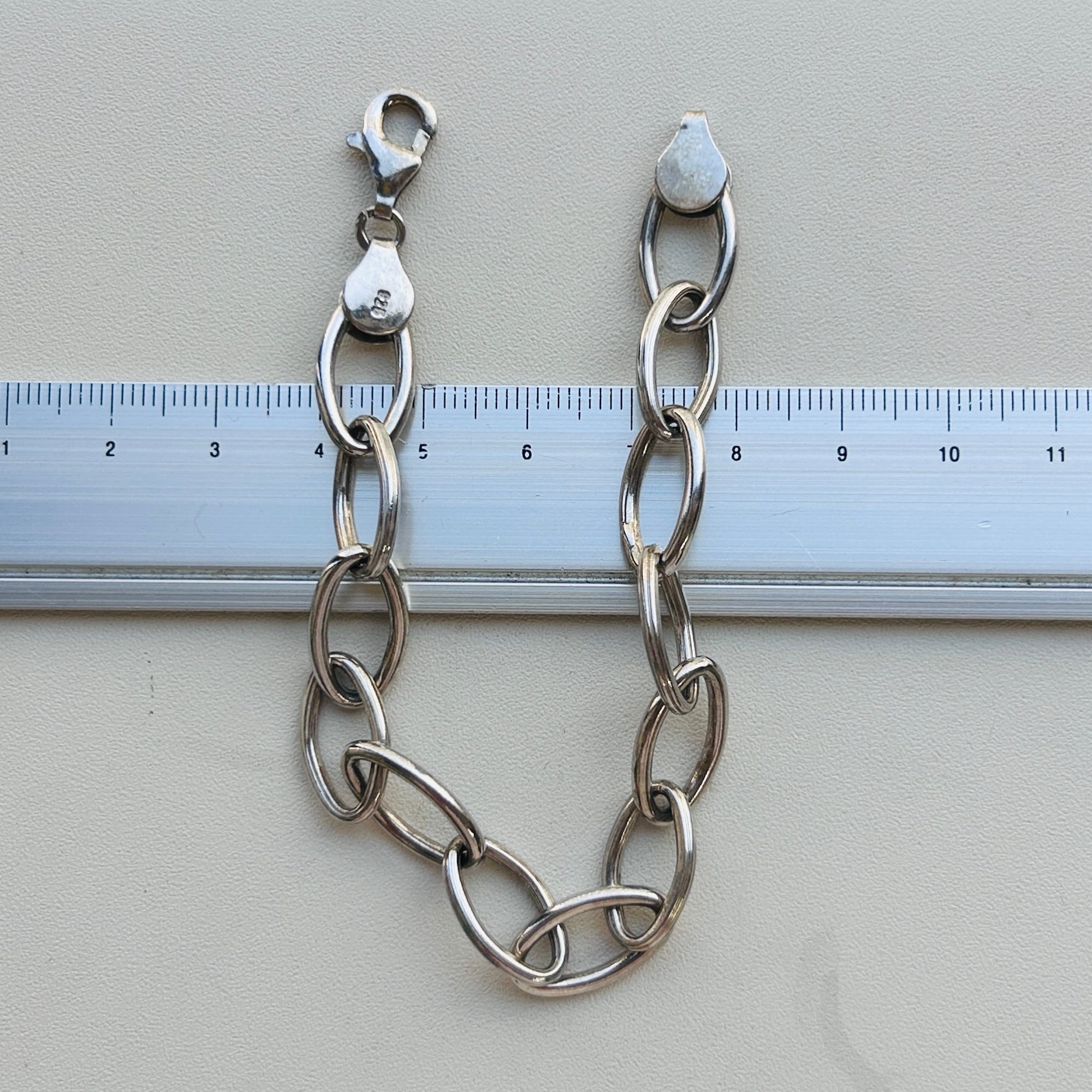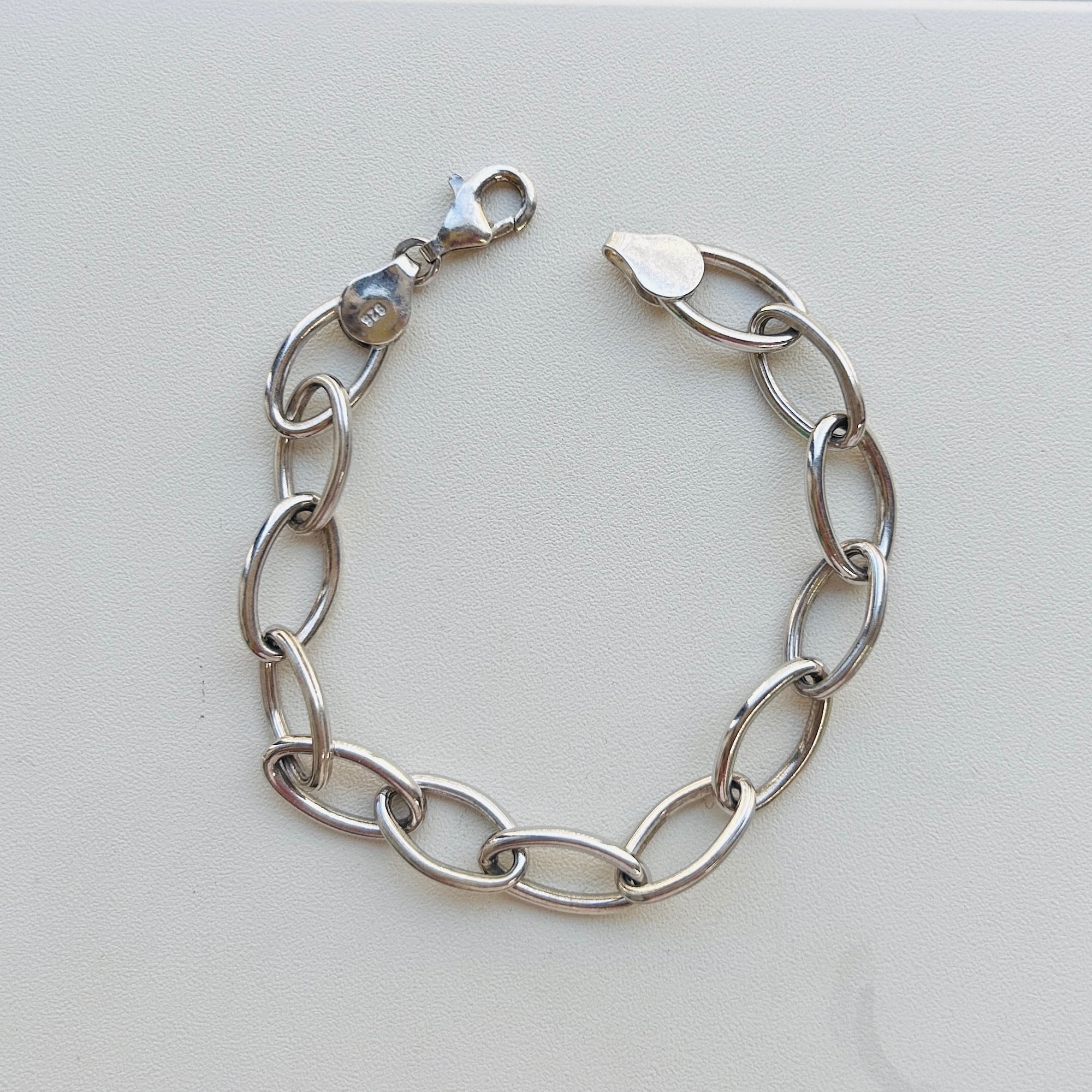 スッキリ楕円型シャイニーな中空チェーンブレスレット。軽くて着けやすい、機能的でスタイリッシュなブレスレットです。大きめのカニ留め具は扱いやすいですが、楕円コマに引っ掛けることは出来ません。着用感は実寸より短く感じます。留め具に「925」。