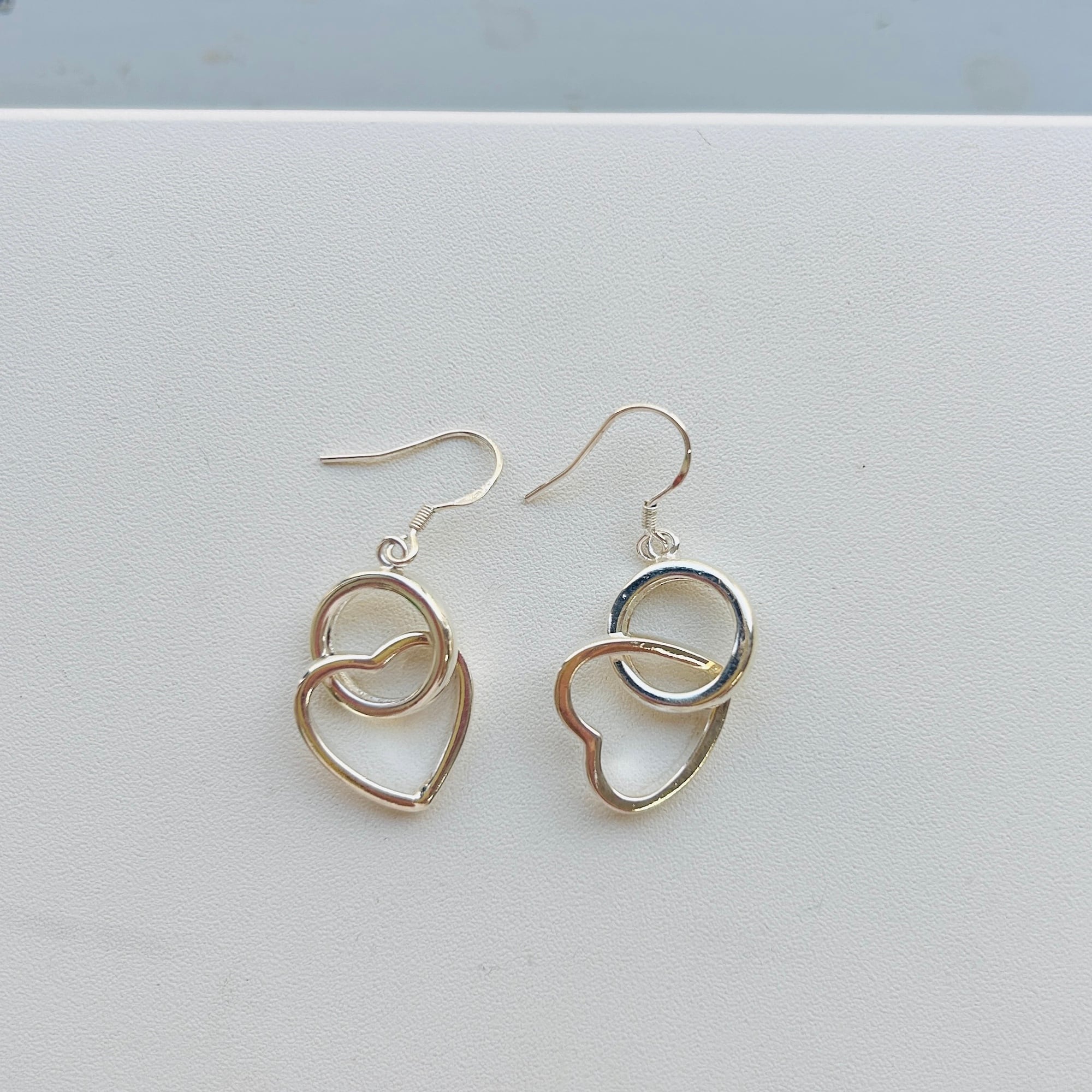 フランスから届いたシルバーピアス。丸とハートチャームが揺れるキュートなデザイン。チャームのアウトラインが太めでしっかりした作り。チャームがくっきりと見えて可愛いです。光沢あるシルバー。針に「925」刻印。