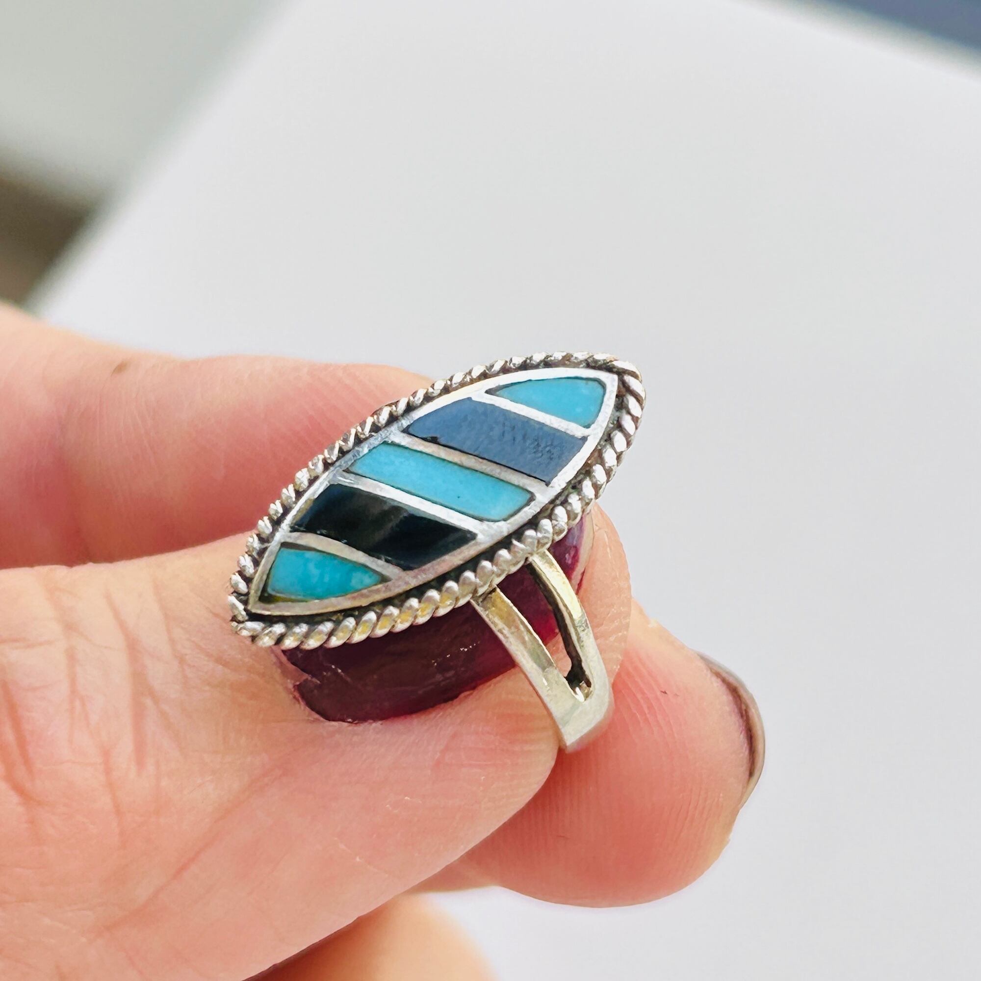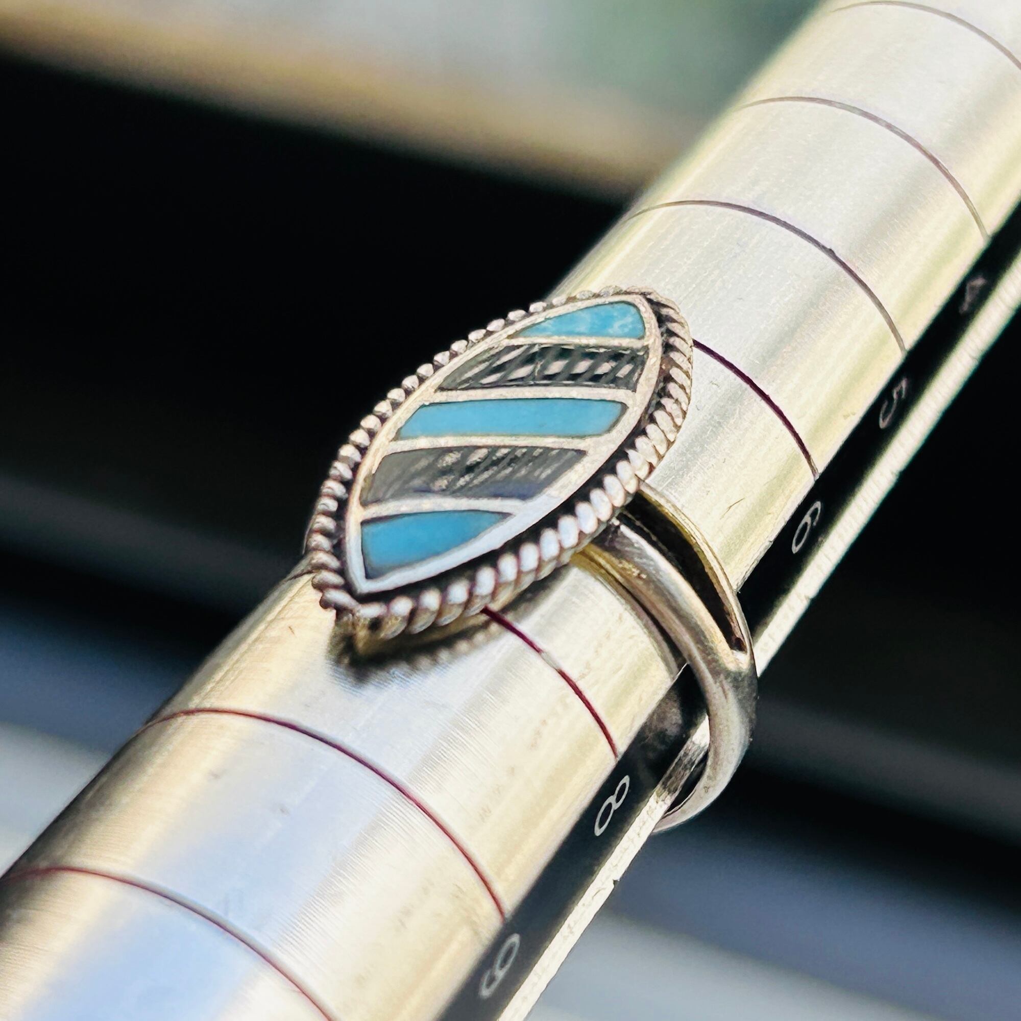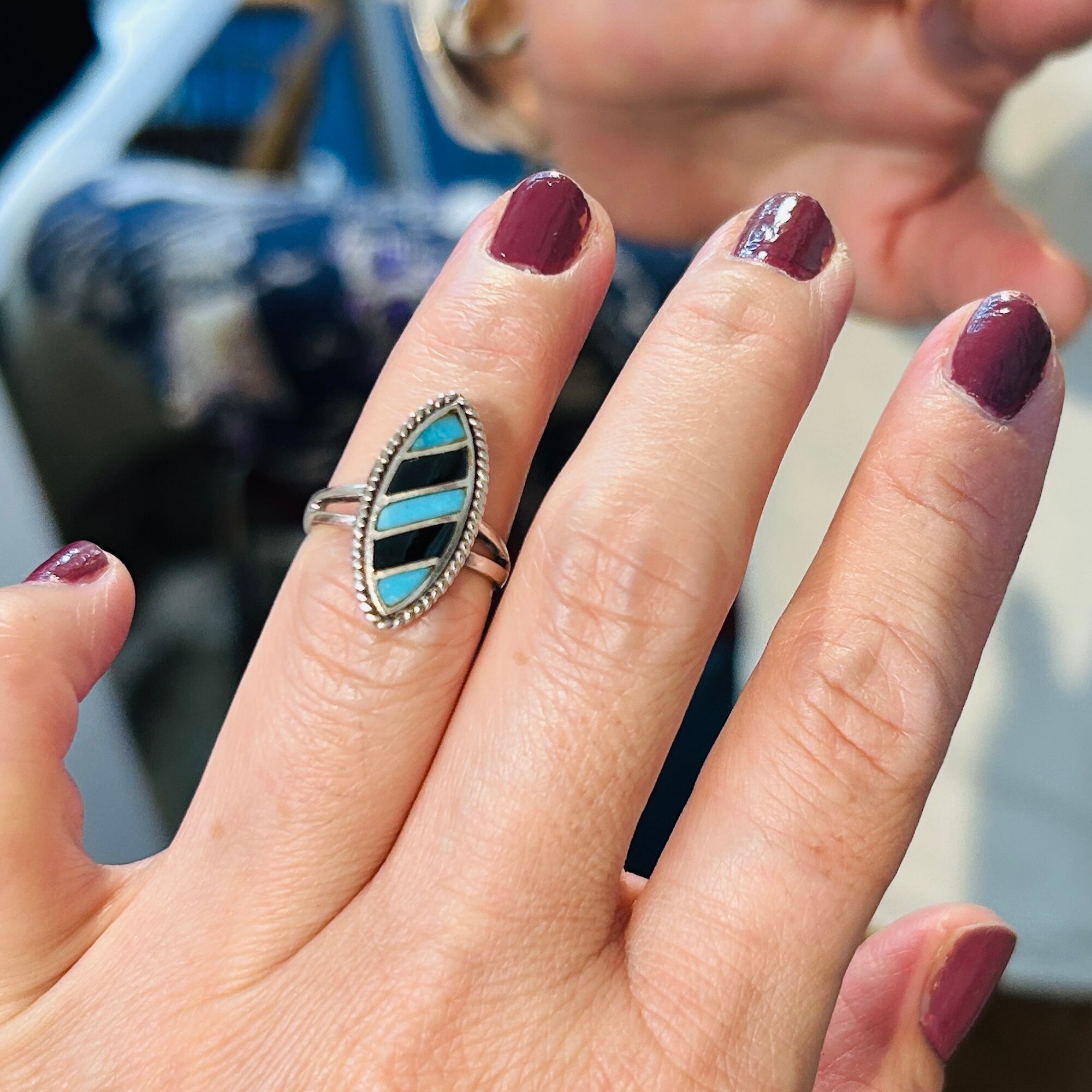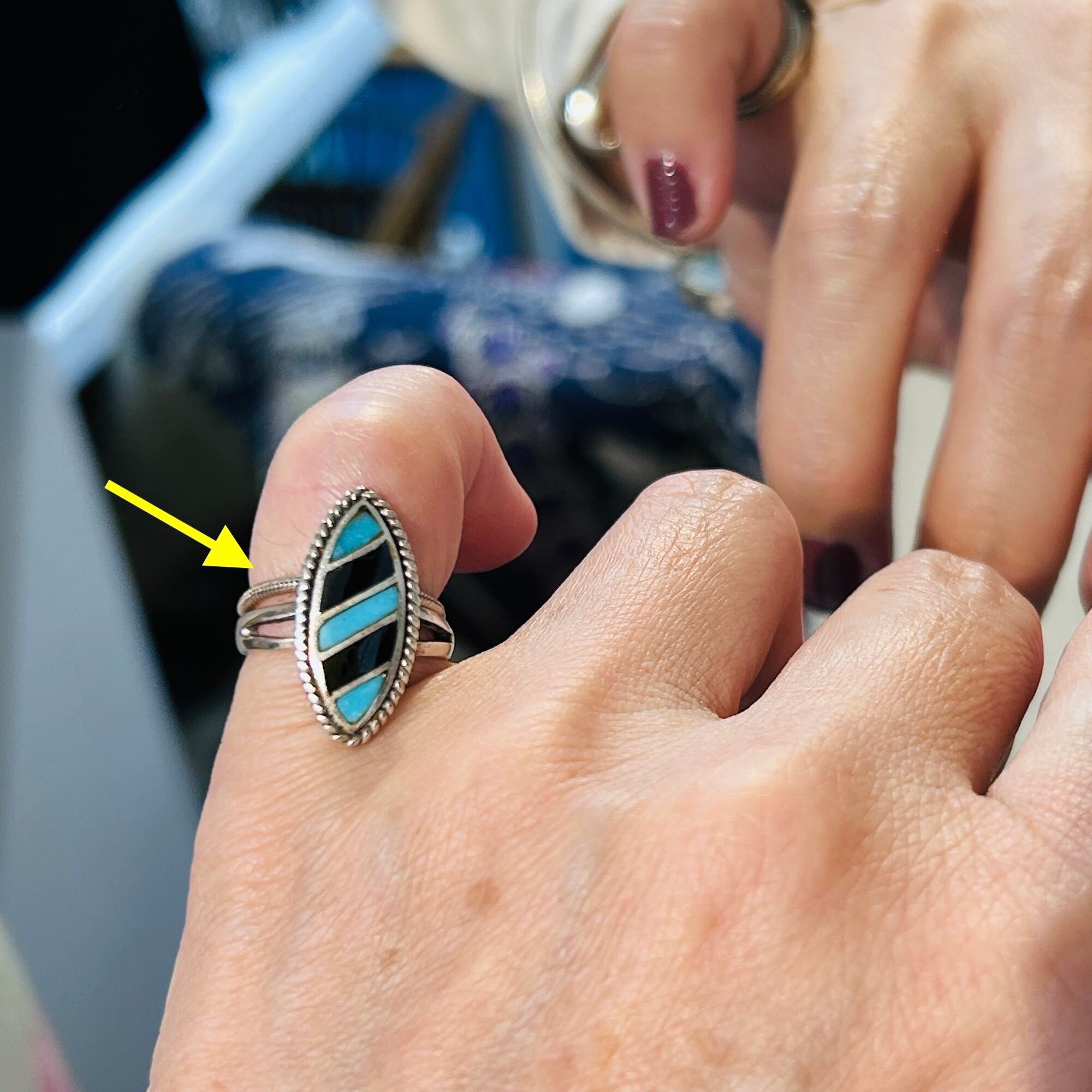 フランスから届いた7号サイズのシルバーリング。オニキスとターコイズのボーダー柄です。ヴィンテージらしい素朴な作りで可愛いです。7号サイズは私のどの指にもフィットしませんが写真14・15のように4号のピンキーリングを重ねると動くことなく着用できます。ストーンに小さなカケのあるヴィンテージコンディションです。