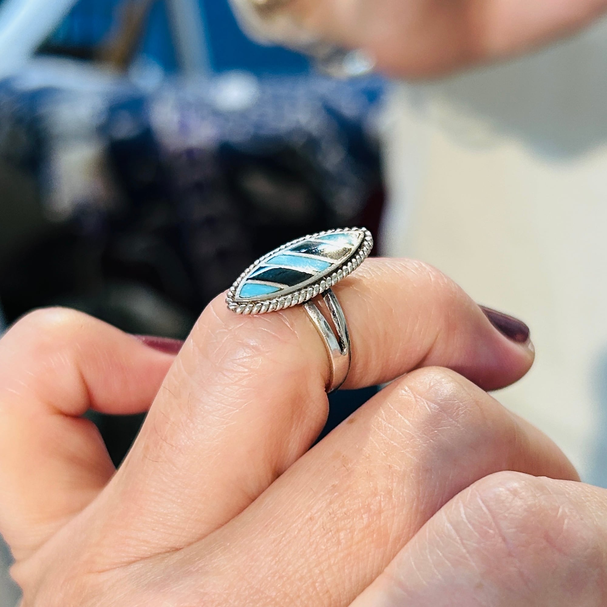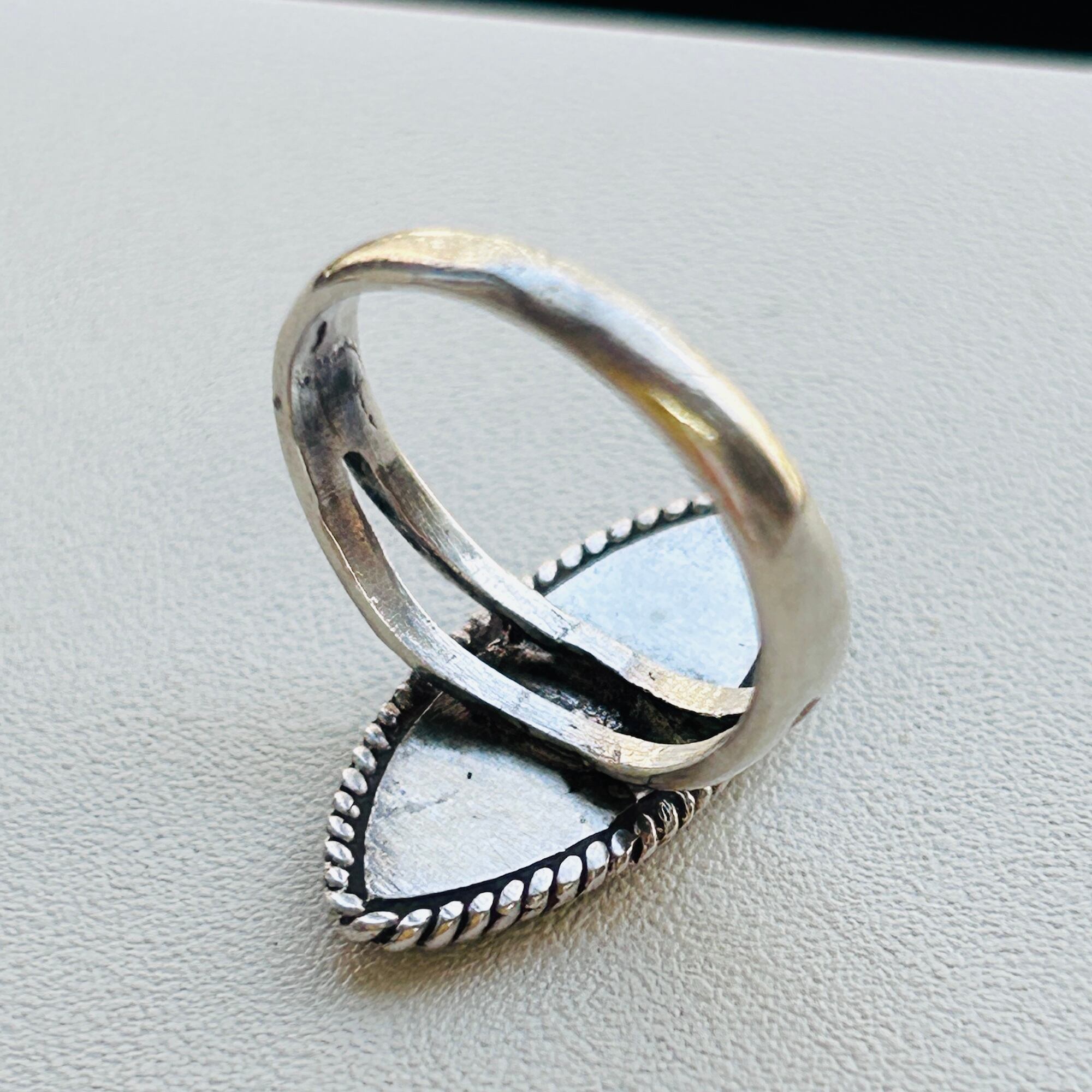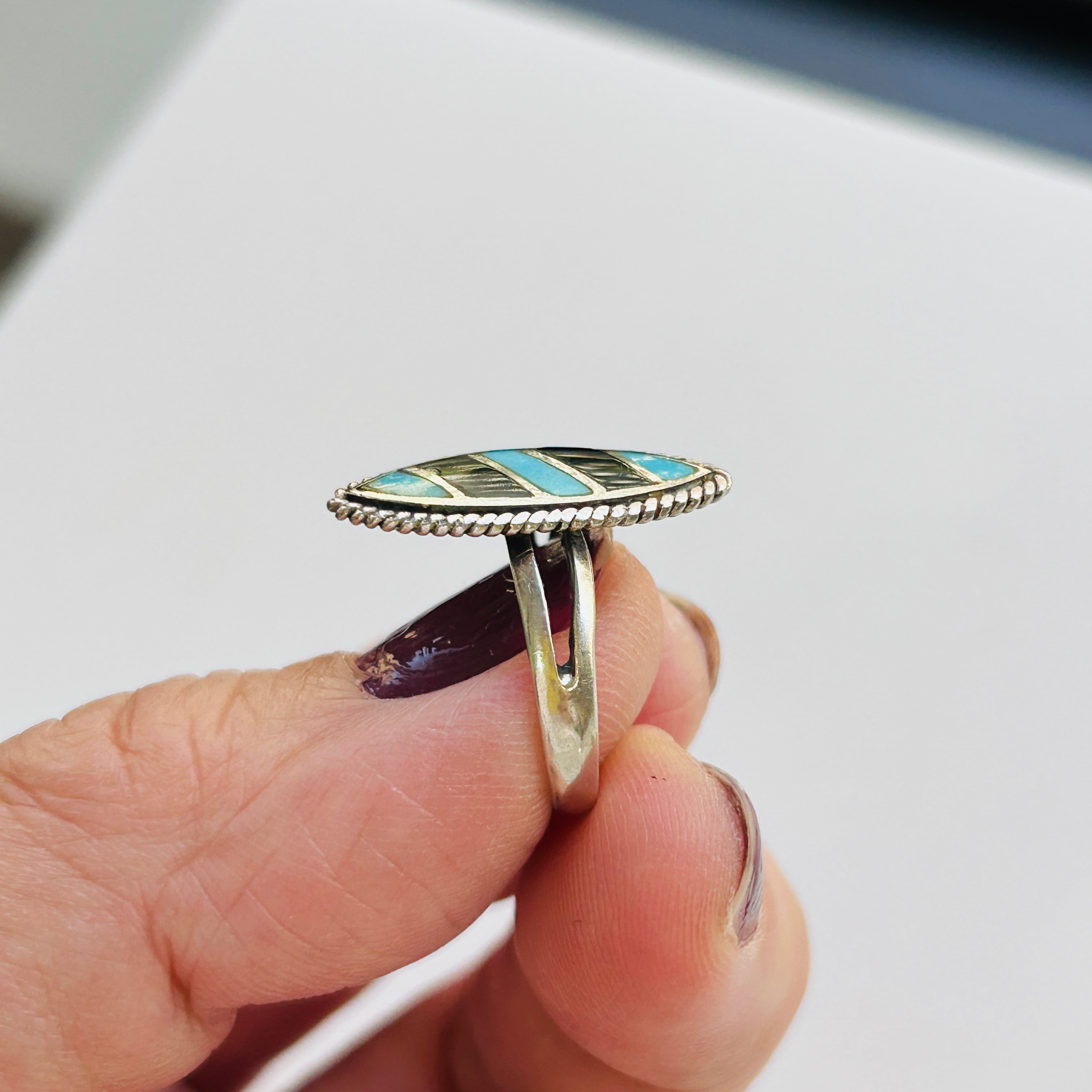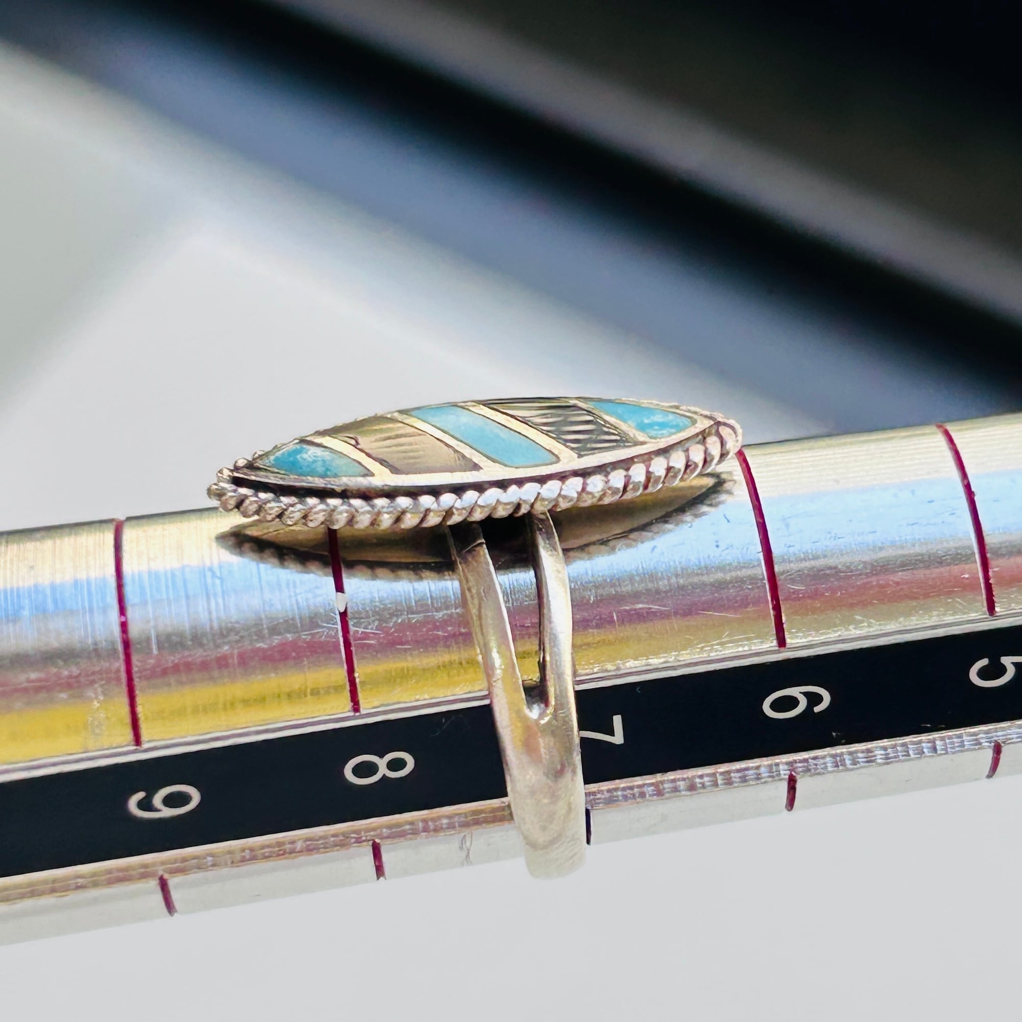 フランスから届いた7号サイズのシルバーリング。オニキスとターコイズのボーダー柄です。ヴィンテージらしい素朴な作りで可愛いです。7号サイズは私のどの指にもフィットしませんが写真14・15のように4号のピンキーリングを重ねると動くことなく着用できます。ストーンに小さなカケのあるヴィンテージコンディションです。
