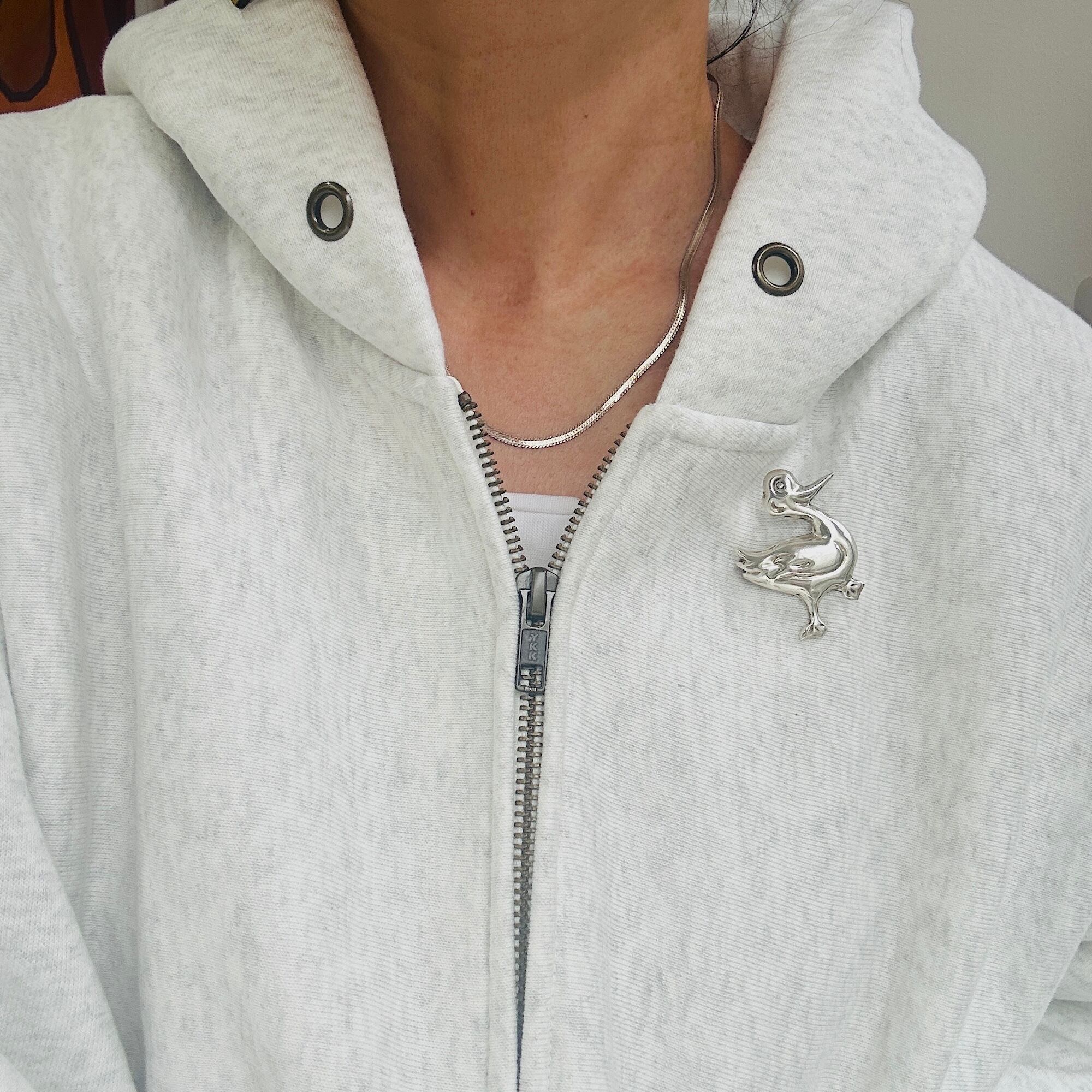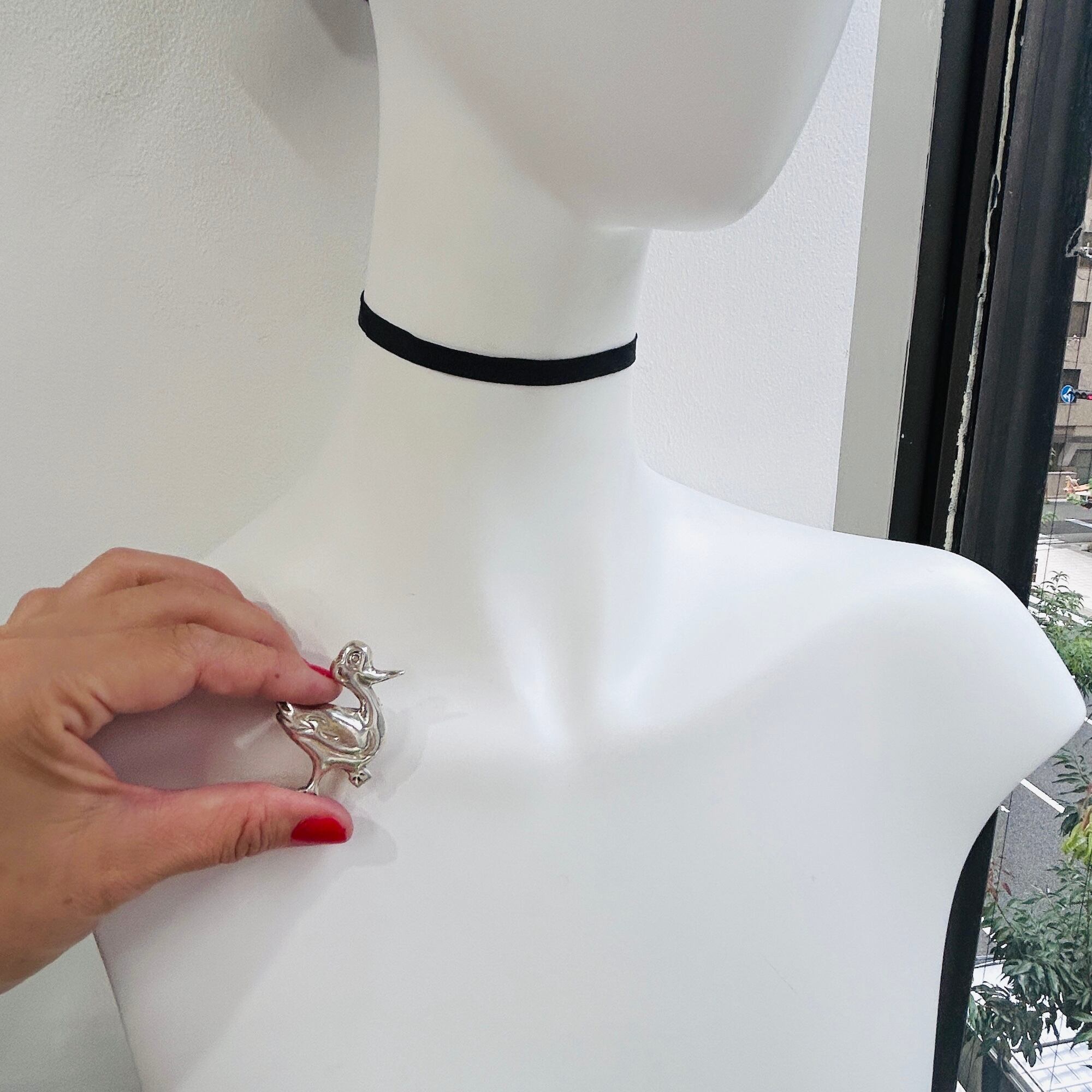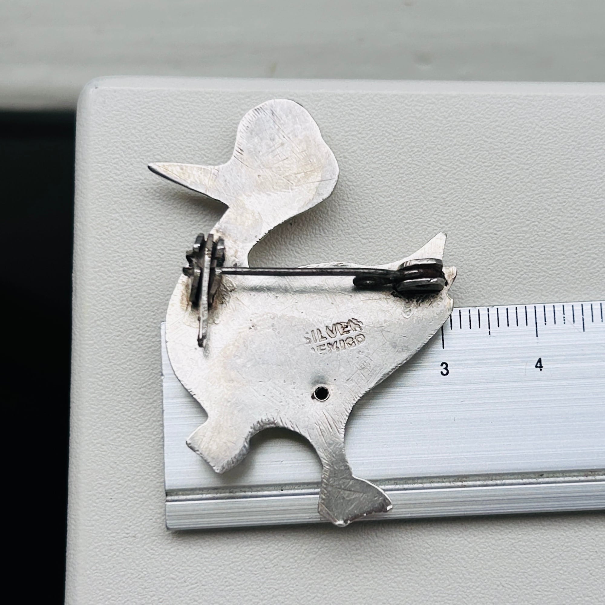 ユニークなダックブローチ。ぷっくり膨らんだボディでヨチヨチ歩いているような形です。裏に丸穴が空いていて中空の作りです。刻印は「SILVER MEXICO」、イーグルマークより前、1946年以前の古いメキシカンシルバーです。風車金具も変わっています。使用に問題ありません。