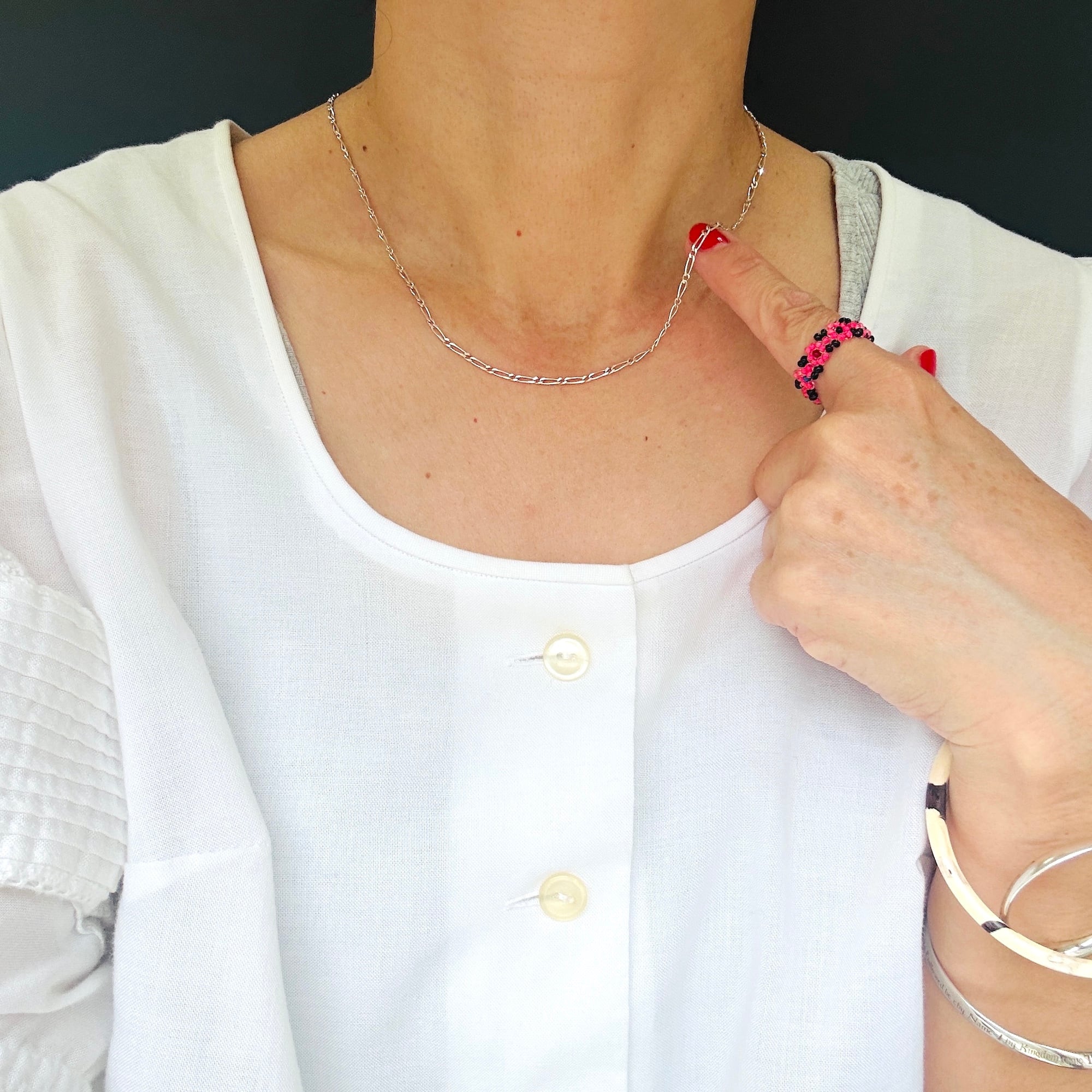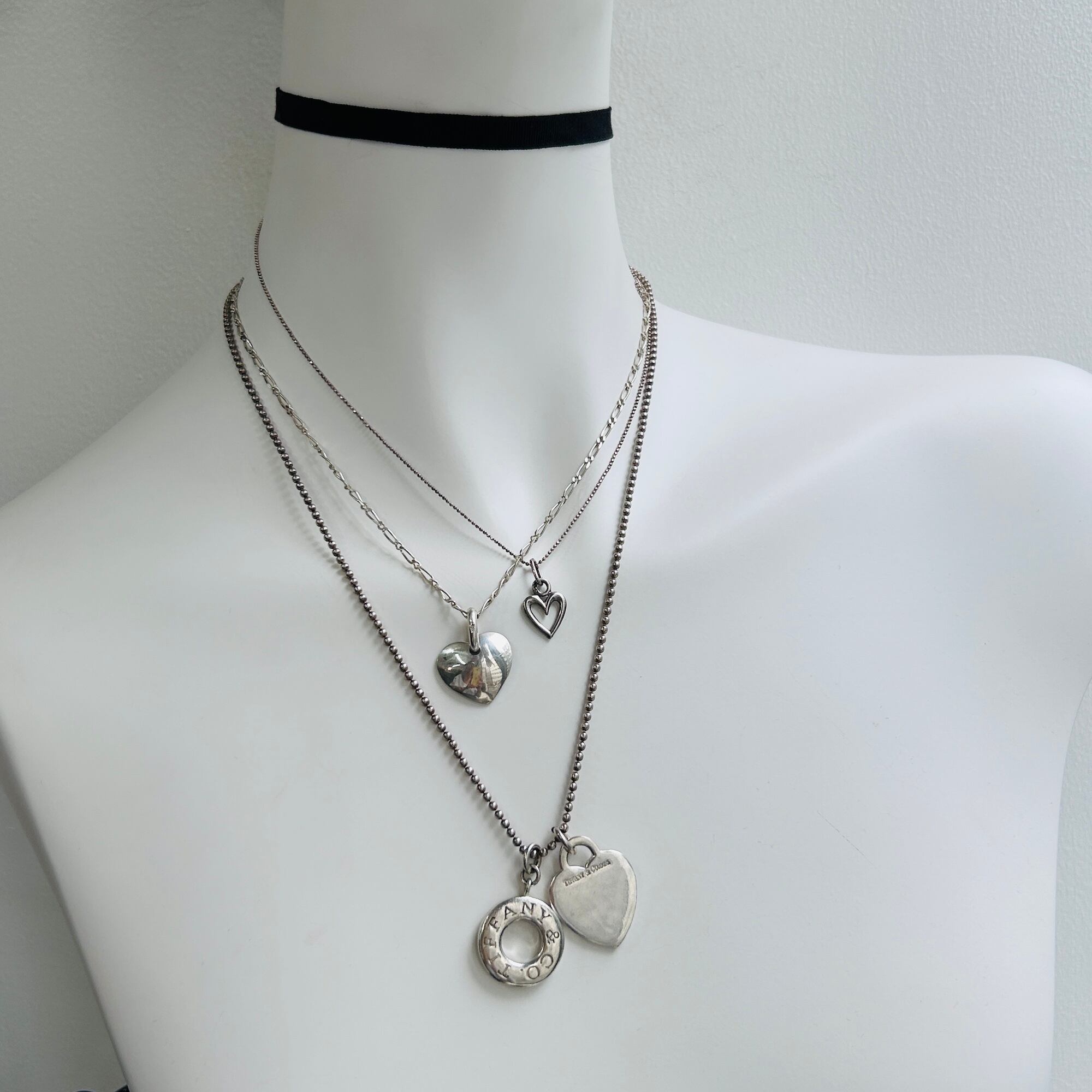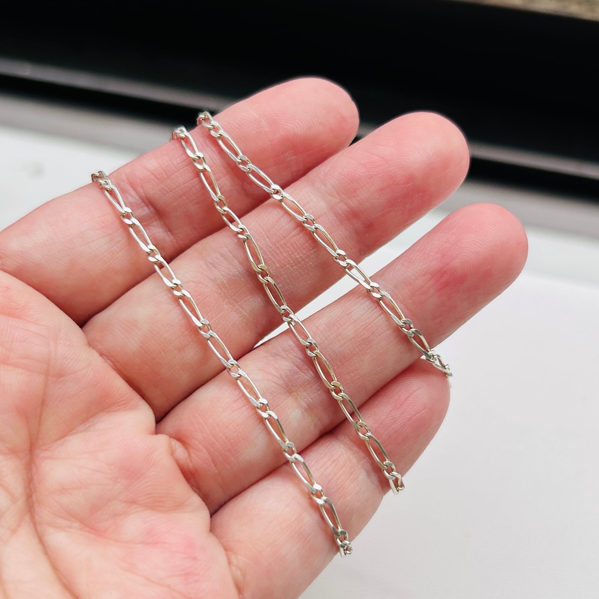 幅2mm、エレガントなフィガロチェーンネックレス。縦長1とスクエア1のちょっと変わったデザインです。単体でも素敵ですし、チャームとの相性もよいです。引き輪の開口が狭いのできっちり的を定めて引っ掛ける必要があります。「925」とフランスメーカーマーク。