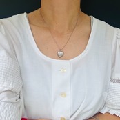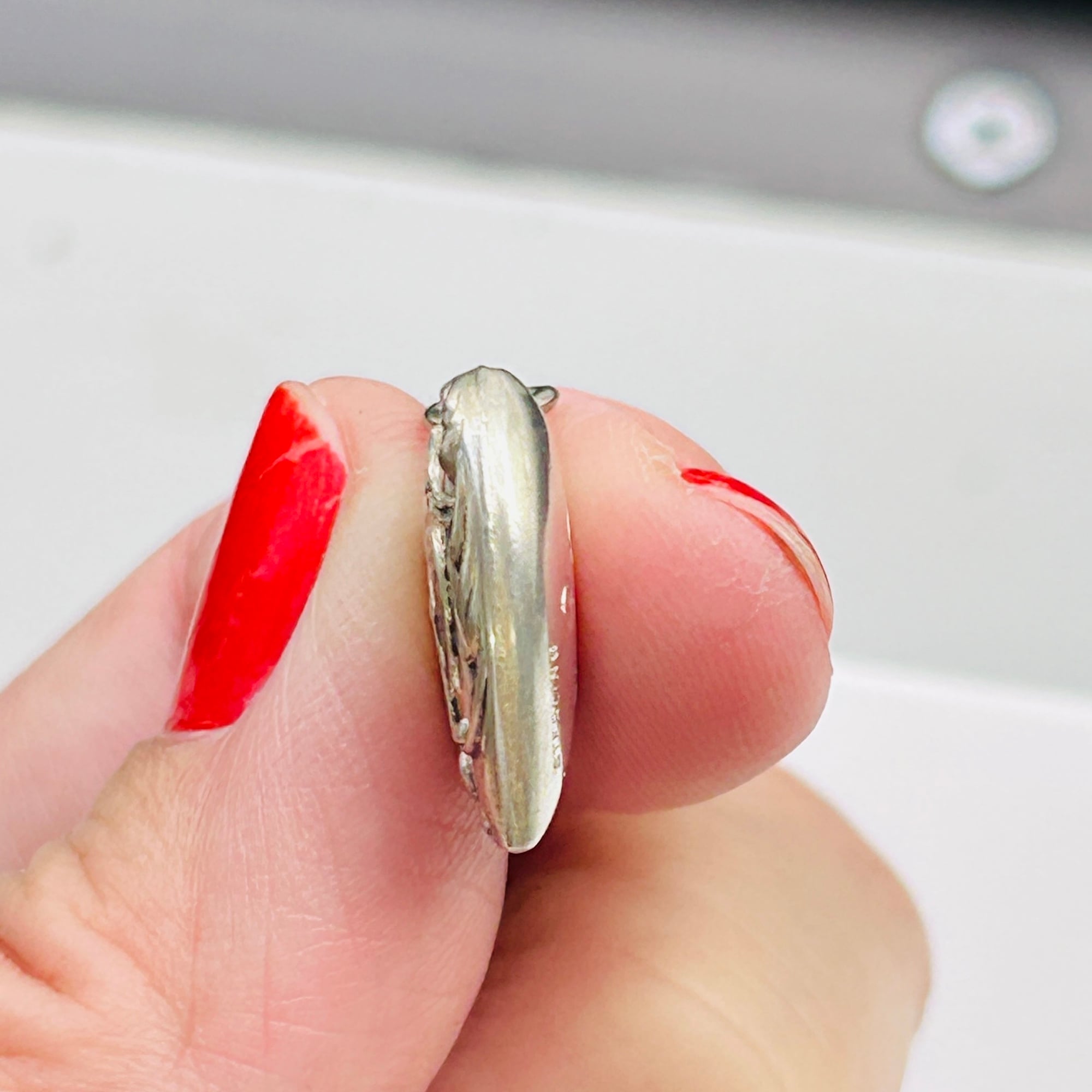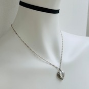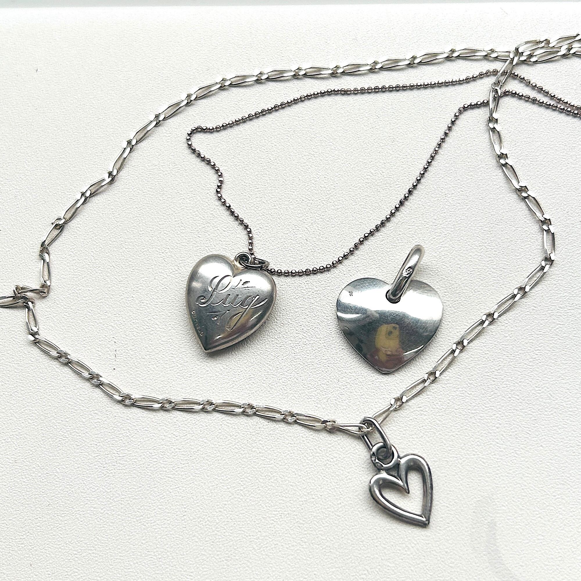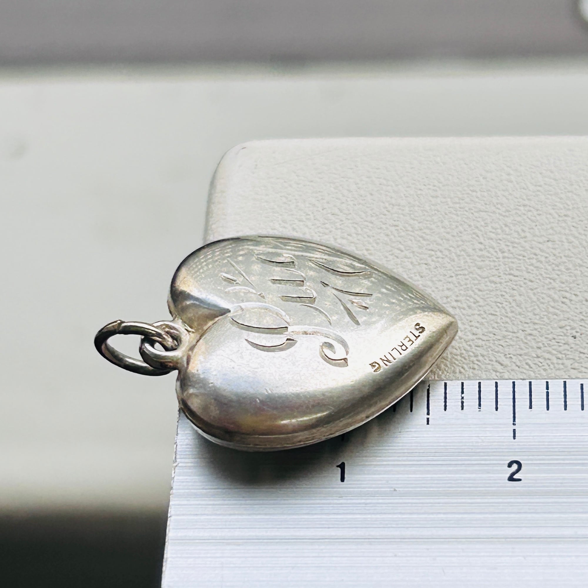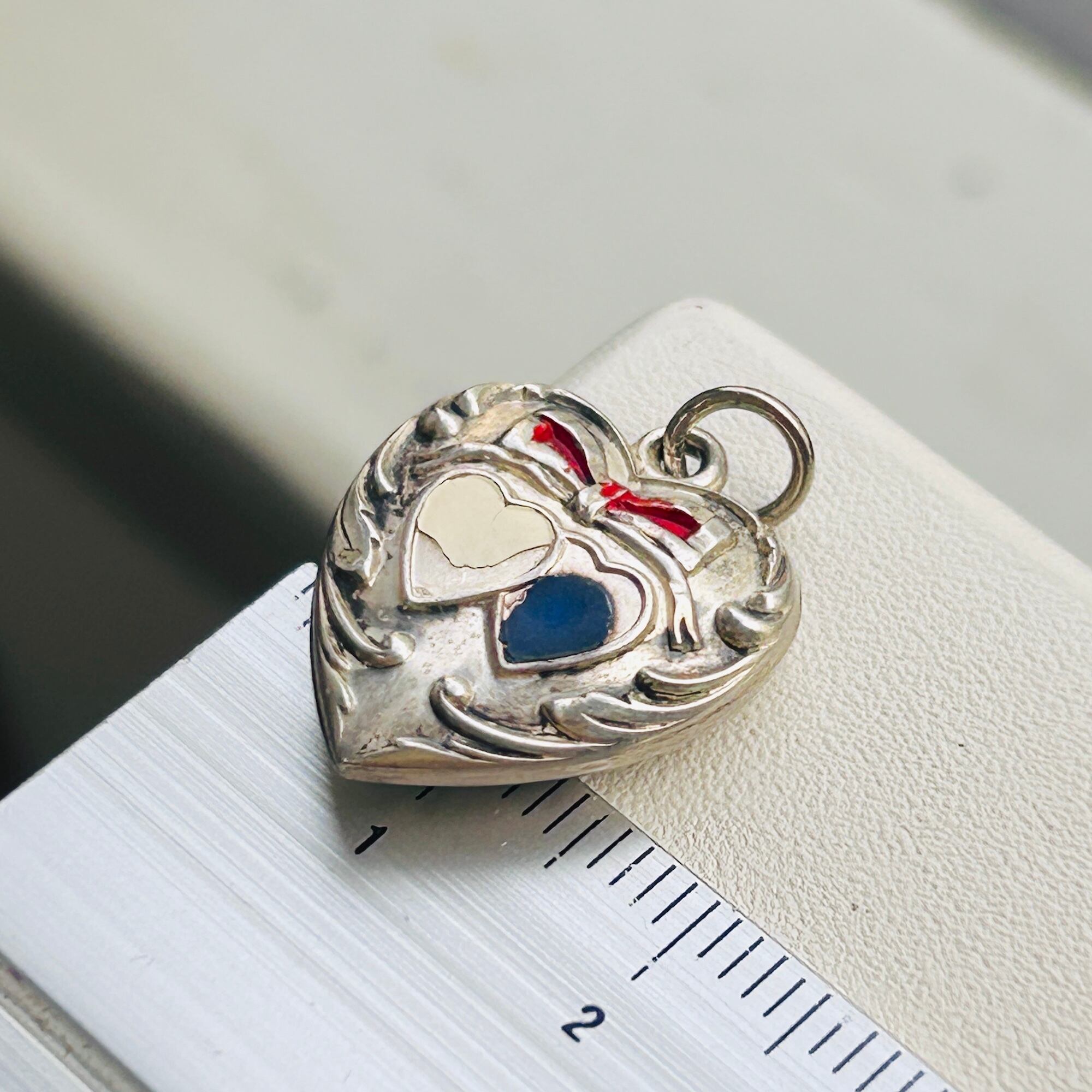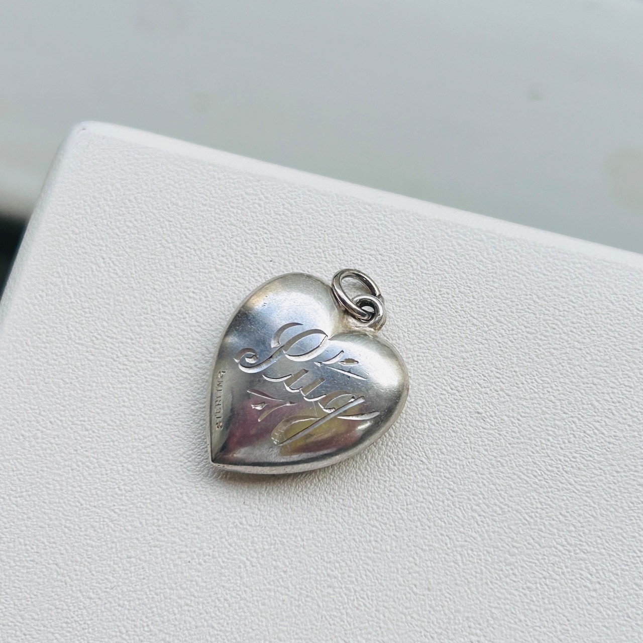 第二次世界大戦期のシルバーハートチャーム。エンボス模様にはエナメルが残っています。エナメルが取れたら是非磨いてみて下さい。渋くていいエンボスハートになります。片側は女性の名前「LUCY」の彫り。磨くと渋みのあるいいツヤが出てくるシルバーです。LUCYの下に「STERLING」刻印。丸カン内径約4mm x 3.5mmです。