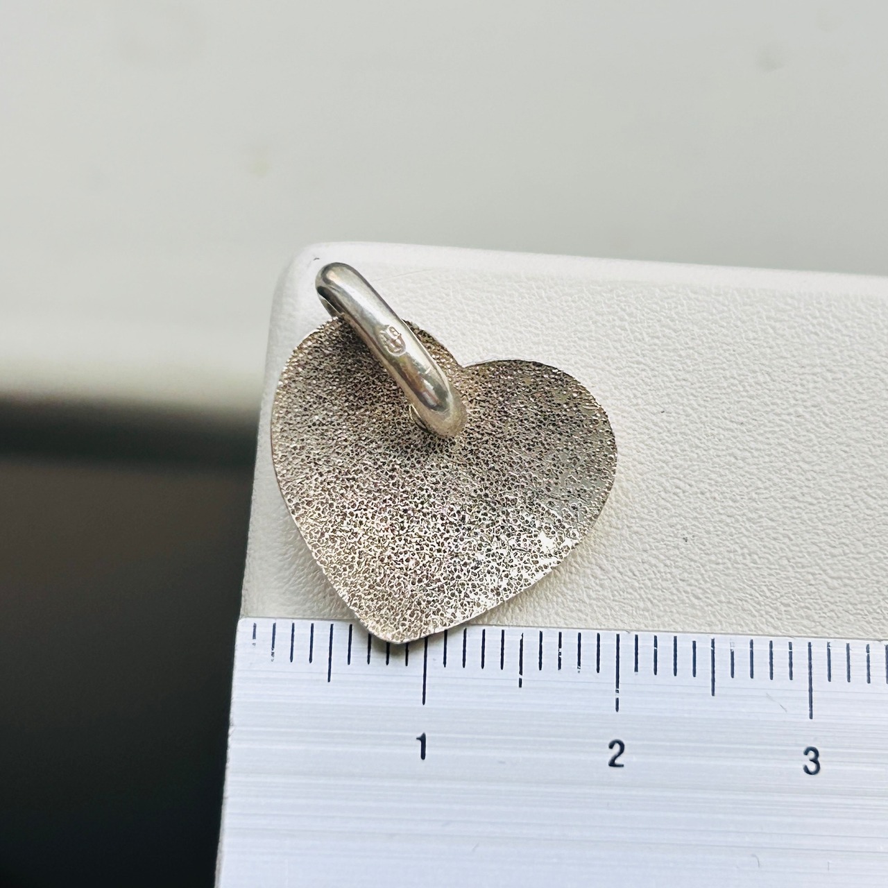 フランスから届いたプレーンなシルバーハートチャーム。丸っこいユルいハートは少し膨らみある形。ベイルは太くてチャンキー。ハートとベイルのバランスがいい感じです。ハートもベイルも厚みのある丈夫な作り。楕円コマの前面・後ろ面に「ITALY925」とメーカー刻印があります。ハートの左肩当たり、小さくて薄い斑点があります。磨いても取れませんでした。ベイルスペースは6mm x 4mmくらい。大抵のチェーンが通ると思います。