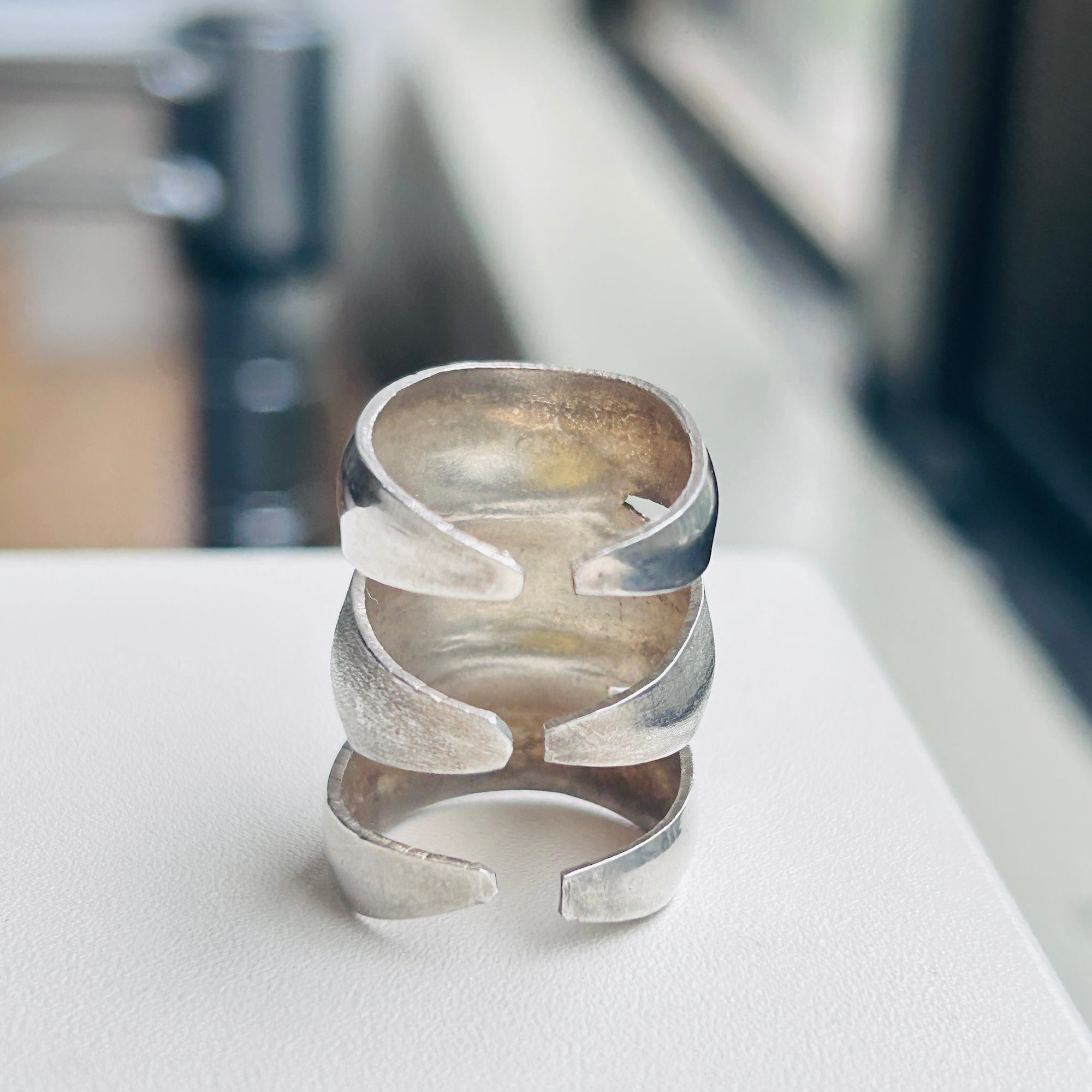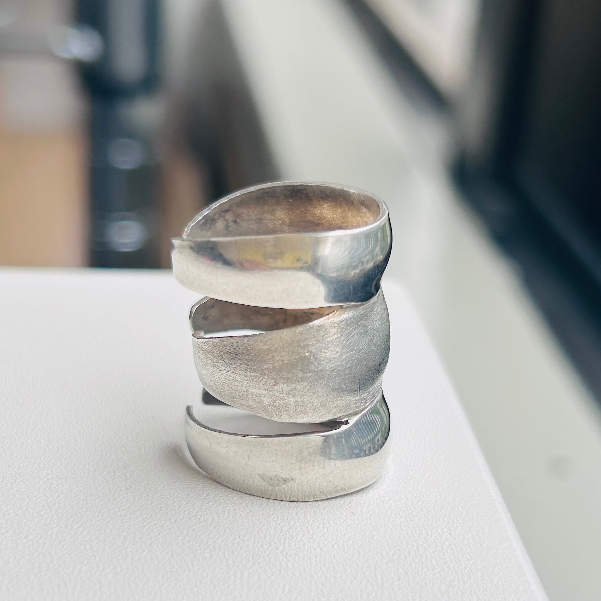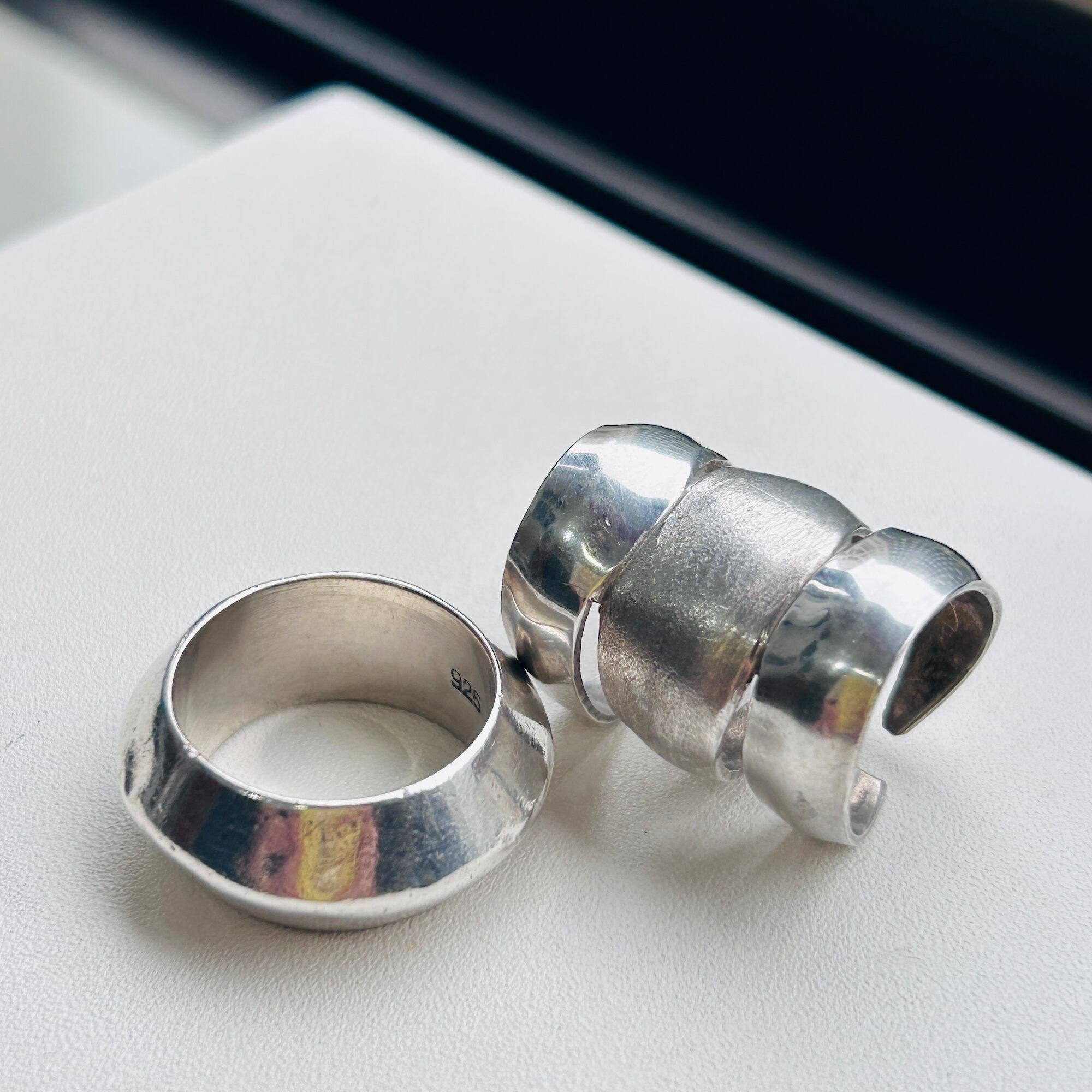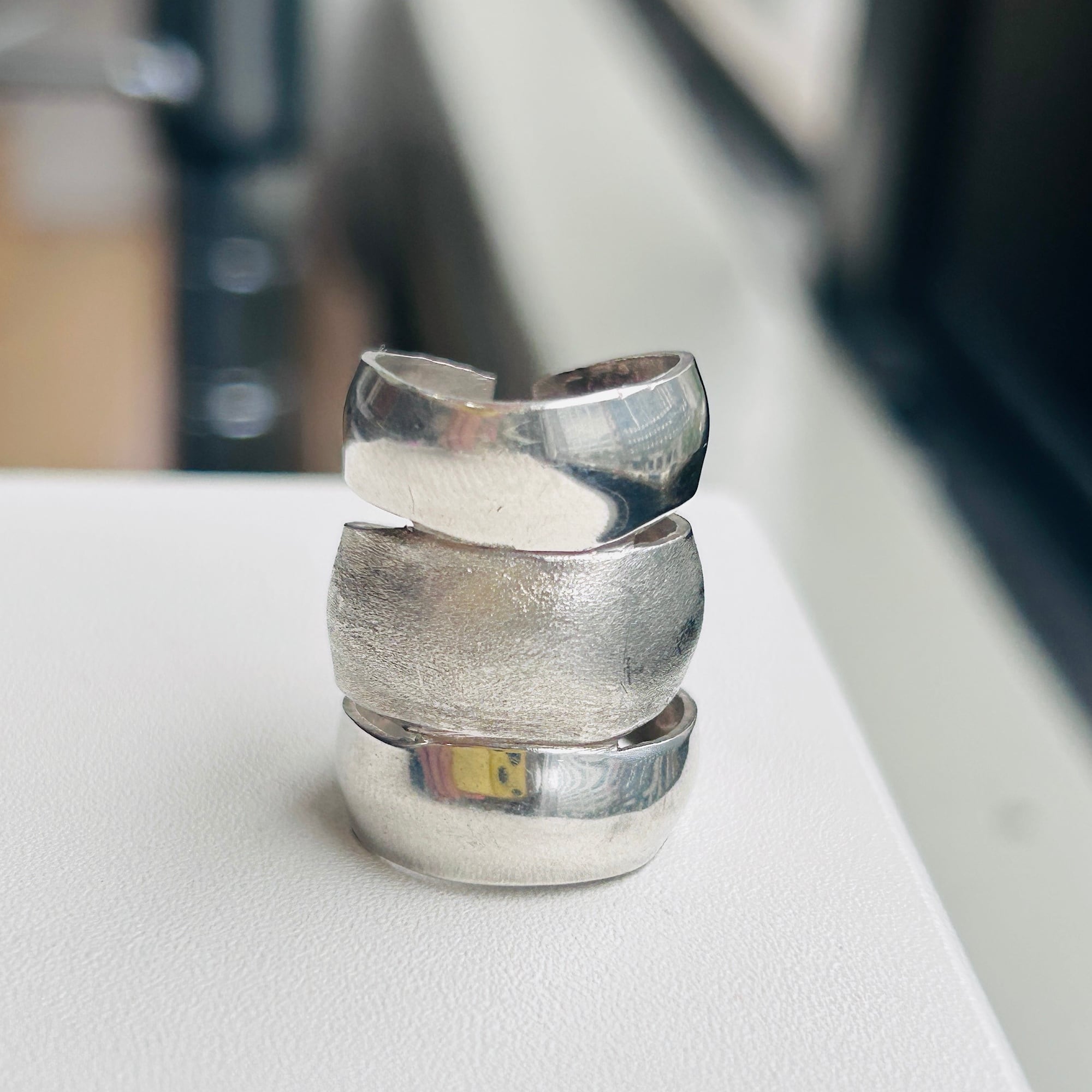 無名のハンドメイドシルバーリング。3つのリングがくっついたような個性的なデザインです。上下はツヤのあるプレーン、真ん中は細かいザラっとしたテキスチャーです。ちょうど間接1つ分くらいの幅です。着けると少々指を曲げ辛くなりますが仕方ありません。アジャスタブル面も上に向けて着けるのもオモシロイです。こちらのリングは歪んでいたり、均一に整った形ではありません。リングのエッジもややシャープ。素人ぽさのあるワイルドな作りですがオモシロイです。刻印はありませんがシルバー925です。私は普段9〜10号の薬指に着用できます。アジャスタブル仕様ですのでバンドを広げてサイズアップも可能です(自己責任でお願いします)。切れ目の根本からゆっくり広げるようにして下さい。