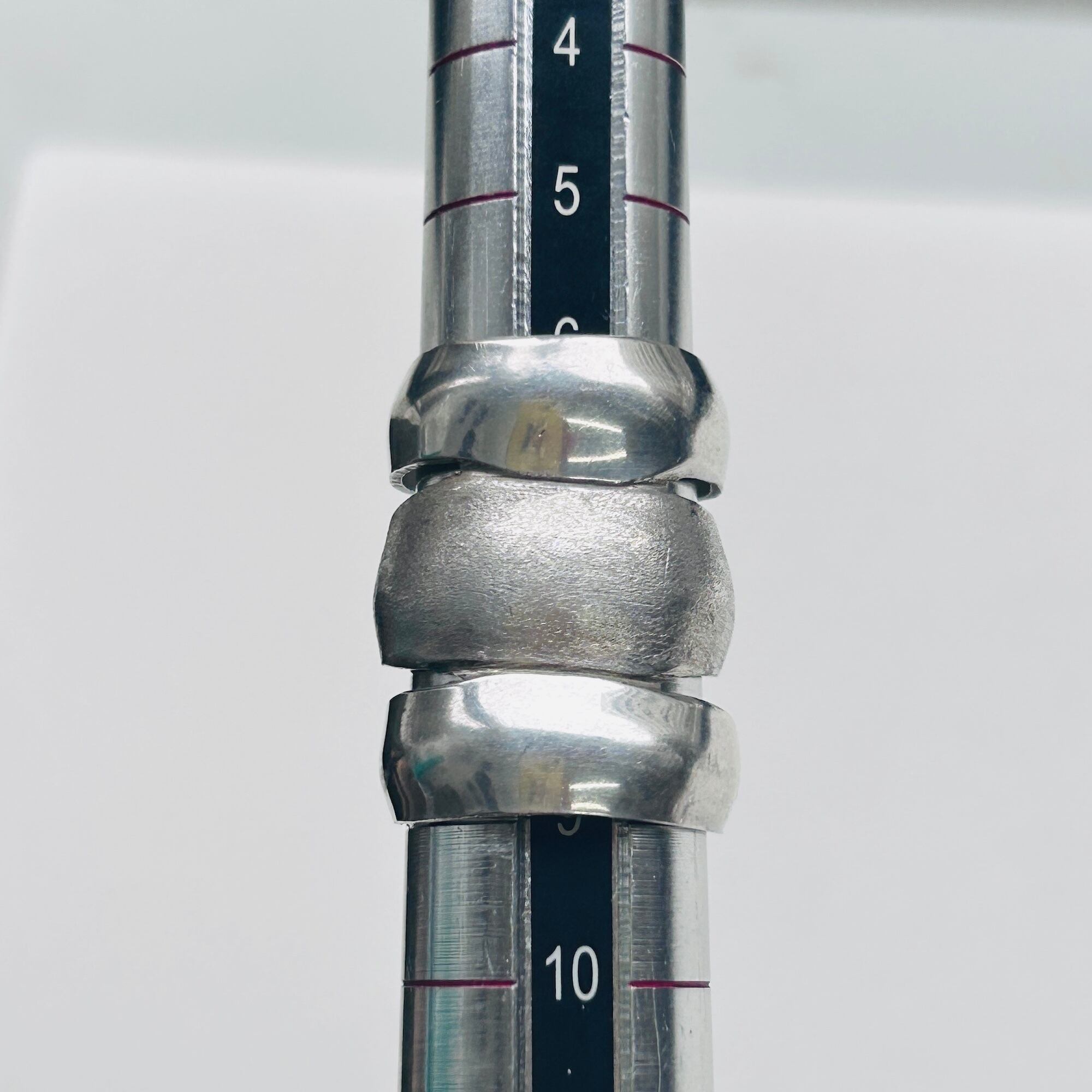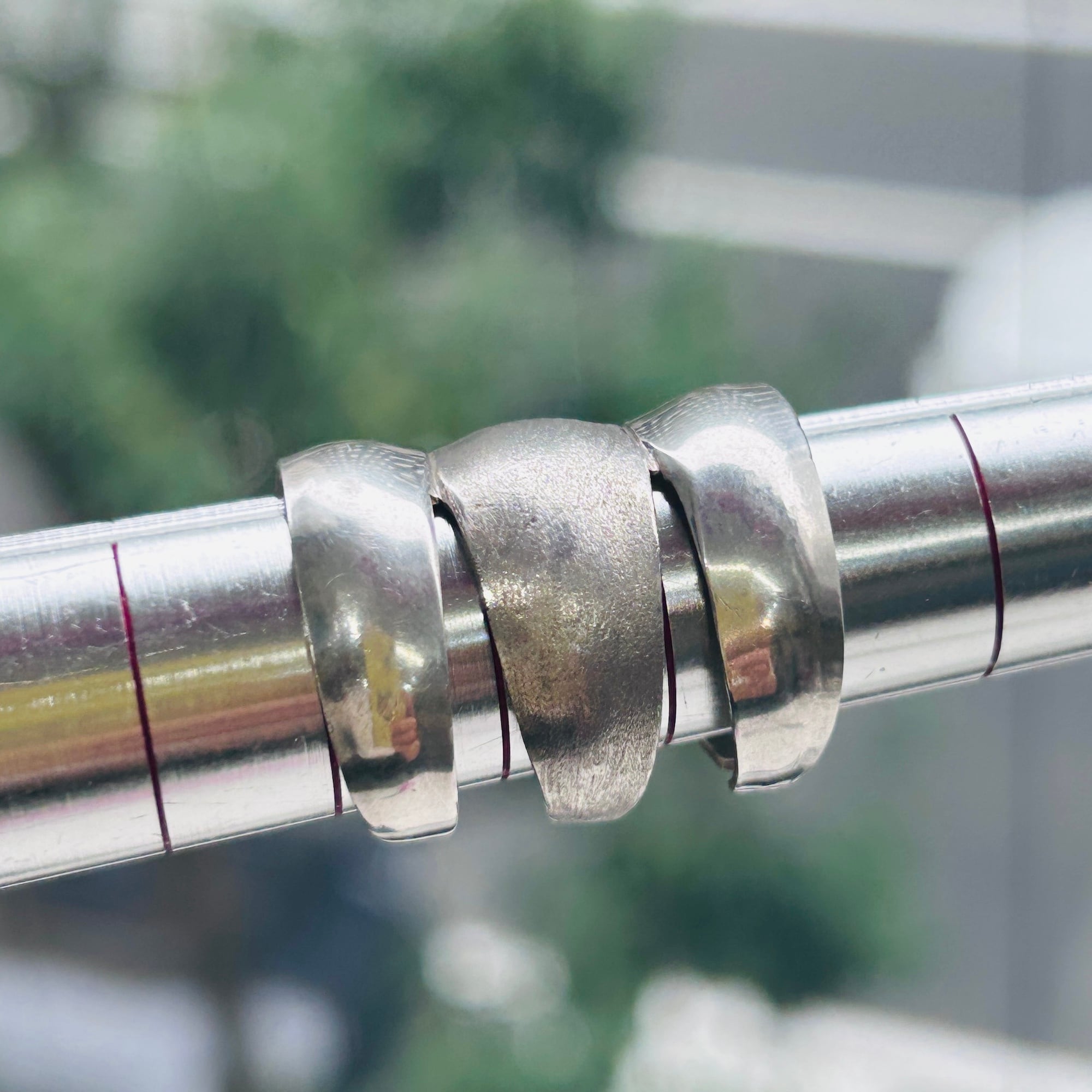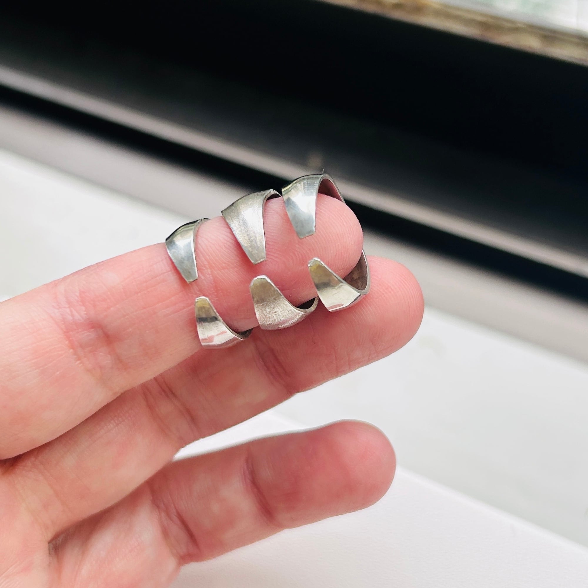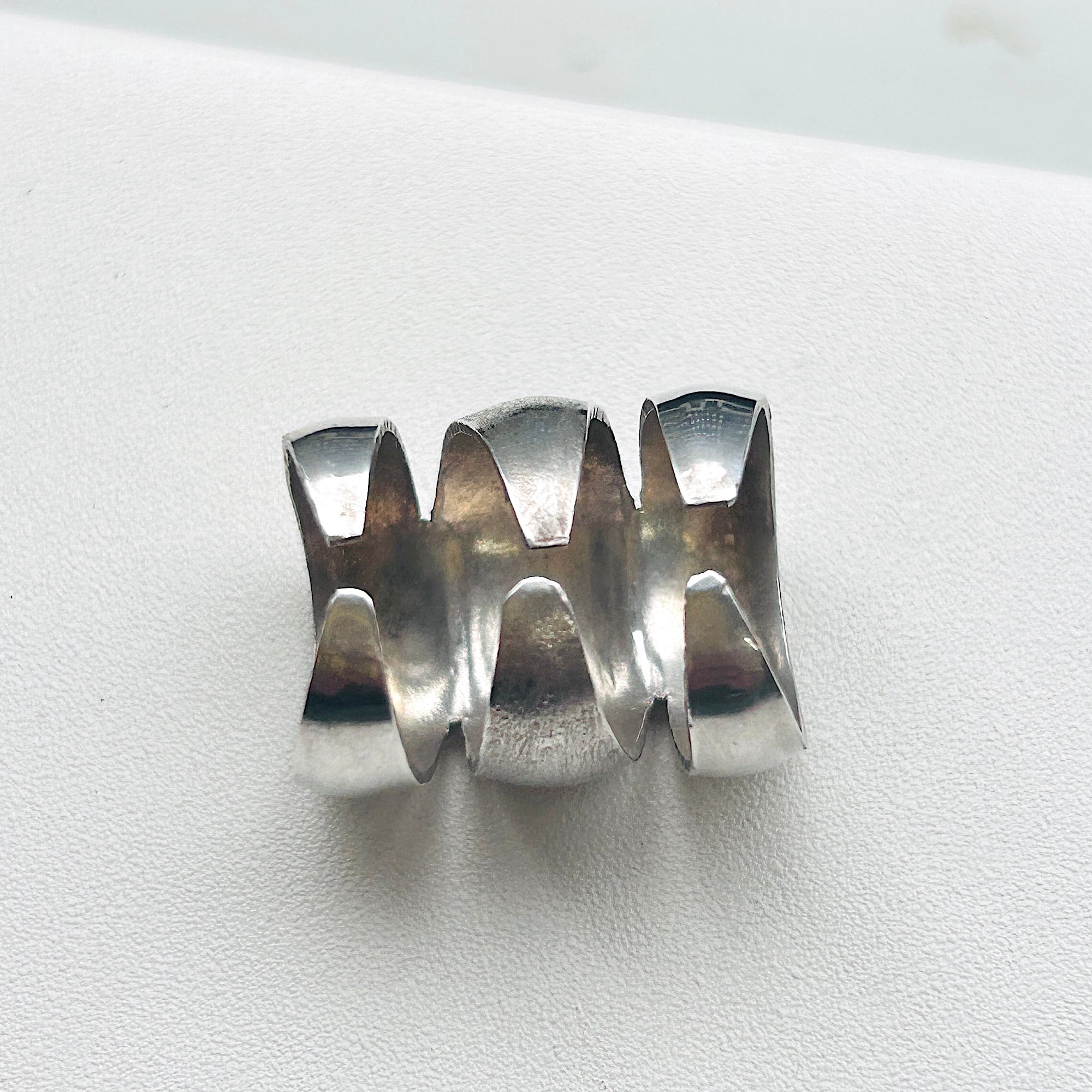 無名のハンドメイドシルバーリング。3つのリングがくっついたような個性的なデザインです。上下はツヤのあるプレーン、真ん中は細かいザラっとしたテキスチャーです。ちょうど間接1つ分くらいの幅です。着けると少々指を曲げ辛くなりますが仕方ありません。アジャスタブル面も上に向けて着けるのもオモシロイです。こちらのリングは歪んでいたり、均一に整った形ではありません。リングのエッジもややシャープ。素人ぽさのあるワイルドな作りですがオモシロイです。刻印はありませんがシルバー925です。私は普段9〜10号の薬指に着用できます。アジャスタブル仕様ですのでバンドを広げてサイズアップも可能です(自己責任でお願いします)。切れ目の根本からゆっくり広げるようにして下さい。