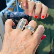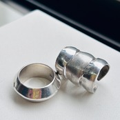 ボルトのような、インダストリアルなカタチがクールなリング。膨らんだ中は中空です。小さな凹みやスリキズのあるヴィンテージコンディション。味わいある使い込まれたシルバーリングです。内側に「925」、外側に1つ、凹みのように見えるのはcrab刻印かなと思っています。crab(カニ)はフランスシルバー800を最低保証する、1838〜1984年まで使用されたマークです。