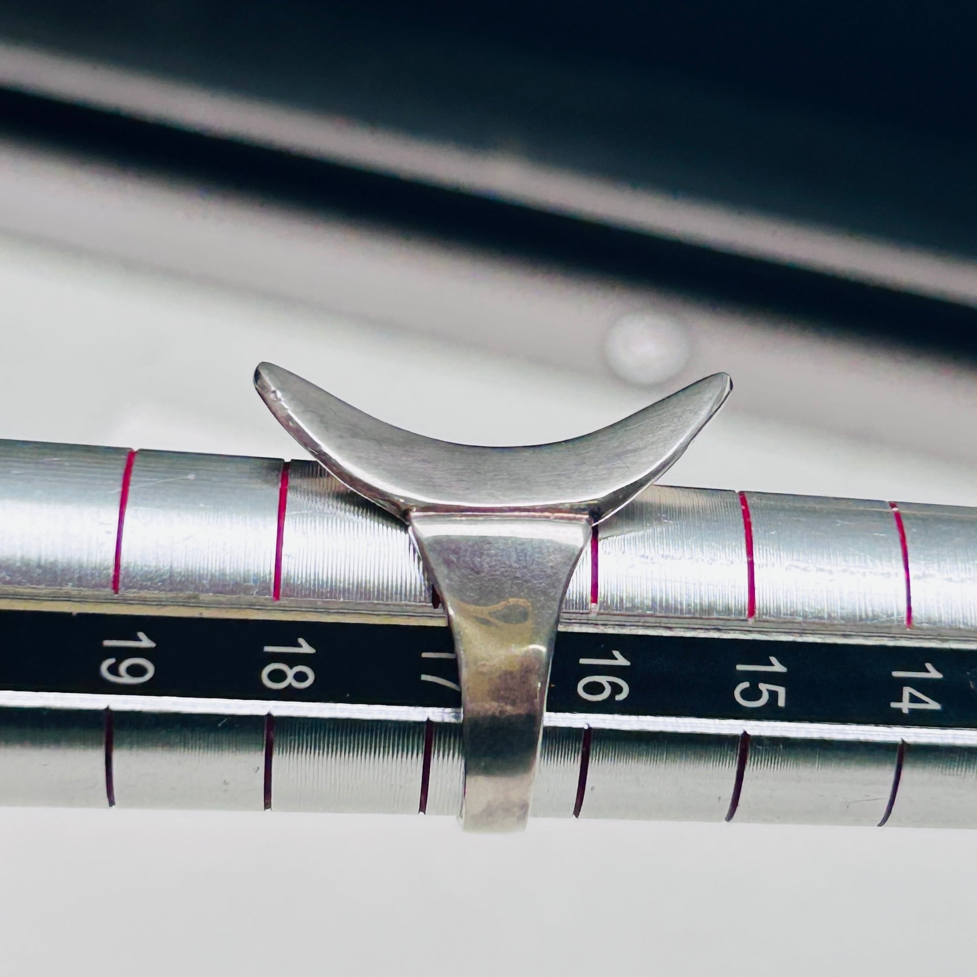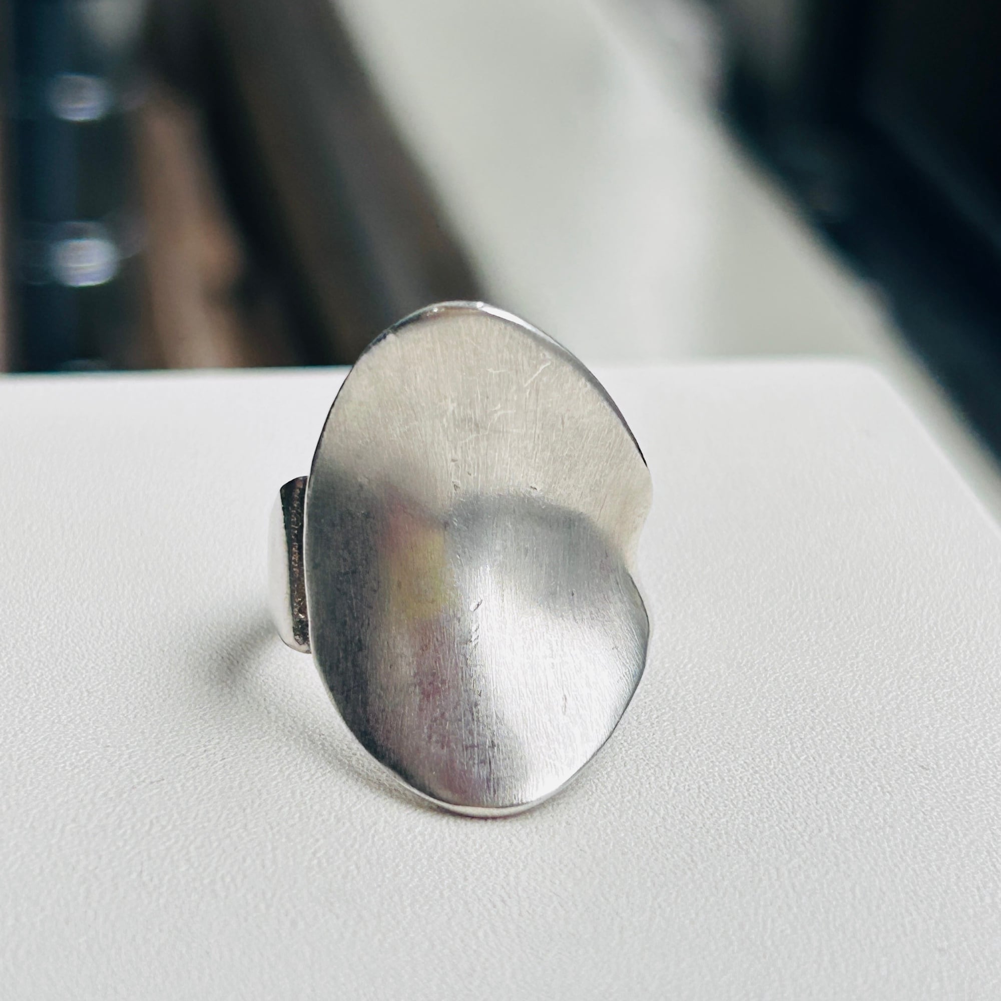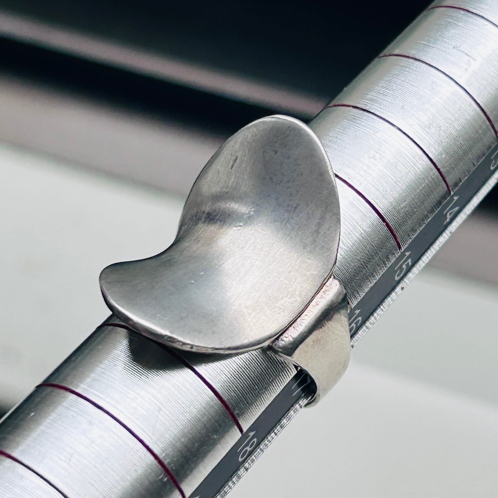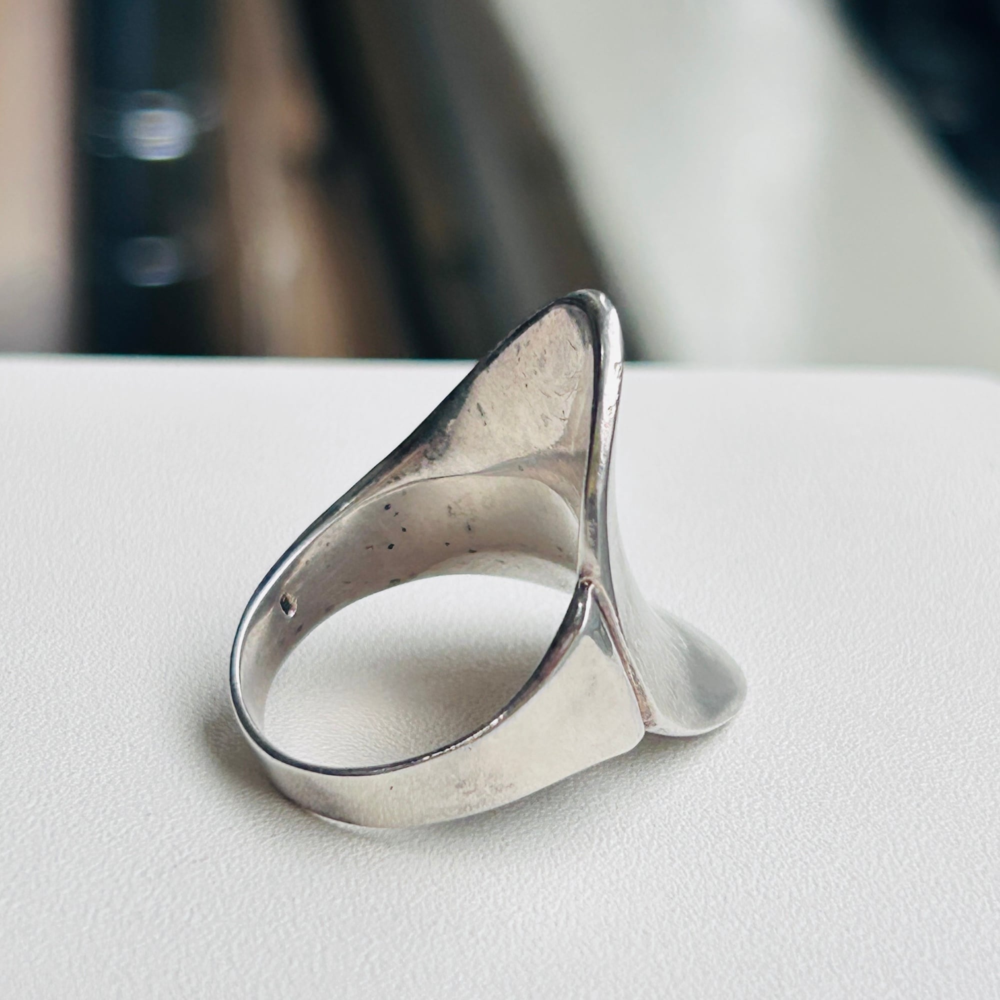 反り返った曲線が美しいデザインリング。トップからバンドに滑らかな曲線でつながっています。クルンと回ってラップデザインのようですが、片側でトップとくっついていてアシンメトリーなデザインです。セミマットなシルバーでアーティスティックな雰囲気。手元で見ると多少スレや古傷ございます。内側はツルンとした滑らかな質感で着脱しやすいです。普段14〜15号の人差し指に緩い着け心地。内側に「925」と読み取れない刻印。