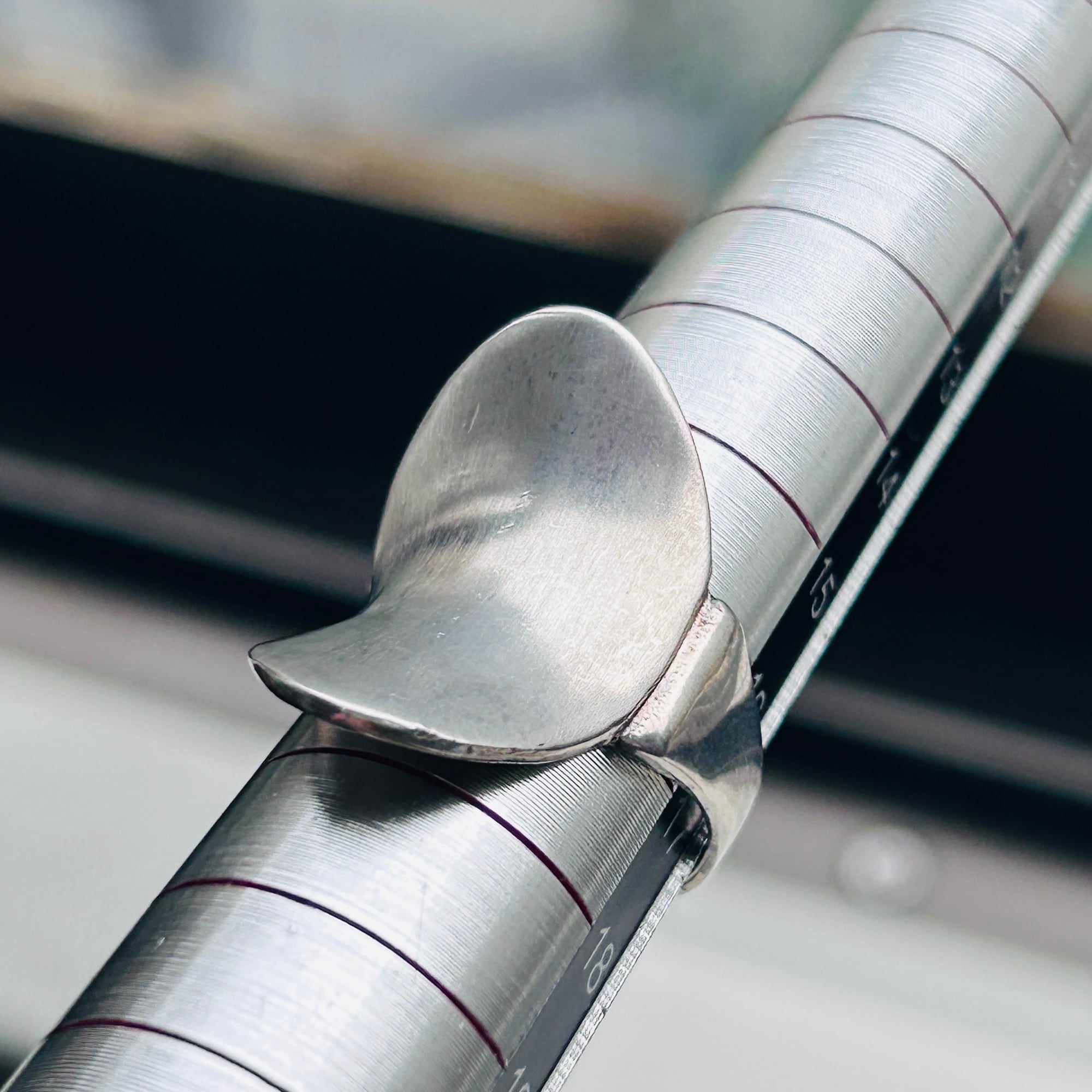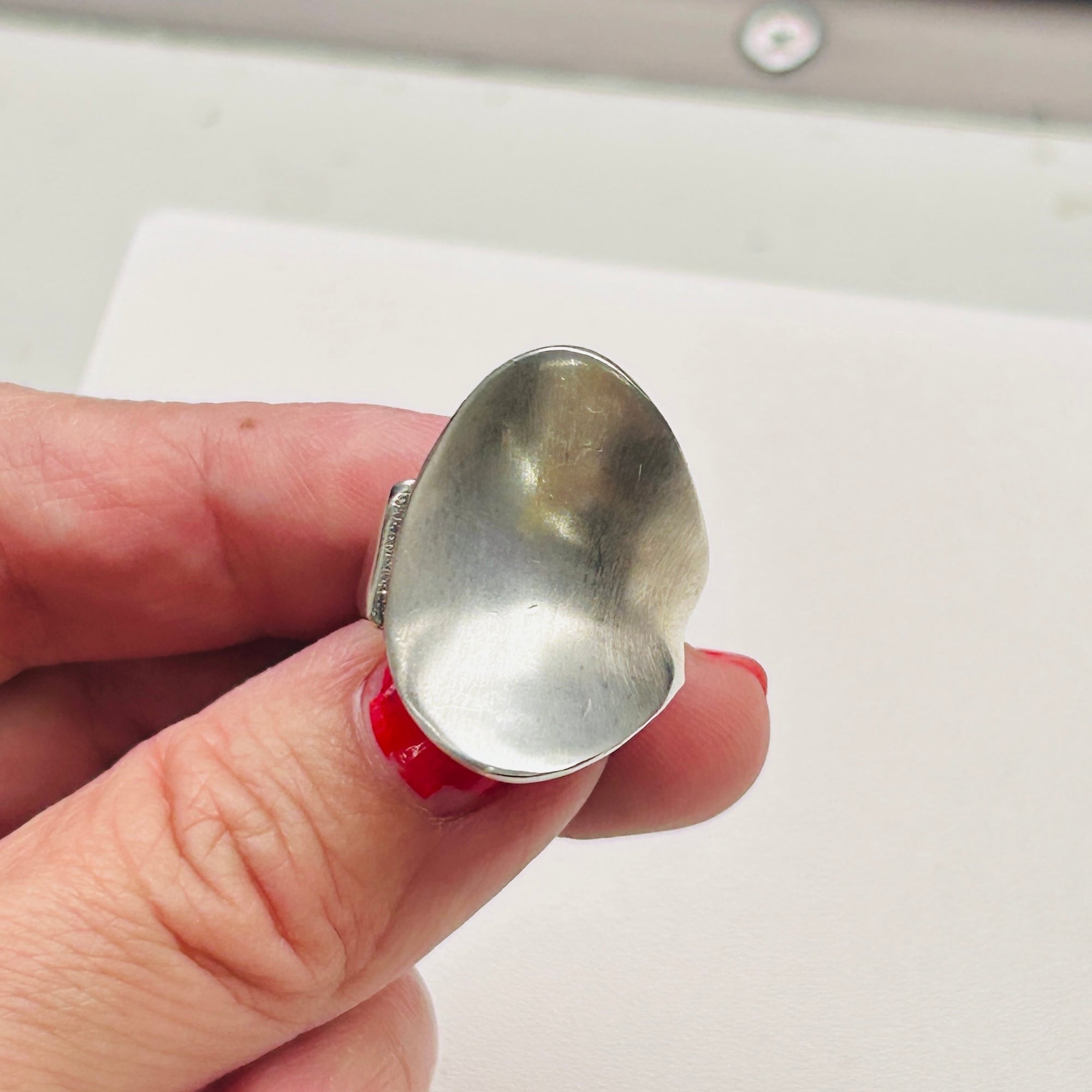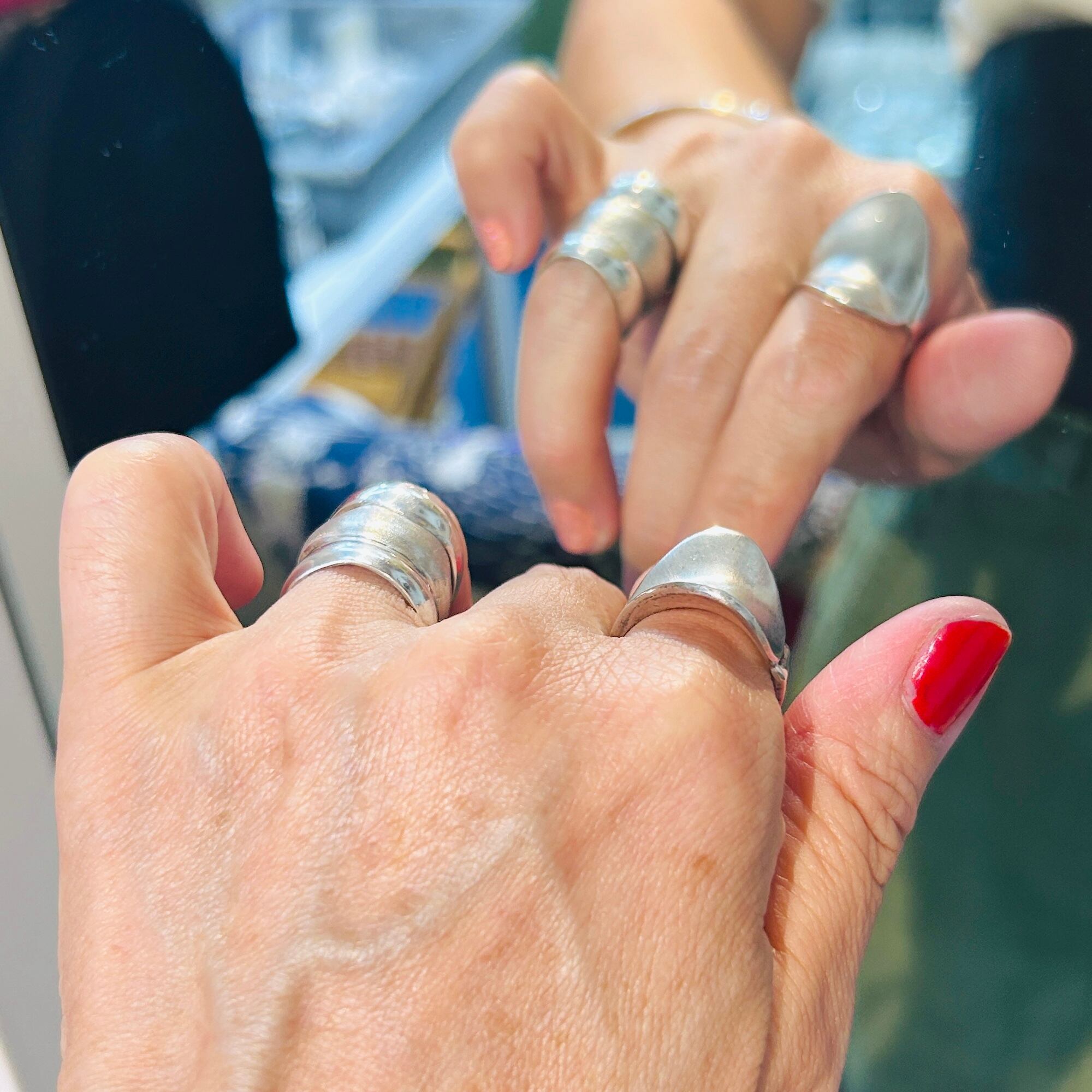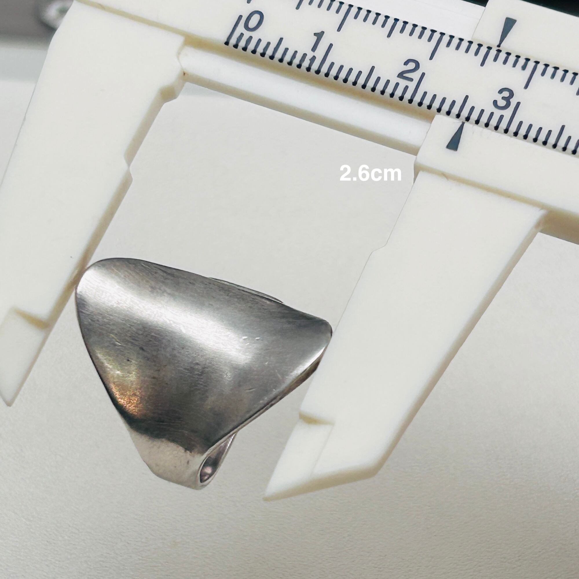 反り返った曲線が美しいデザインリング。トップからバンドに滑らかな曲線でつながっています。クルンと回ってラップデザインのようですが、片側でトップとくっついていてアシンメトリーなデザインです。セミマットなシルバーでアーティスティックな雰囲気。手元で見ると多少スレや古傷ございます。内側はツルンとした滑らかな質感で着脱しやすいです。普段14〜15号の人差し指に緩い着け心地。内側に「925」と読み取れない刻印。