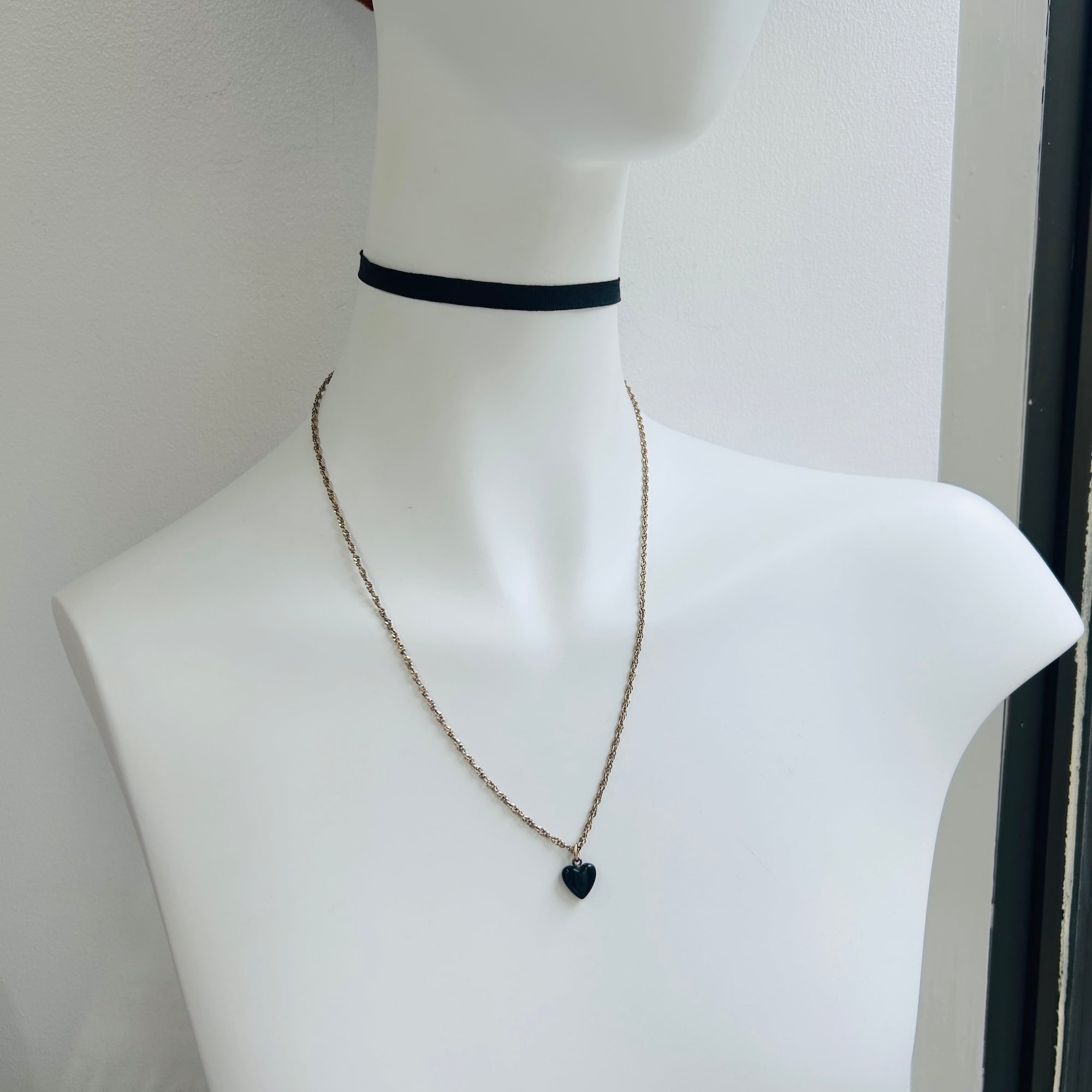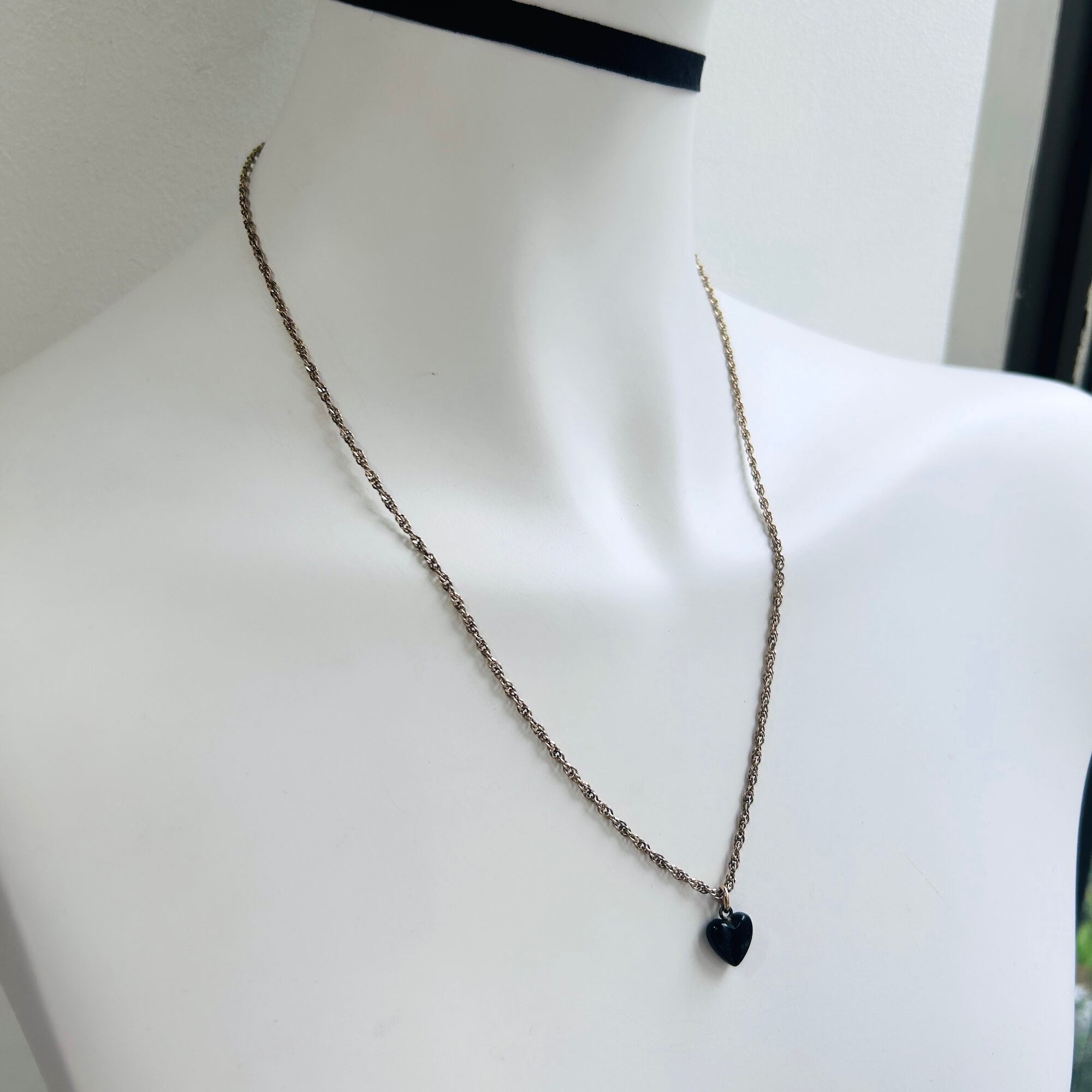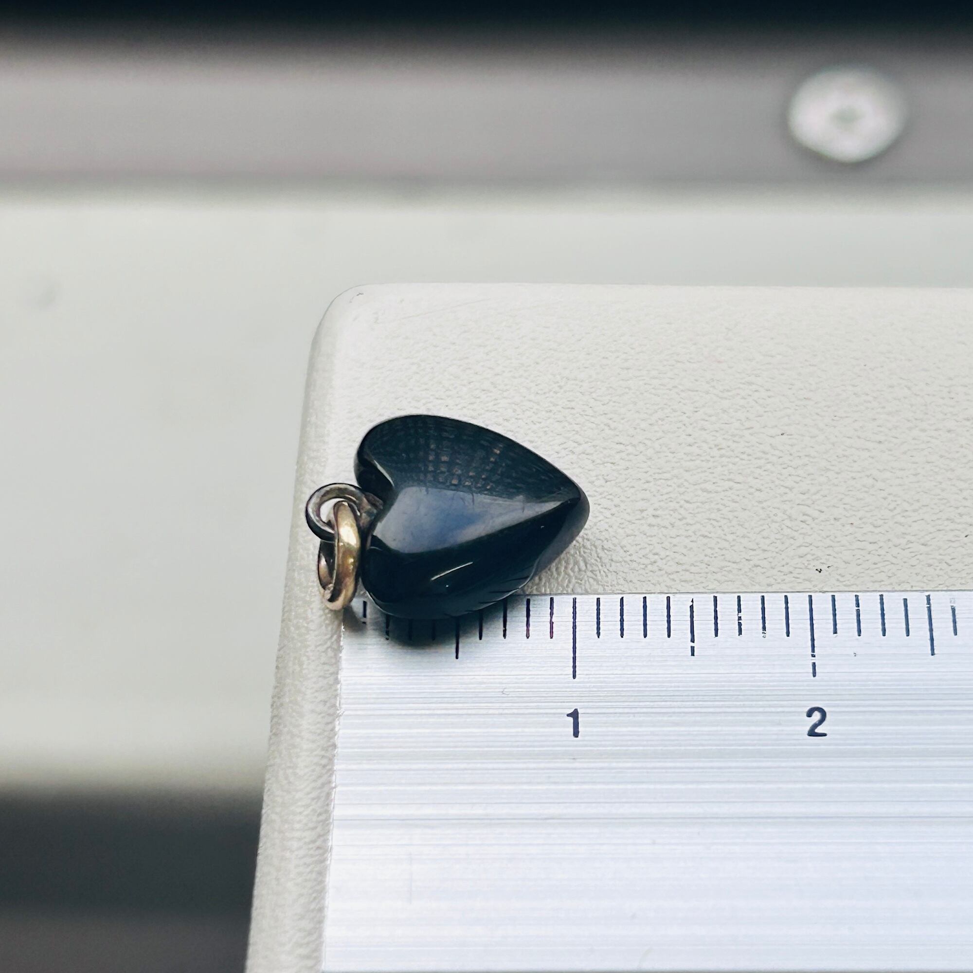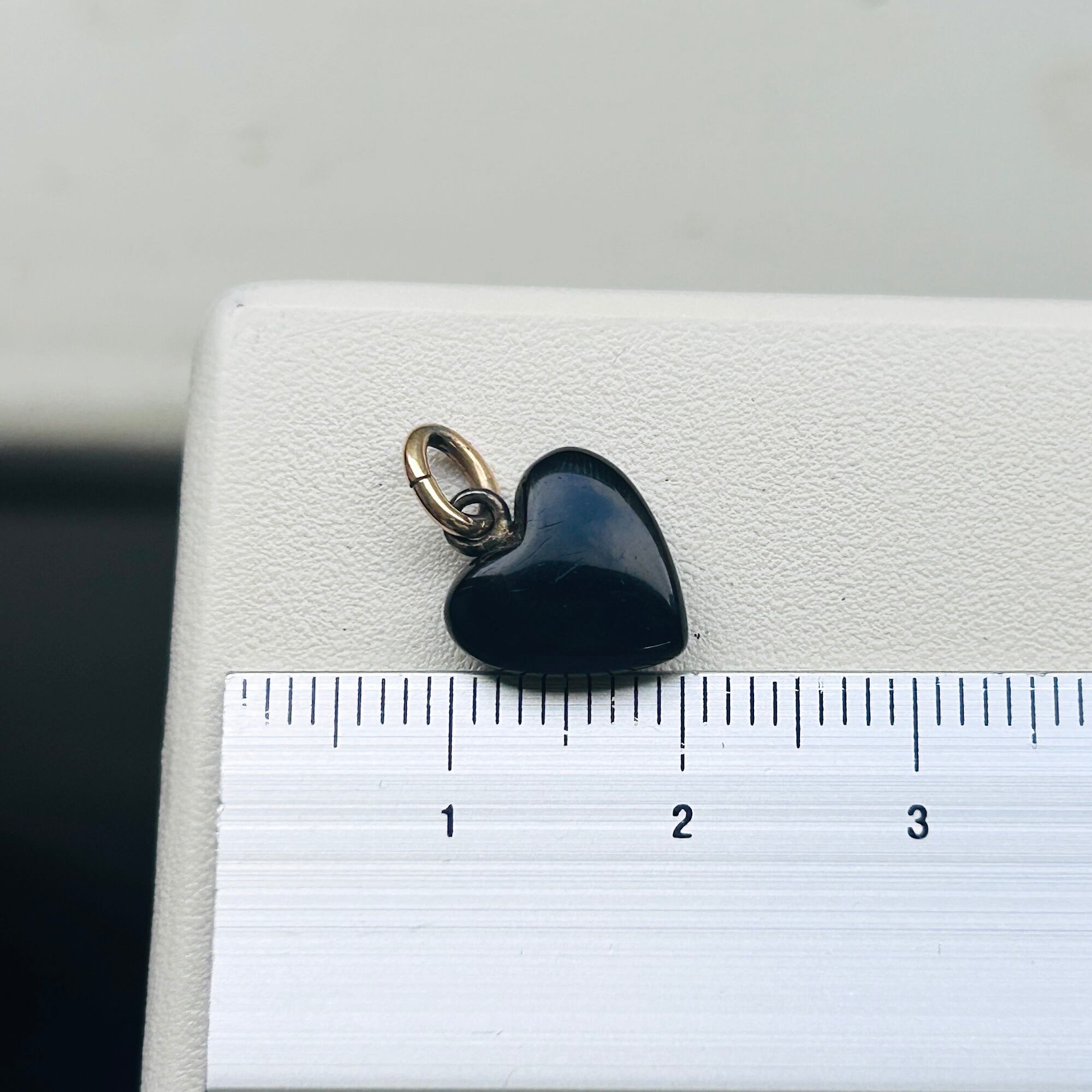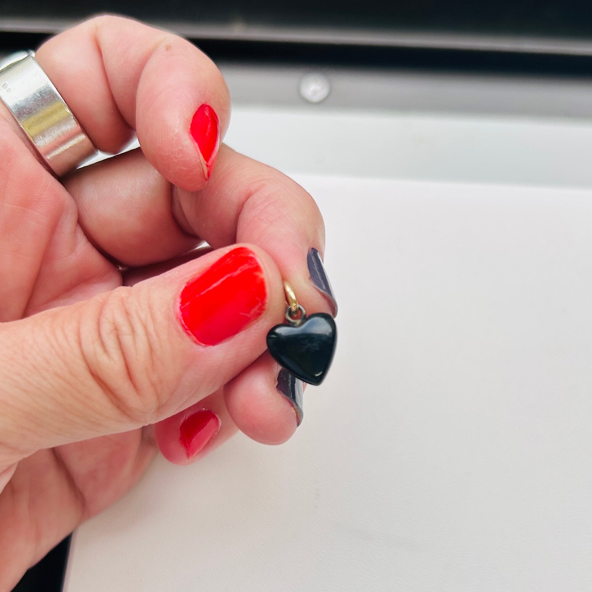 フランスから届いたミニチュアハートチャーム。フレンチジェット(黒いガラス)に金メッキの丸カンがついています。表面に浅い擦り傷あります(写真7が分かりやすいです)。擦り傷は目立ちません。お手持ちのチェーンと合わせて着用下さい。丸カン内径約3 x 3mmです。