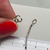 シンプルな金メッキチェーン。シルバーに見える写真もありますが実物は薄い明るい金色、シャンパンカラーに似た色です。手で持っている写真の色味をイメージ下さい。太さ約1.5mm、ラインがくっきり見えるチェーンです。ハサミのようにガバっと開く使いやすい金具です。下地のシルバーの変色が進むと銅や真鍮に似た色になってきます。シルバー液体クリーナーに着けると現状の色に戻ります。留め具に「STERLING」「ITALY」その他メーカー名などの刻印。良いチェーンです。シルバーともゴールドと合わせることが出来ますし、シャランっと着けているだけでこなれ感が生まれます:):)