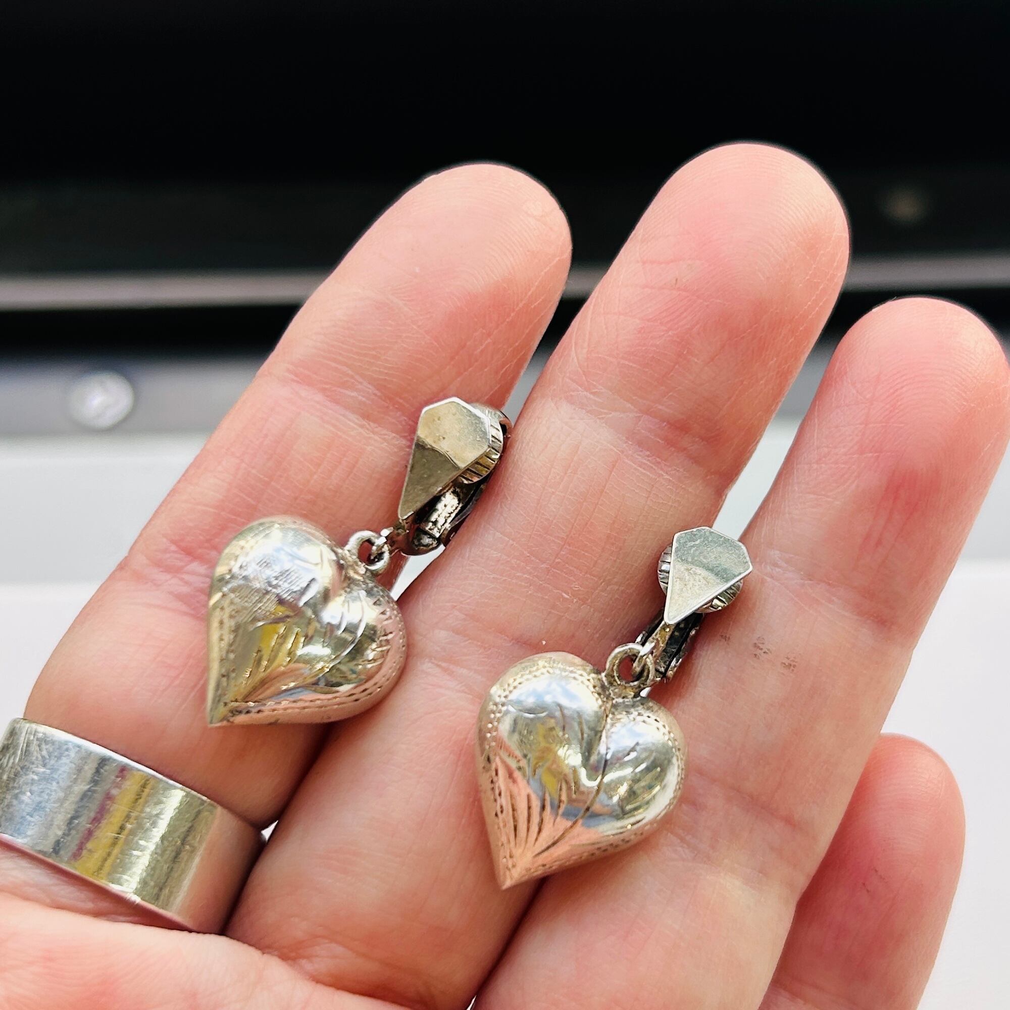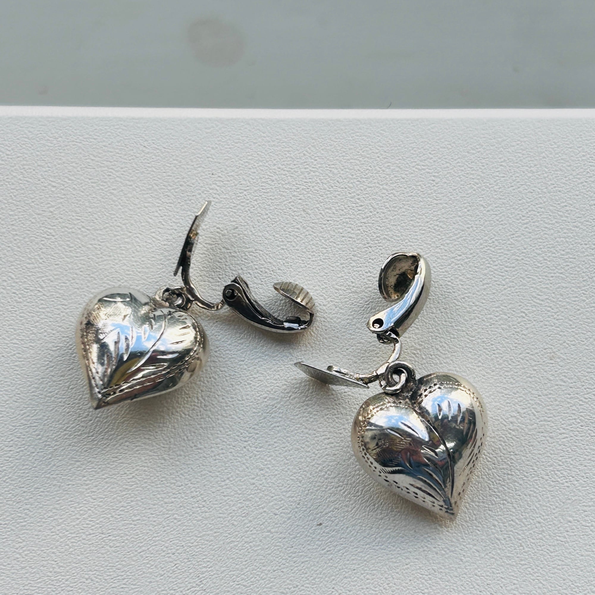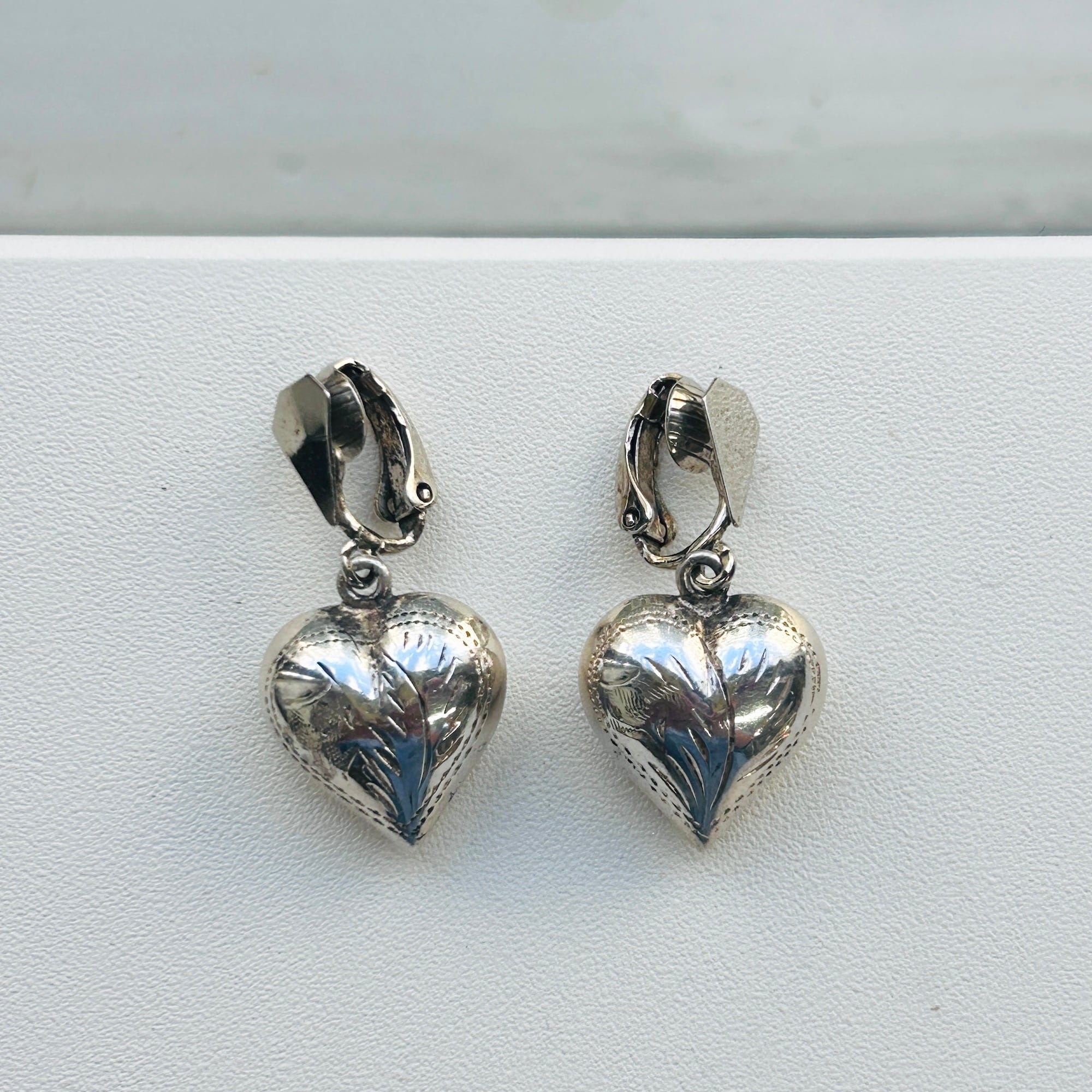 小さなパフィハートが揺れるイヤリング。ありそうでないデザインのハートイヤリングです。総彫りハートとは刻印なしシルバー、イヤリング金具はシルバー925ではありません。前の持ち主さんが自身で組み合わせたのか、このようにして販売されていたのか分かりませんが、とにかく可愛いです。しっかり留まります。個人的な感想ですが、ホールド力あるクリップですが、耳たぶのど真ん中に着けると圧迫感ゼロ、痛みなく着けてる感じもしない着け心地です。