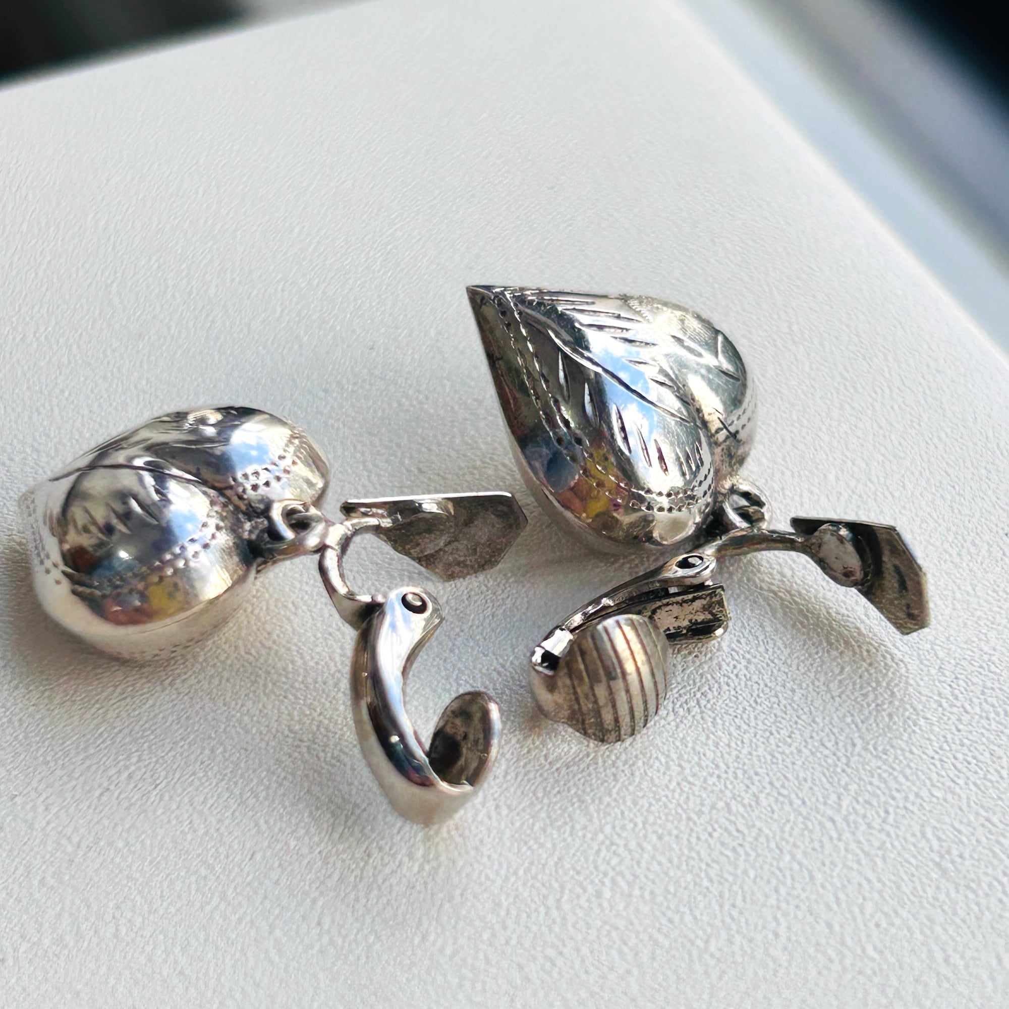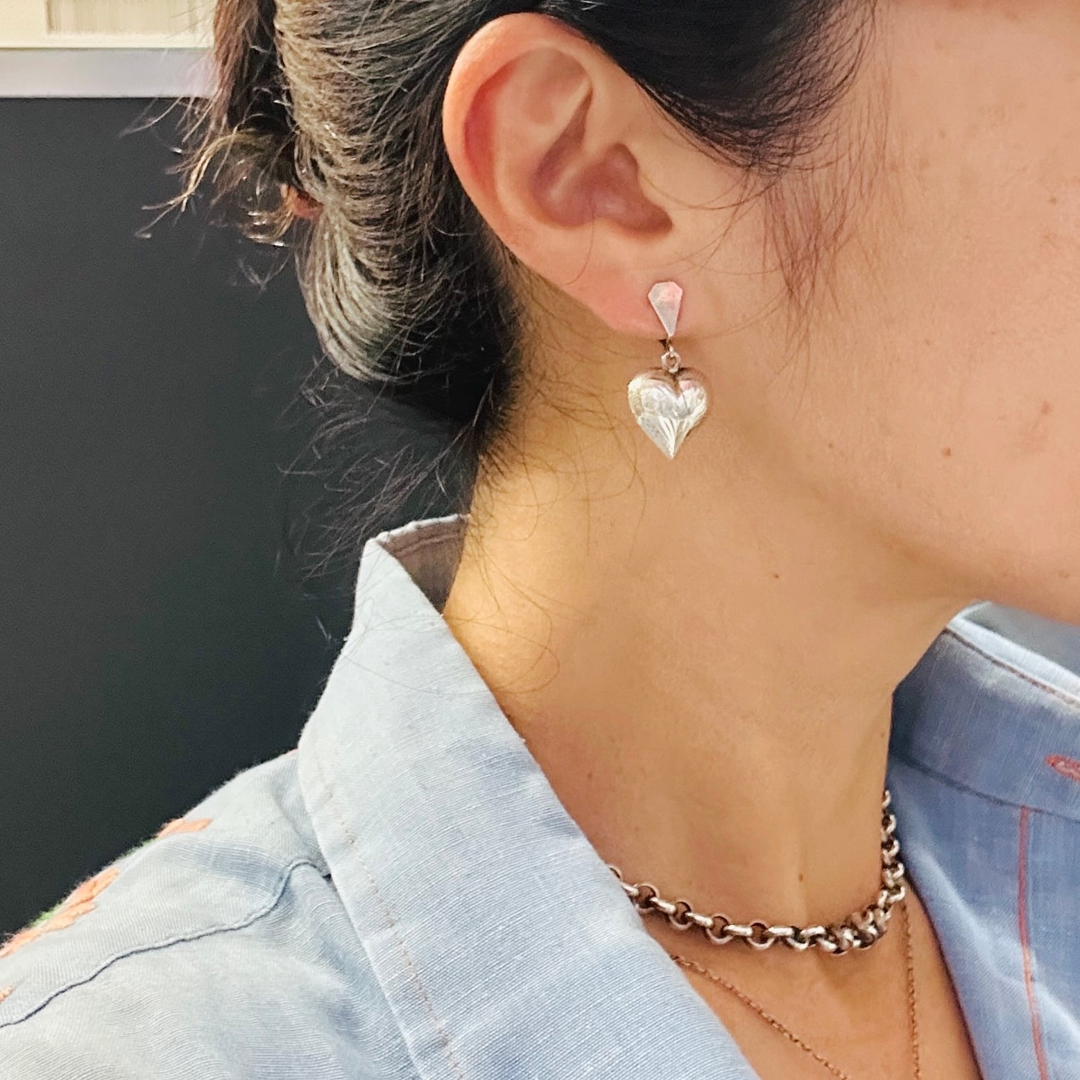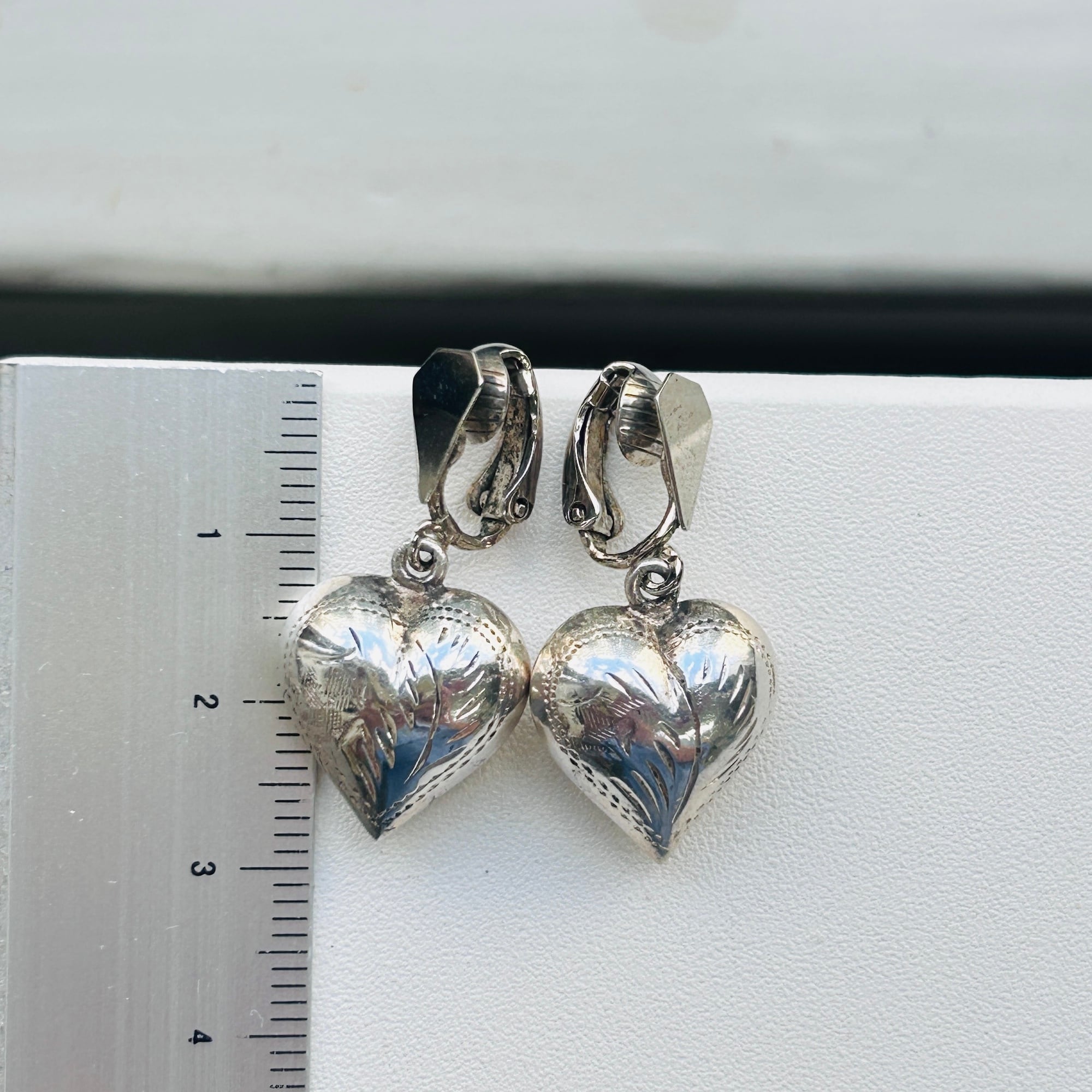 小さなパフィハートが揺れるイヤリング。ありそうでないデザインのハートイヤリングです。総彫りハートとは刻印なしシルバー、イヤリング金具はシルバー925ではありません。前の持ち主さんが自身で組み合わせたのか、このようにして販売されていたのか分かりませんが、とにかく可愛いです。しっかり留まります。個人的な感想ですが、ホールド力あるクリップですが、耳たぶのど真ん中に着けると圧迫感ゼロ、痛みなく着けてる感じもしない着け心地です。
