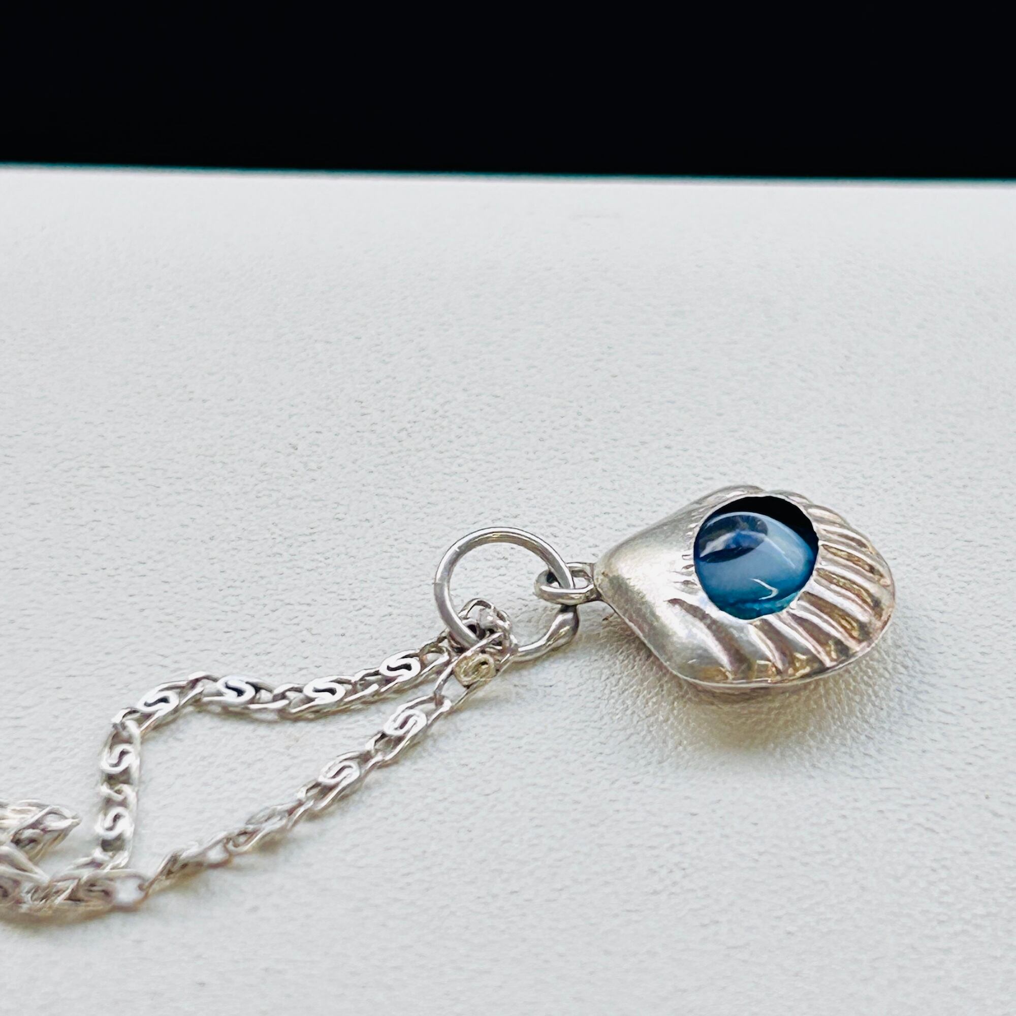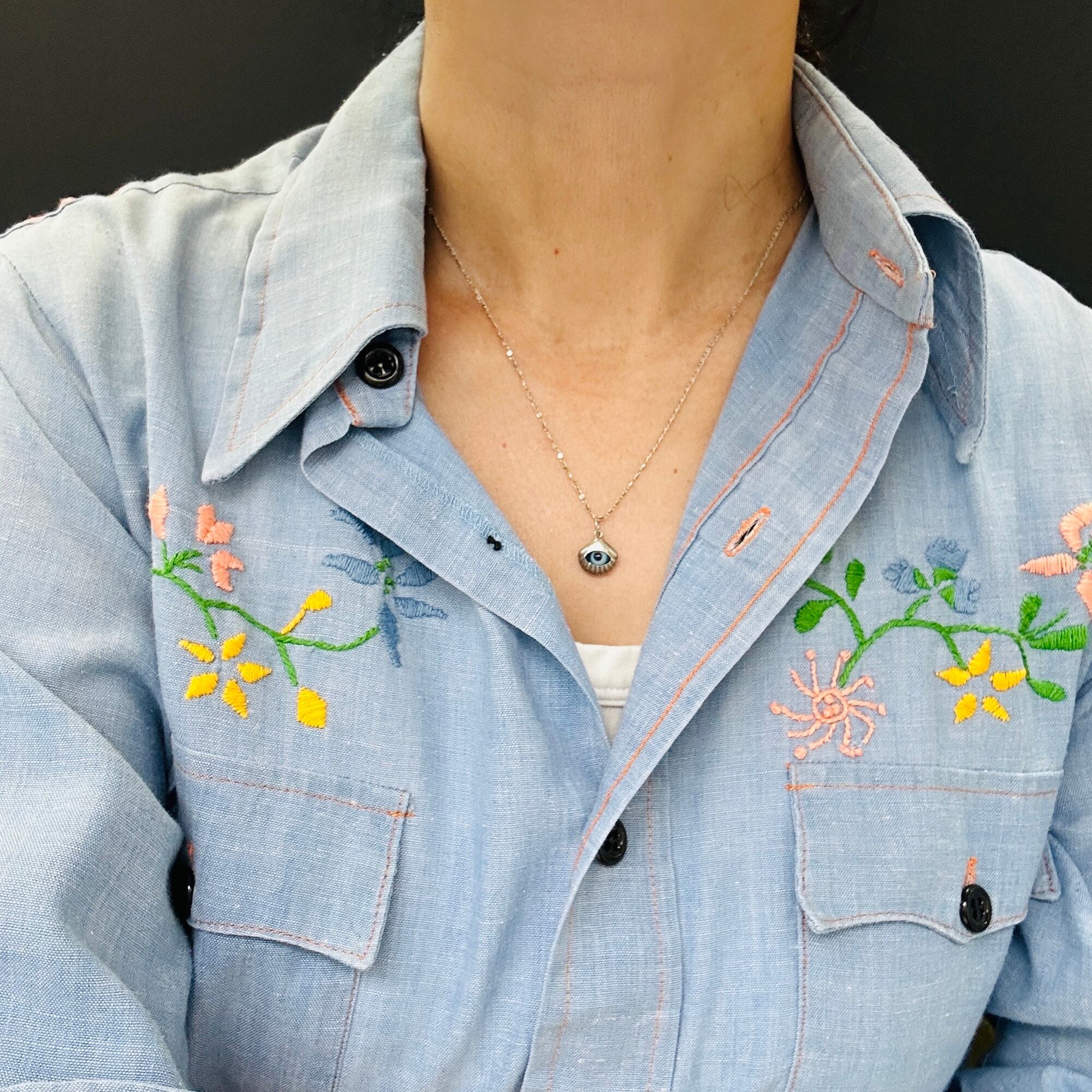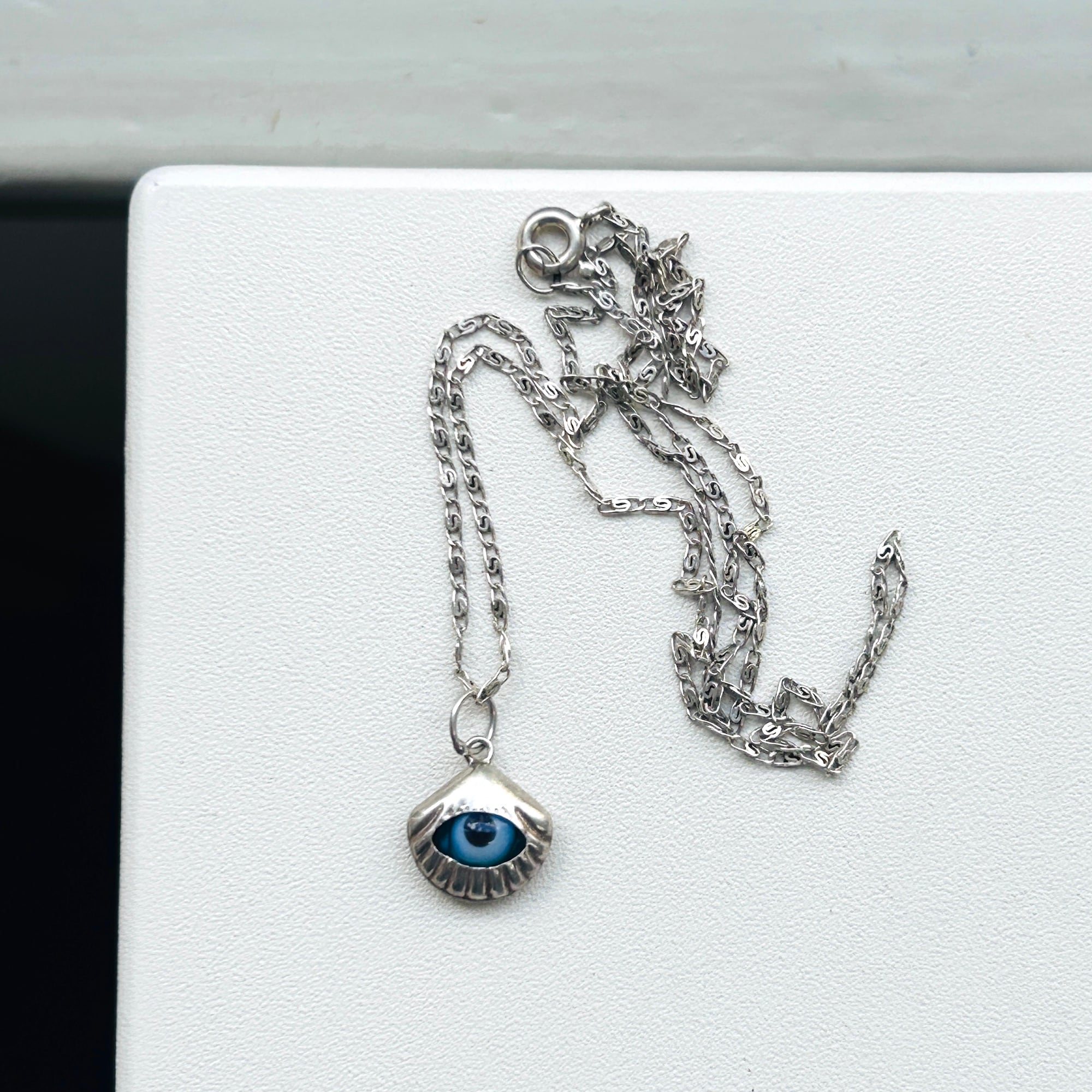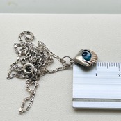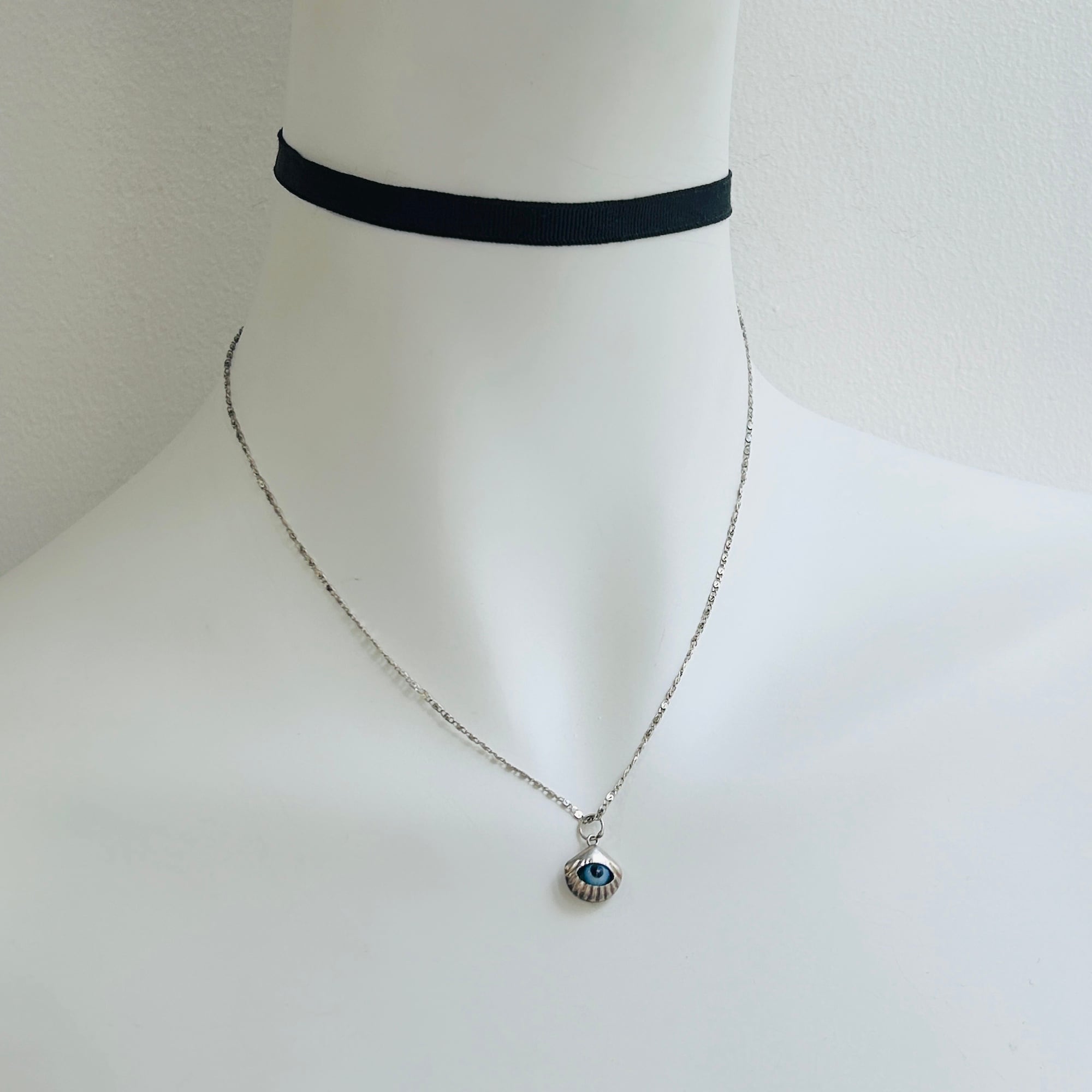 模様がユニークな華奢チェーンにユニークなシェル・目玉チャームのネックレスです。ピカピカしすぎない落ち着いたシルバートーン。軽いネックレスです。