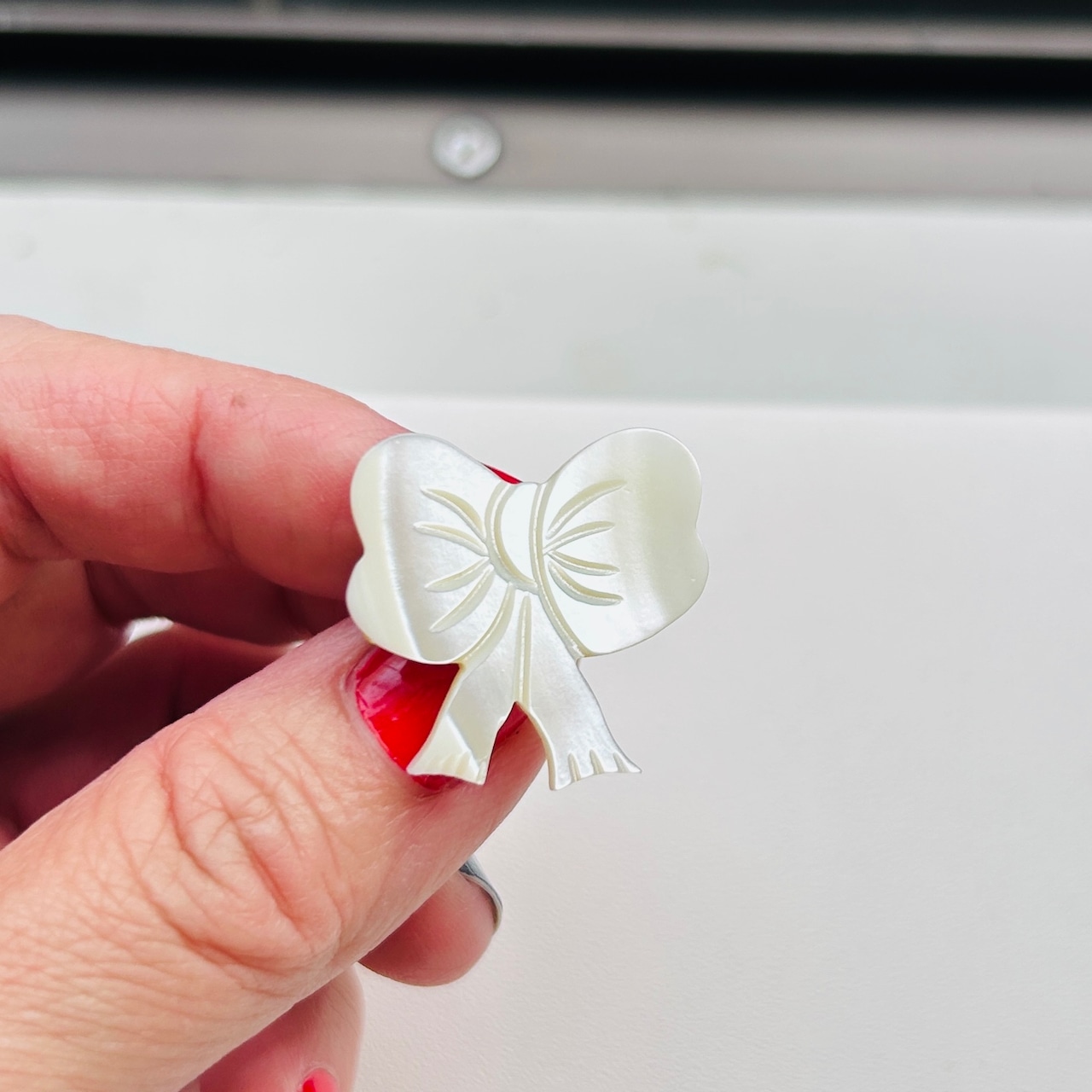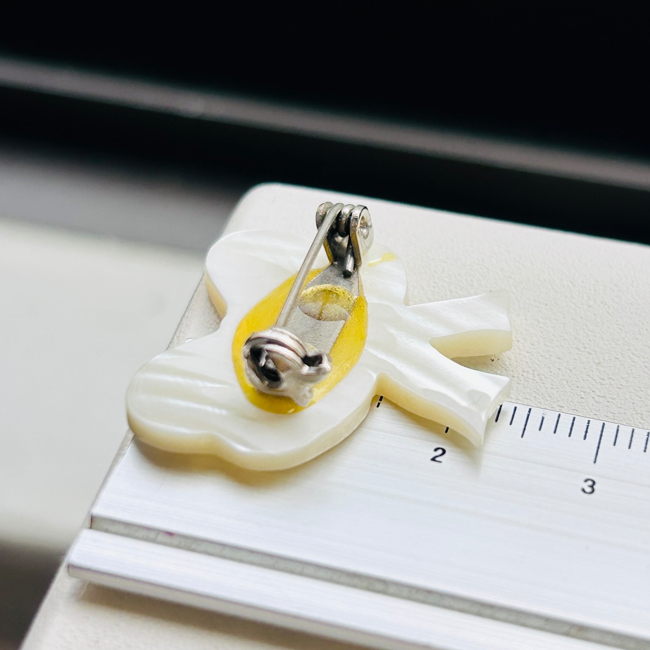 白蝶貝(Mother of Pearl)のノスタルジックなブローチ。小さくて可愛いリボンです。こちらは他と比較すると厚みがあります。流通したのは1960年頃でしょうか。接着剤がベッタリで時代を感じます。金具の動きに問題ありません。写真9着画、ブローチ着用には少し薄いです。針下のスペースがみっちり詰まるとブローチが安定して留まります。
