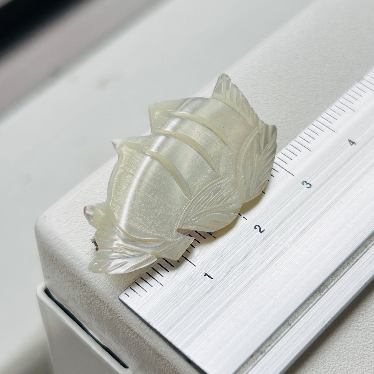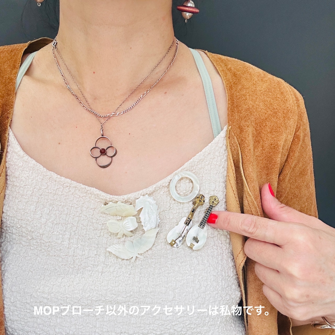 白蝶貝(Mother of Pearl)のノスタルジックなブローチ。岡山のお土産???と思ってしまうモモ・モチーフ。流通したのは1960年頃でしょうか。接着剤がベッタリで時代を感じます。真鍮金具に刻印、接着周りに少し錆があります。針の動きに問題ありません。写真8・9着画、ブローチ着用には少し薄いです。針下のスペースがみっちり詰まるとブローチが安定して留まります。
