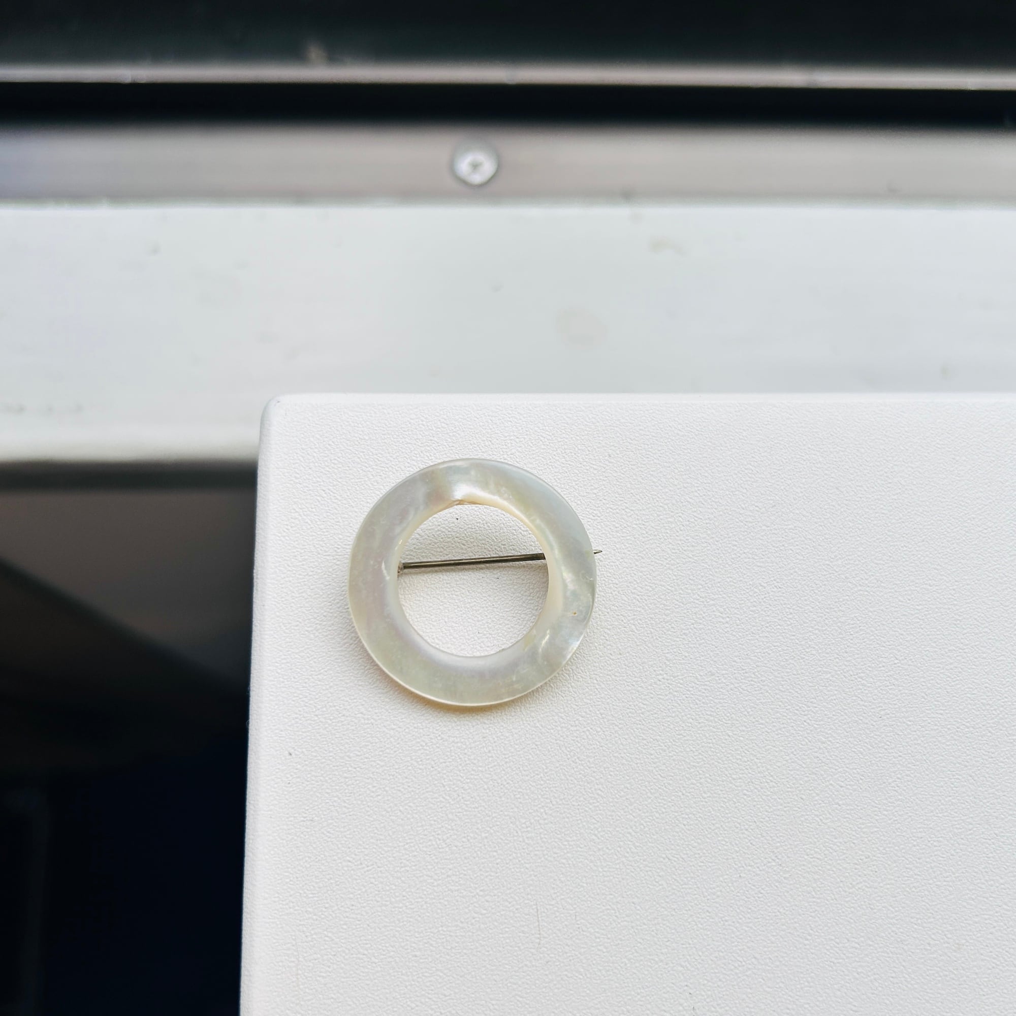 白蝶貝(Mother of Pearl)のノスタルジックなブローチ。シンプルなサークルモチーフ。貝のナチュラルな光彩がキレイなマルです。他と比較すると中くらいの厚み、背面全てにメタルプレートが貼ってあります。MOPブローチが流通したのは1960年頃でしょうか。接着剤がベッタリで時代を感じます。金具の動きに問題ありません。写真8着画、ブローチ着用には少し薄いです。針下のスペースがみっちり詰まるとブローチが安定して留まります。