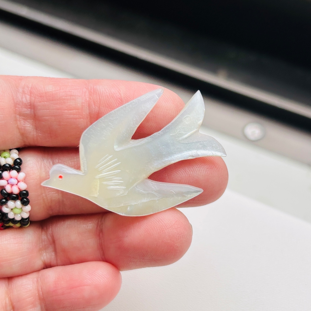 白蝶貝(Mother of Pearl)のノスタルジックなブローチ。自由に飛び回る平和なイメージ、こちらはDoveです。昔、このような鳥モチーフを「Pigeon(鳩)」と呼んだらルームメイトに「Dove」と訂正されたので頭に叩き込まれました。「Pigeon」は野生のハトを意味して「Dove」は神聖な鳩みたいです。MOPブローチが流通したのは1960年頃でしょうか。ピンは接着剤で固定された昔ながらの作りです。針の動きに問題ありません。
