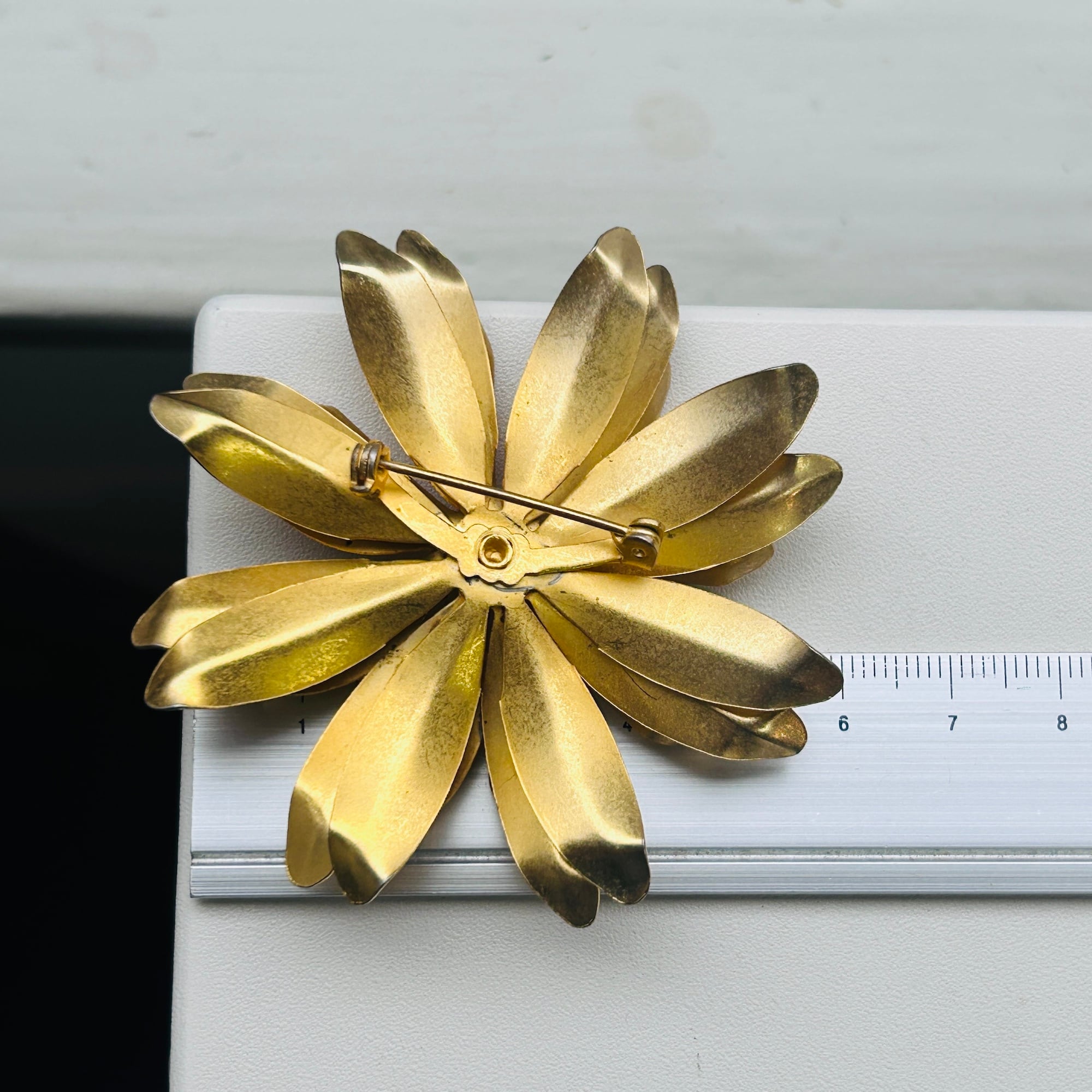 大きなフラワーブローチ。花びらに細かいプレス模様が施されたブラッシュド・ゴールド。ほんわり優しい光彩です。所々黒い錆のような小さな斑点があります。斑点を取ろうと軽く試みましたが取れませんでした。(あまり熱心にしていません。)ピンの風車は軽くクルンと回ります。使用に問題ありません。