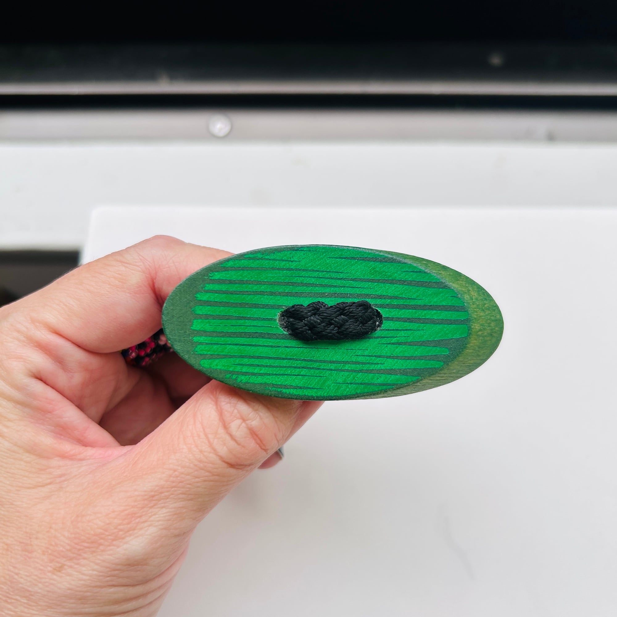 ミドリ色の大きな木製ボタンブローチ。フィンランド1954年創業、アーリッカの作品です。大振りでアクセントになる可愛らしいデザイン。ブローチLoverにオススメのユニークなブローチです。軽くて手触りがすごくいいです:)