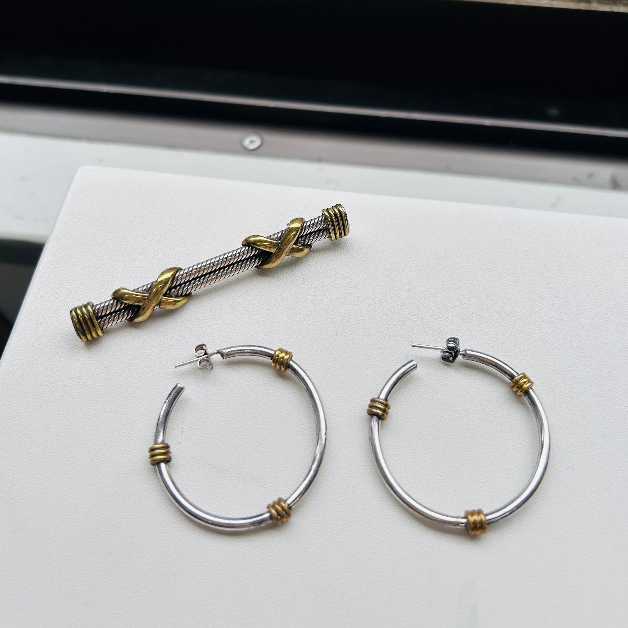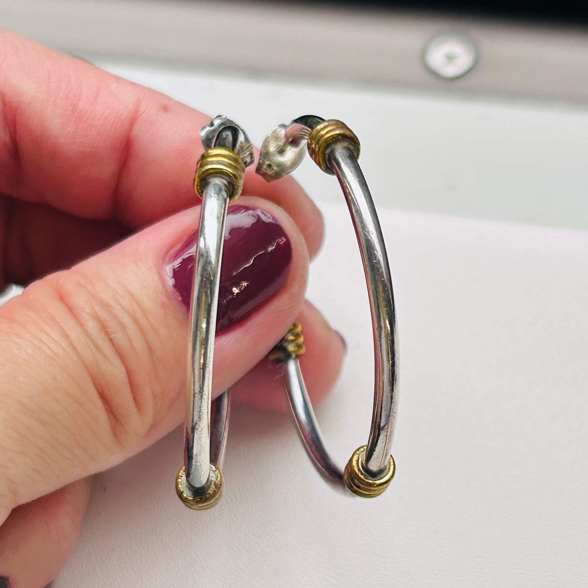 4cmフープに真鍮アクセントのクールなフープ。メキシカンシルバーだと思うのですが刻印なし。ヴィンテージハンドメイドらしい荒々しさもあるカッコいいピアスです。フープは中身の詰まったソリッドシルバー。真鍮カラー部分はメッキです。丹念に磨けばもっと輝いて大人っぽいツートーンになりそうです。できる限り磨いてお届けします。針先とフープエンドの間が狭いので耳に針を通すのに少し苦労するかもしれませんが着用できます。刻印はありませんがシルバーです。キャッチは左右異なります。