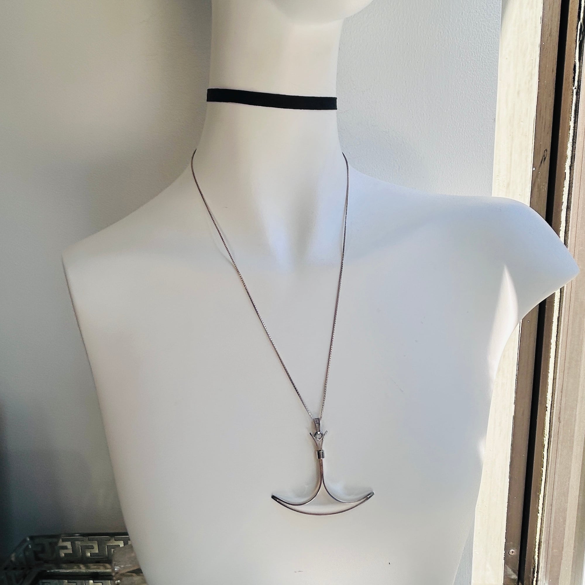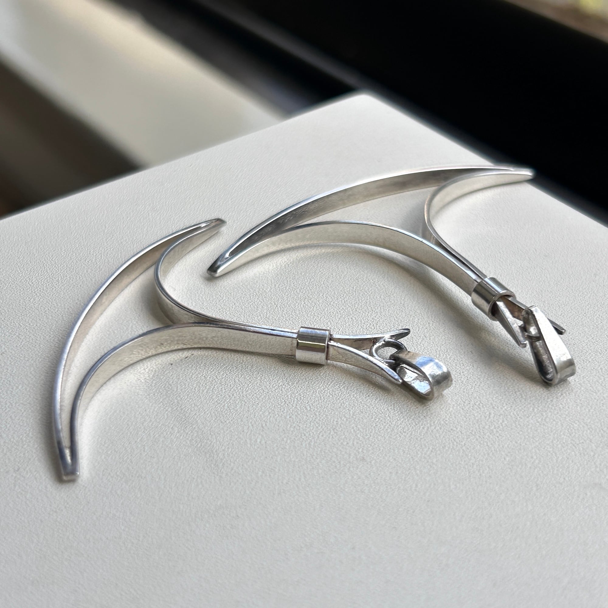 フィンランドの銀細工師、ジュエリーデザイナー、Erik Granit(1930-1988)によるペンダントトップ。Vikingを思わせるようなユニークでユニセックスなカタチ。お手持ちのチェーンと合わせてお楽しみください。厚み1mmのしっかりしたシルバープレート。曲線が美しいトップです。こちらは1970年代、日本に輸入、百貨店で販売されていた商品で、長い間国内保管されていたDEADSTOCKです。大きくて良さげな2点をピックしました。刻印は「925」のみ。国マークや作家刻印はありませんがErik Granitとお取引の上、輸入されたものですのでご安心ください。現在のデザイナージュエリーのように一つ一つ箱に入っていたわけではありません。当初は変色もありましたが磨いて輝きが戻りました。現在の在庫は2点ですが、サイズと重量は微妙に異なりますので下記をご参照ください。*着画にふさわしくない服装で撮影してしまいました。また撮り直します!