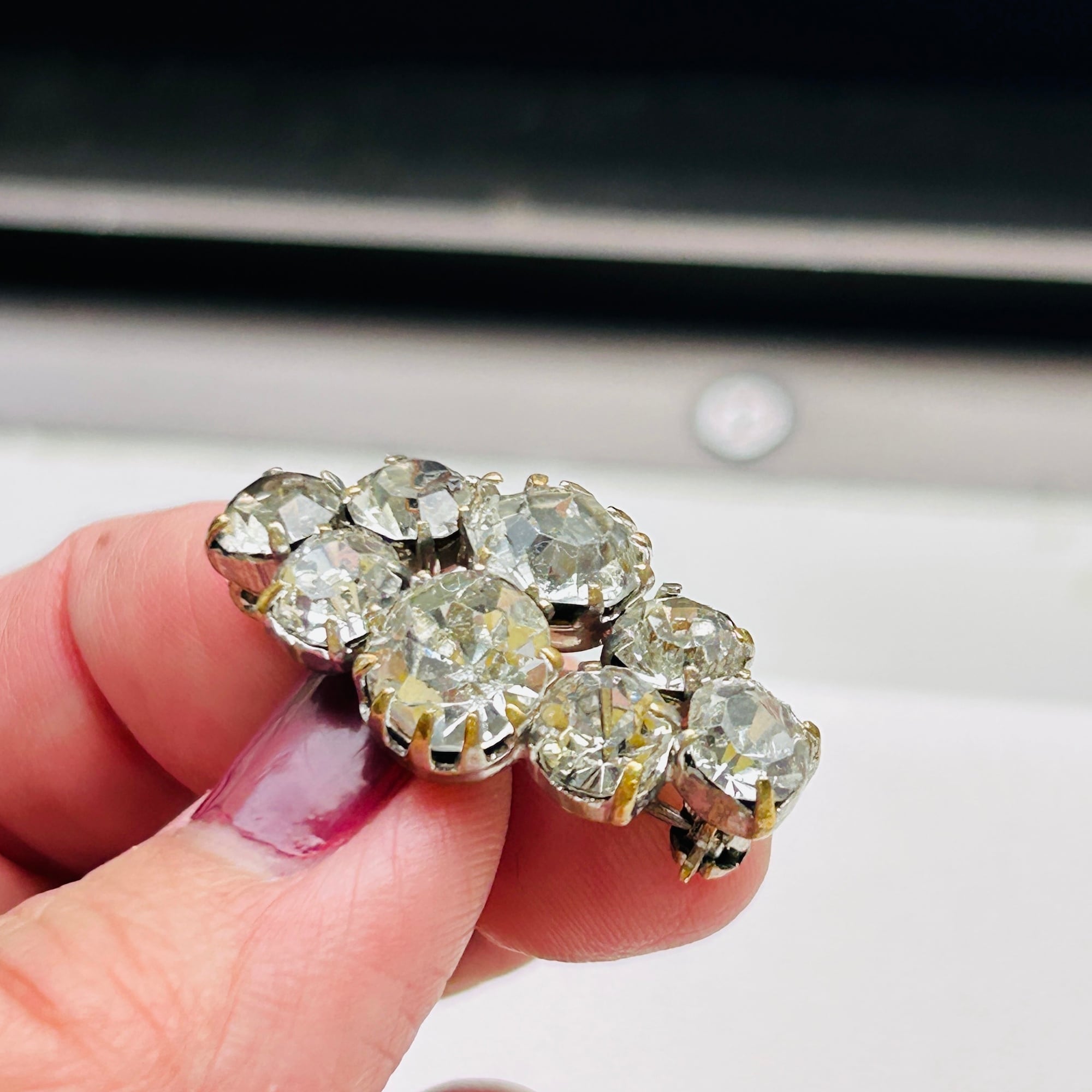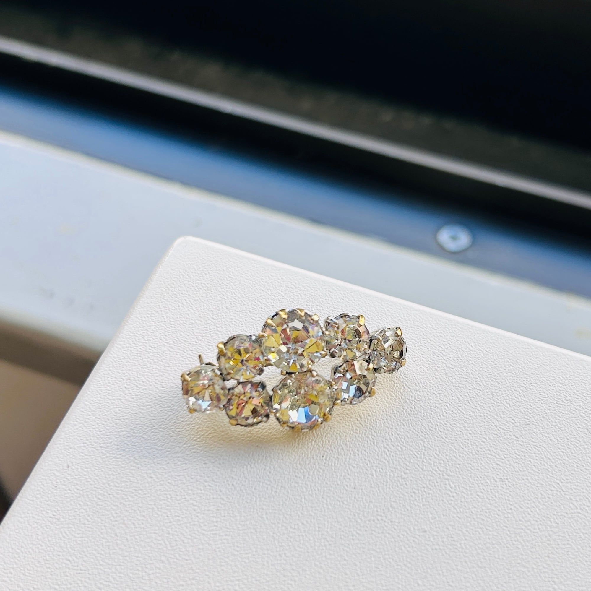古い雰囲気が漂うラインストーンブローチ。新品とは異なるクラシカルなキラキラです。控えめなサイズで可愛らしいアクセントになります。土台のメタルは銀がハゲてうっすら真鍮カラーが見えている箇所もあります。シルバーやゴールドブローチと合わせて着けるのも可愛いし素敵だと思います。金具の動きに問題ありません。着画の服はこのブローチには薄いです。もう少し厚みのある生地に適しています。