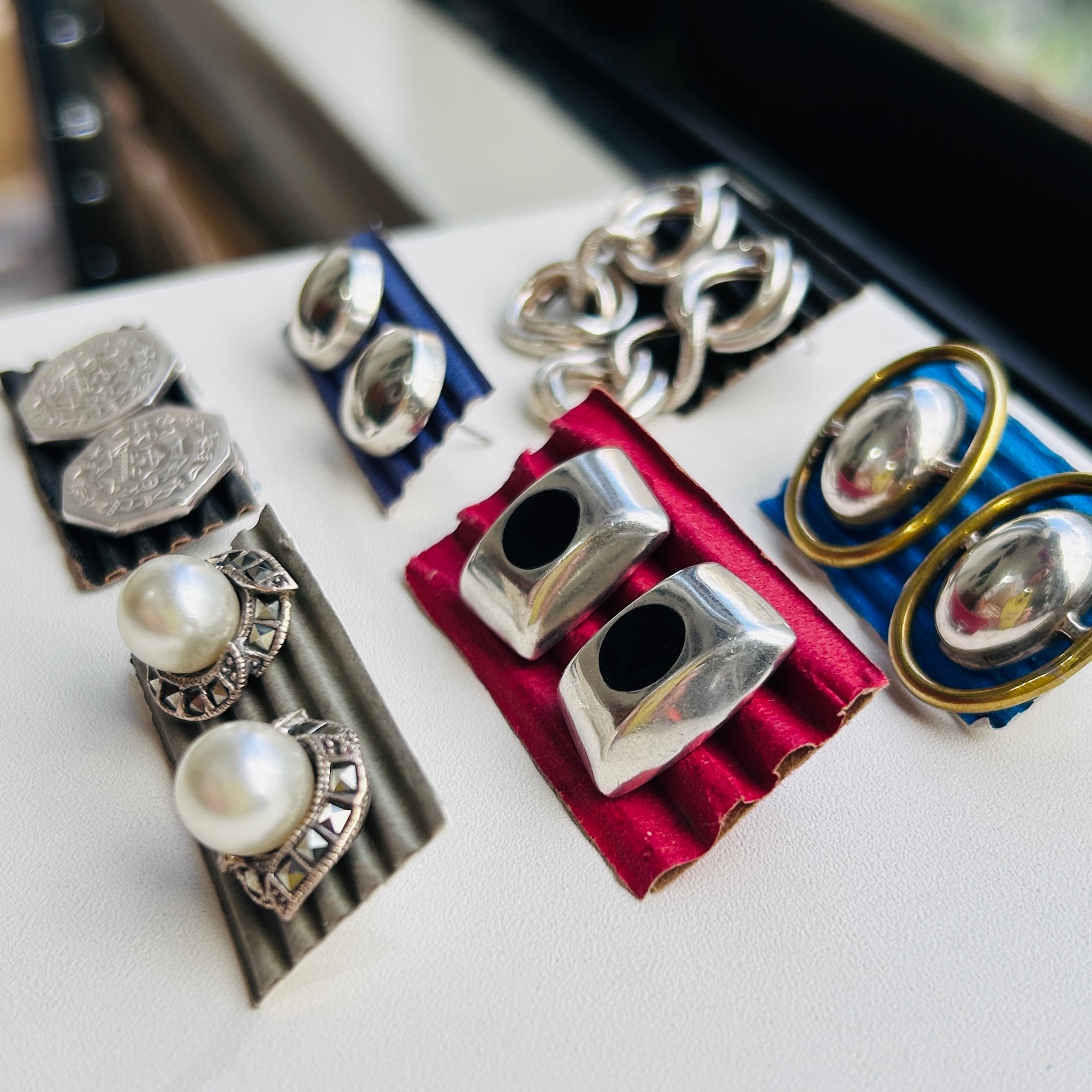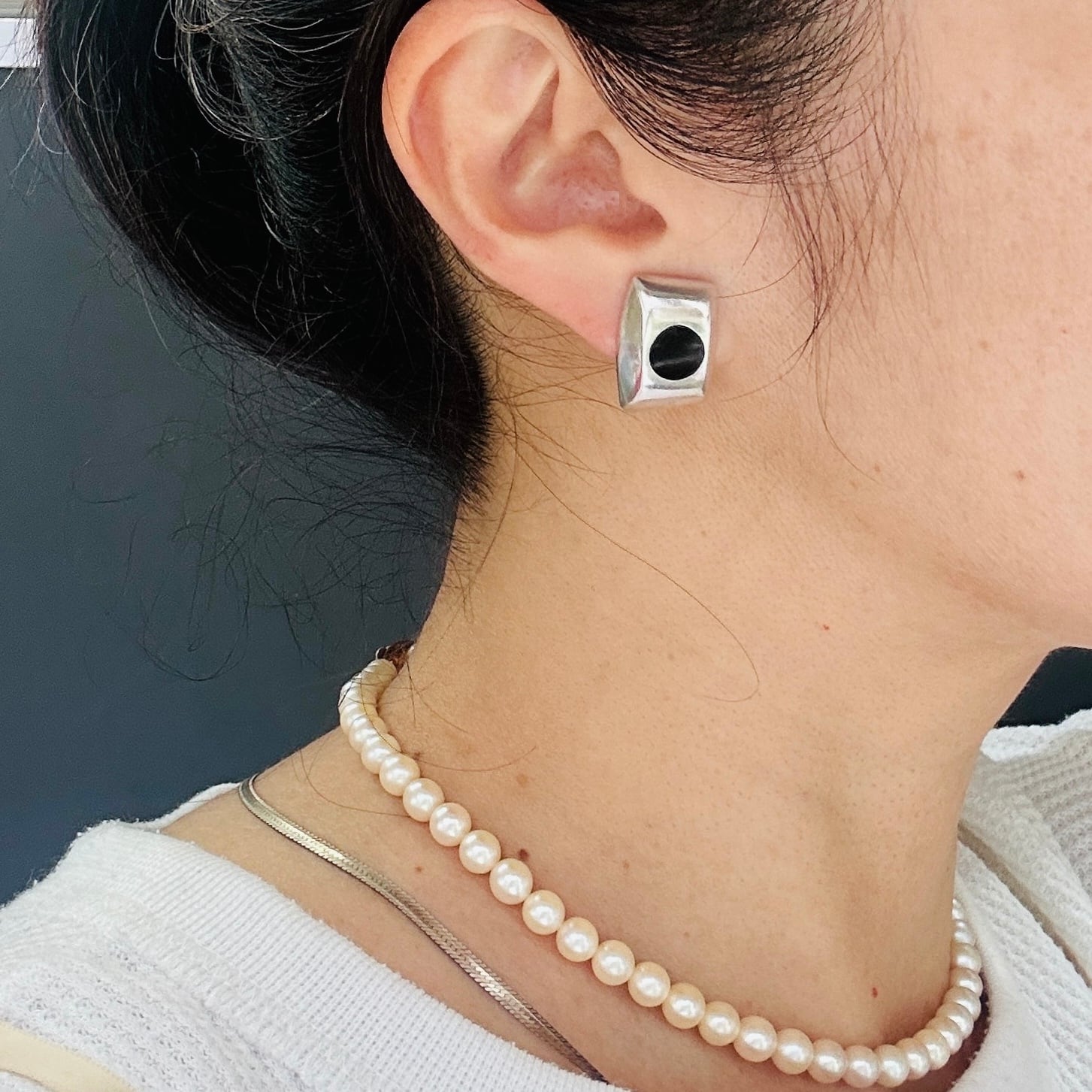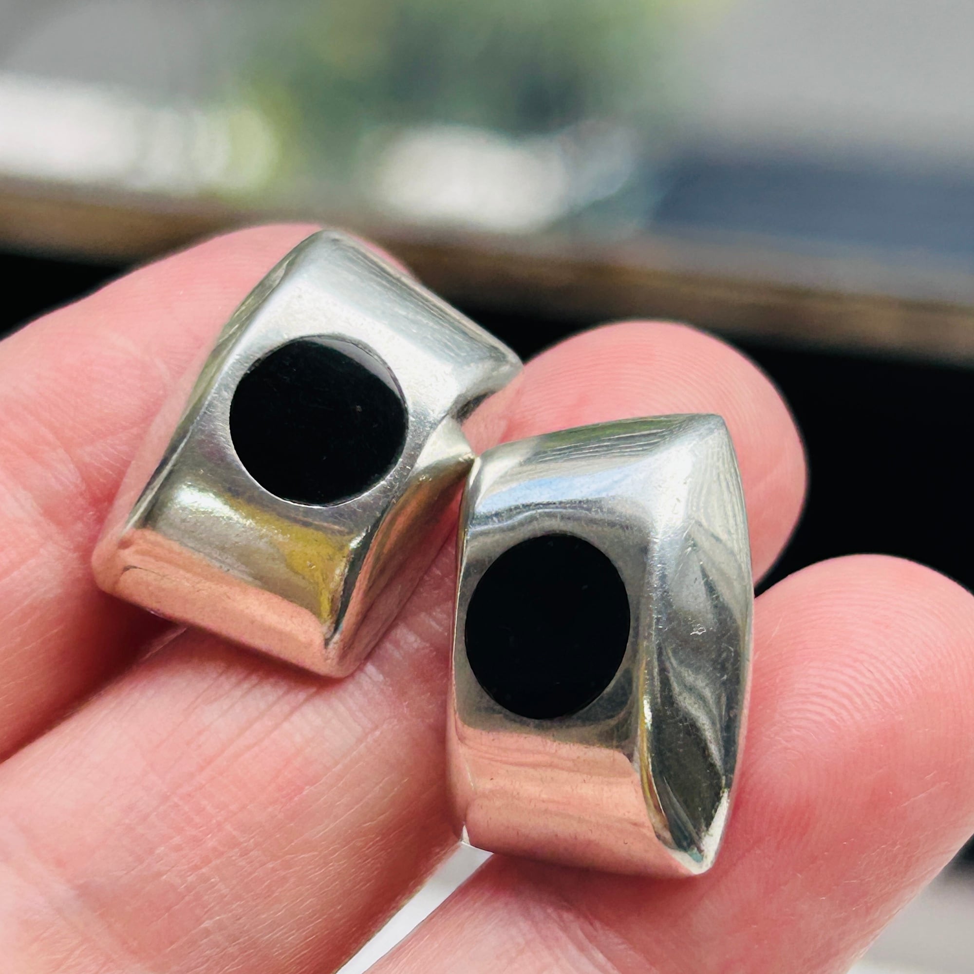 スクエアブロックにオニキスが埋め込まれた幾何学デザインピアス。四角のカタチがユニークです。針が折れていたのでピアス金具を新調しました。金具は金属アレルギー対応金具です。キャッチは大きな円盤がついていてピアスが前に垂れ下がるのを防止してくれます。裏にメキシカンシルバー刻印。