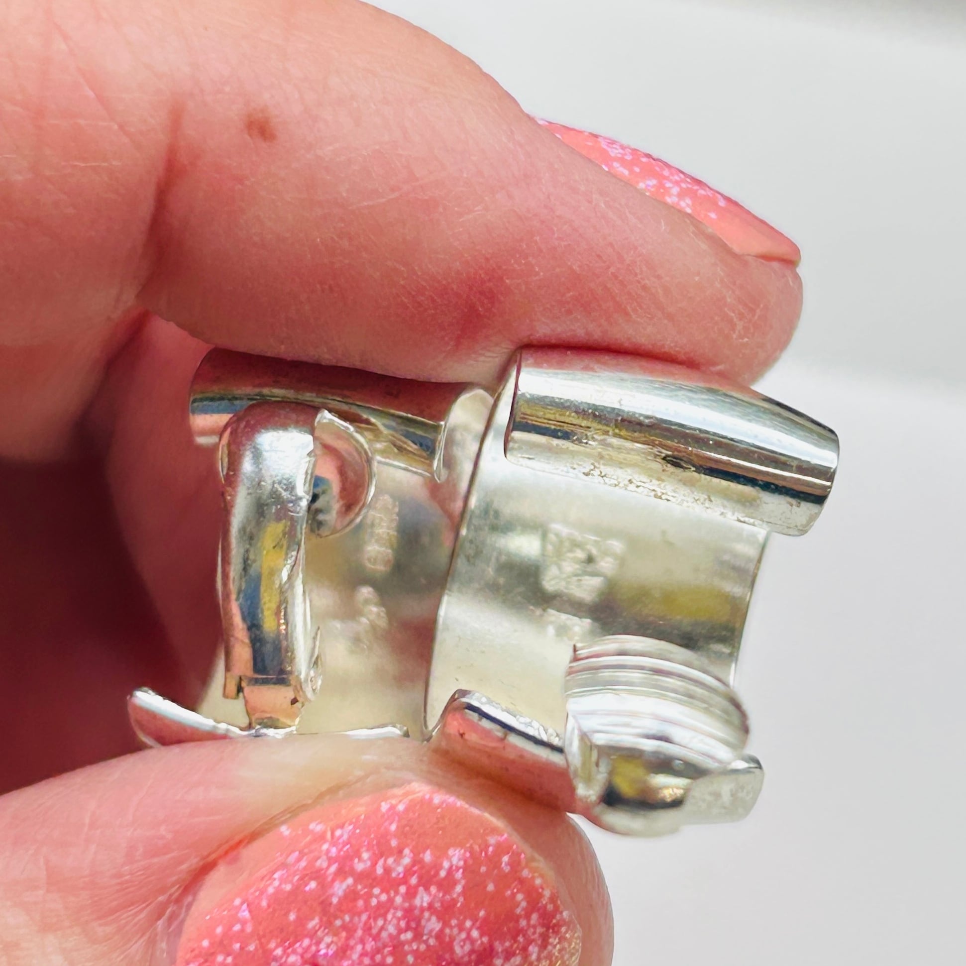 イヤリングタイプのワイドフープ。コロンとしシルバーが耳たぶにカールするように着いてとても可愛いです。ピアスっぽく見えるのもイヤリング派には嬉しいデザインかと思います。写真では表面のスレが分かるように撮影しましたが実物はほぼ気になりません。キラリと輝く光沢あるシルバーです。内側にメーカー名「Fez」「925」刻印。Good Price!