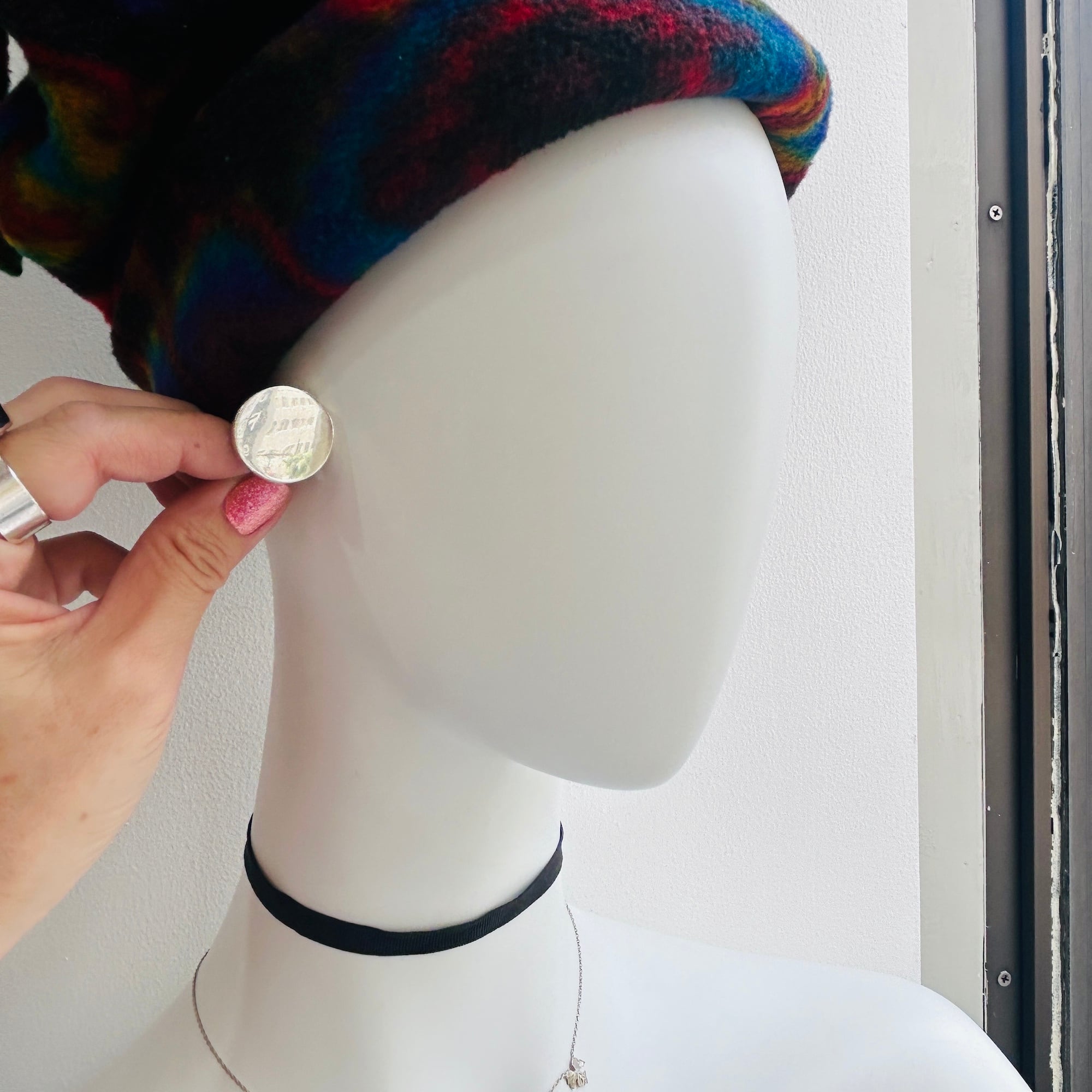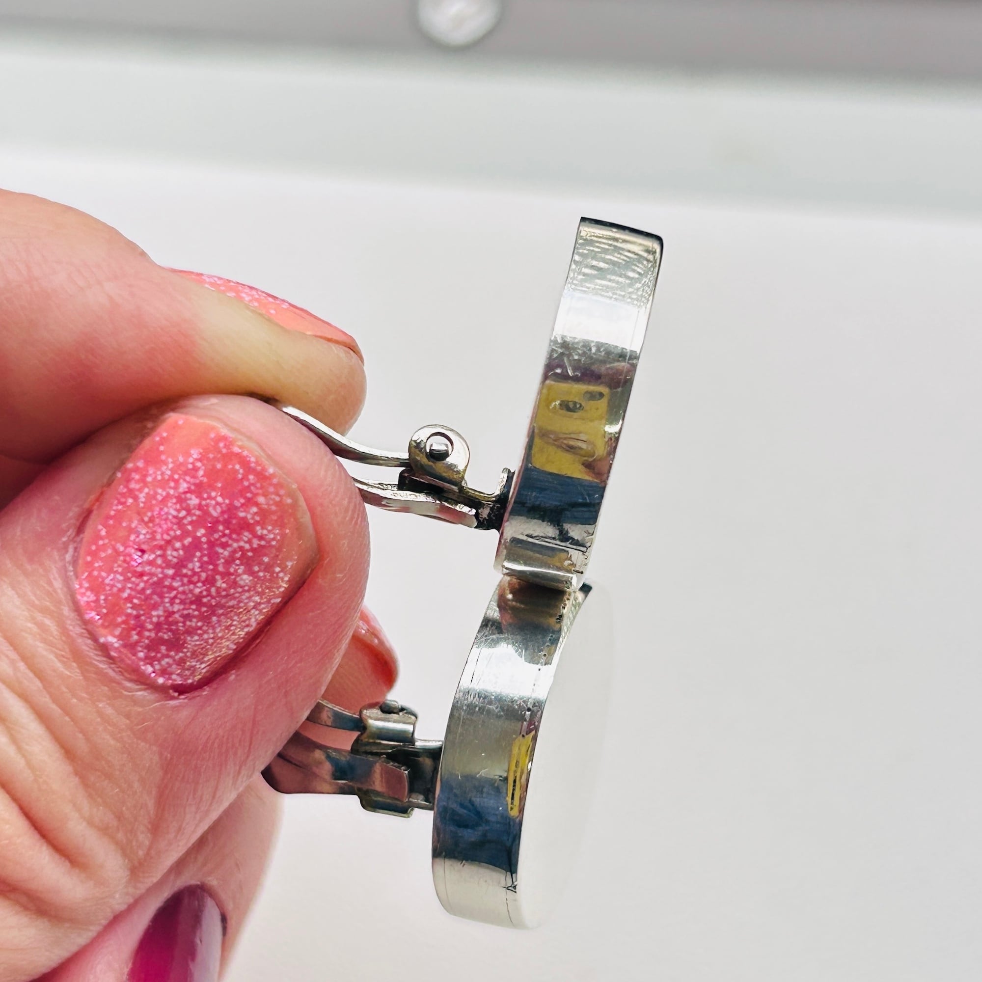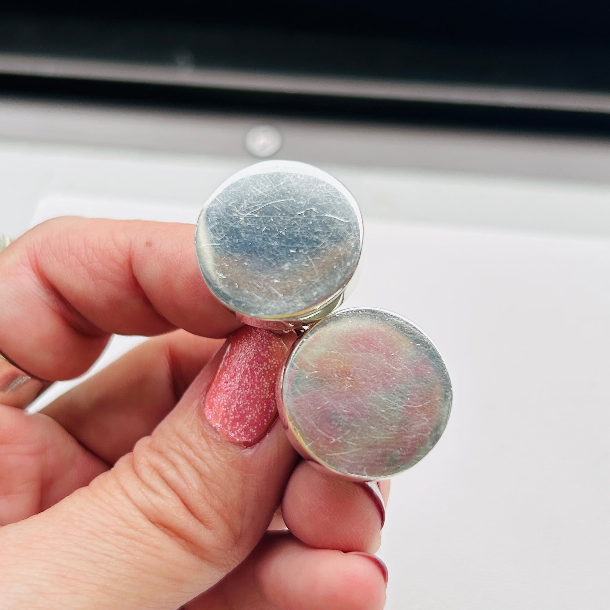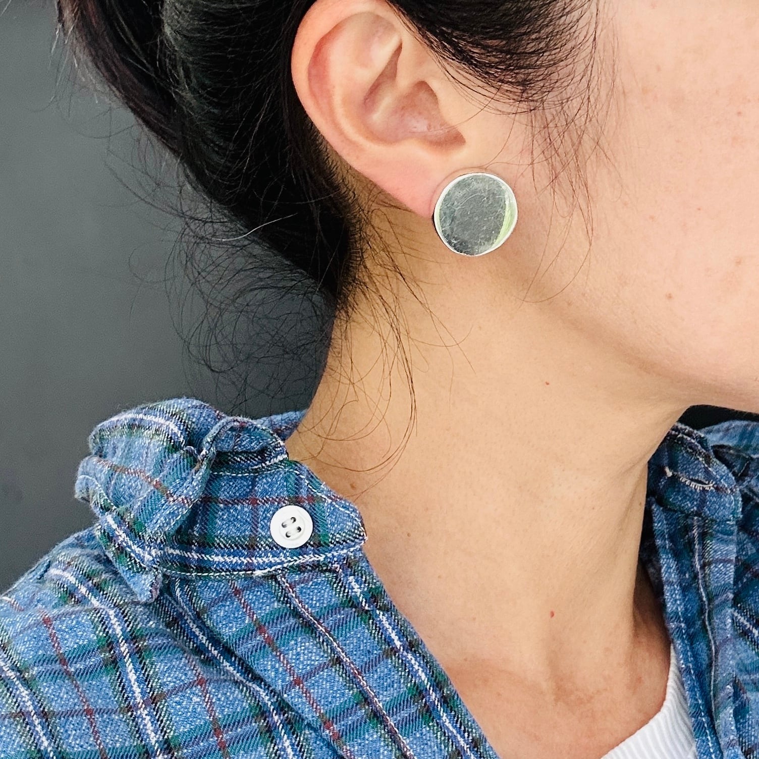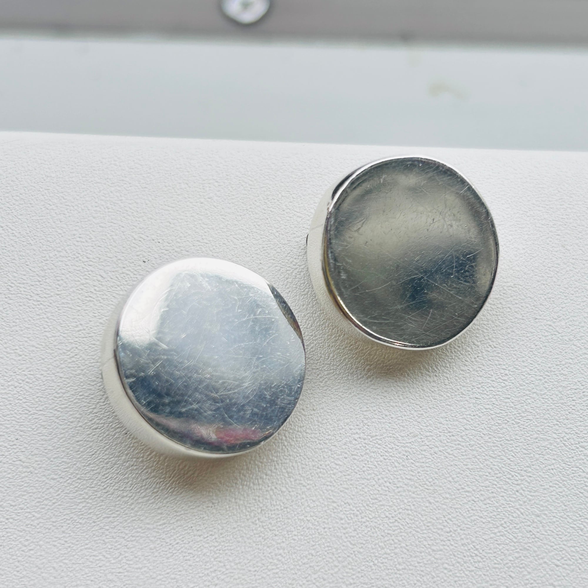 厚みのある丸型イヤリング。北欧っぽいモダンなデザイン。私のお気に入りリングとセットのようなデザインです:):)表面にスレありますが普通のヴィンテージシルバーコンディションです。裏に「925」刻印。着け心地GOODです。