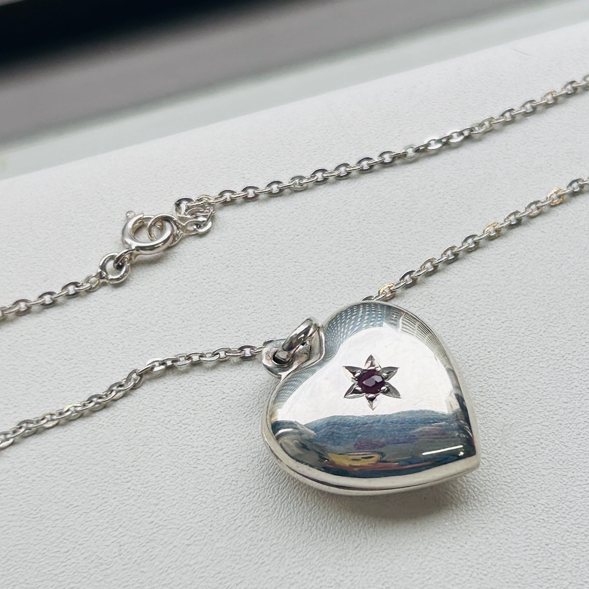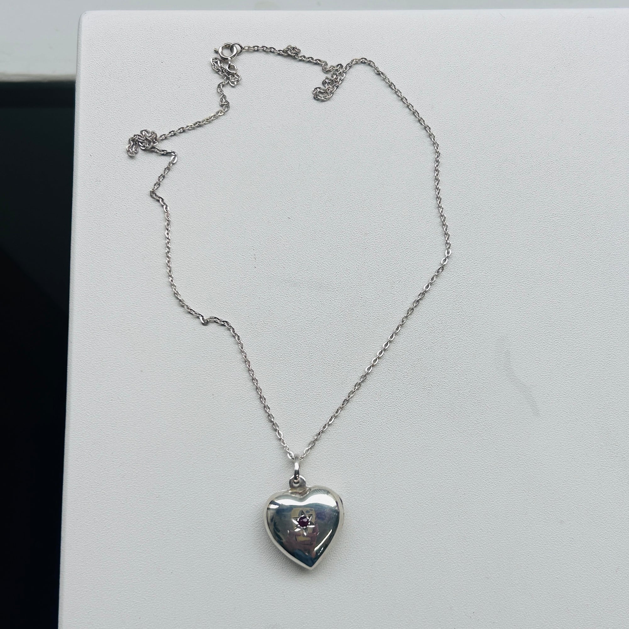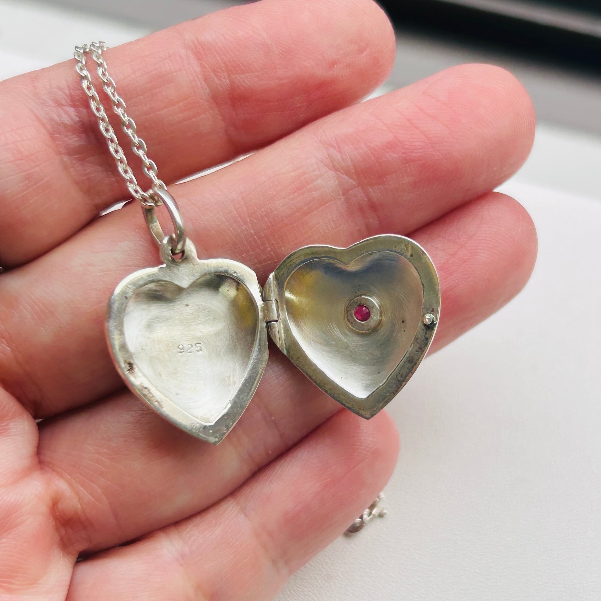 フランスから届いたハートロケット。細かく目の詰まったアズキチェーンにルビー付きのハート型ロケットチャームがついています。ロケットの中は何も入っていません。「925」刻印のみ。正面中央にスターバーストの彫りにルビーがセットされています。ロケットの開閉に問題ありません。楕円ロケットはロウ付けされているので開くことはできません。内径約5mm x4mmと大きめ。太チェーンと合わせるとキュート、ロングチェーンにこれくらいの小さなハートがついているのもユニークなバランスで個性的だと思います。チェーンにフランスメーカーマーク。