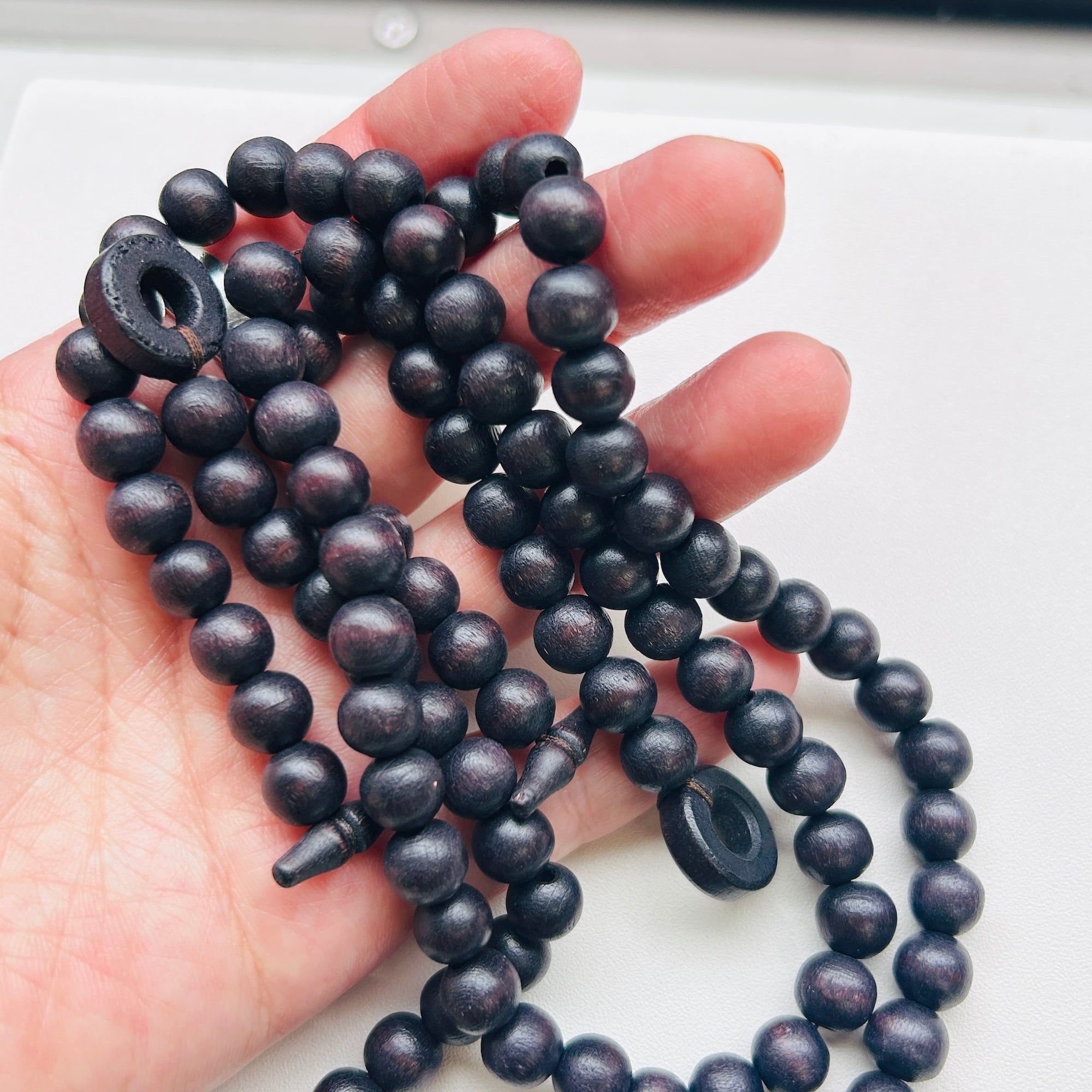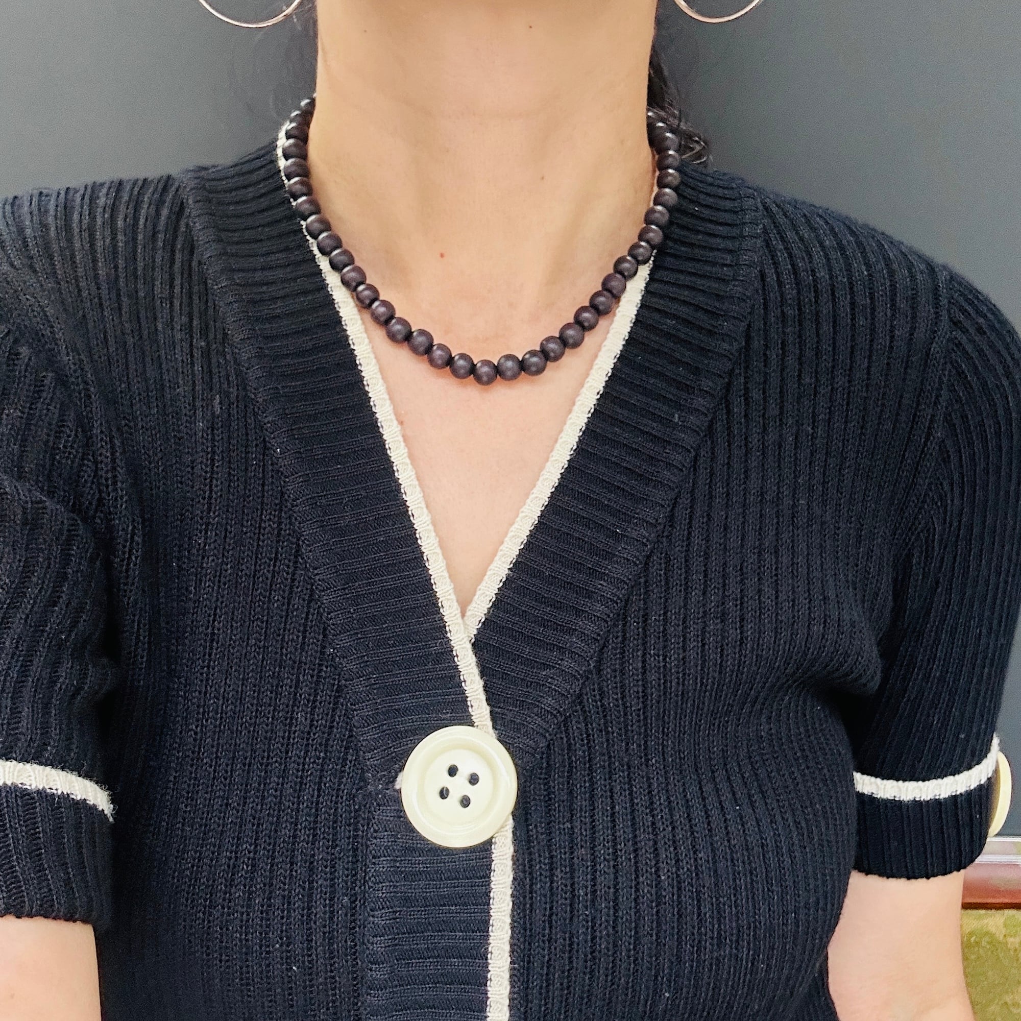 創業1954年、フィンランド、Aarikka(アーリッカ)のウッドネックレス。黒く染色された直径8mmの白樺ウッドビーズ。全て職人さんのハンドメイドで手染めです。木の風合いが残った優しい発色が魅力(写真8参照)。トグル留め具も可愛い。ニーズの中は糸が通っています。こちらは1970〜80年頃、日本に輸入され関西の百貨店で販売されていたお品物で、長い間保管されていたDEADSTOCKです。もう日本国内に正規販売店はありません。是非この機会にアーリッカジュエリーをお試し下さい。モードなデザインで非常に軽く着け心地抜群です。現在在庫2点。1点のお値段です。