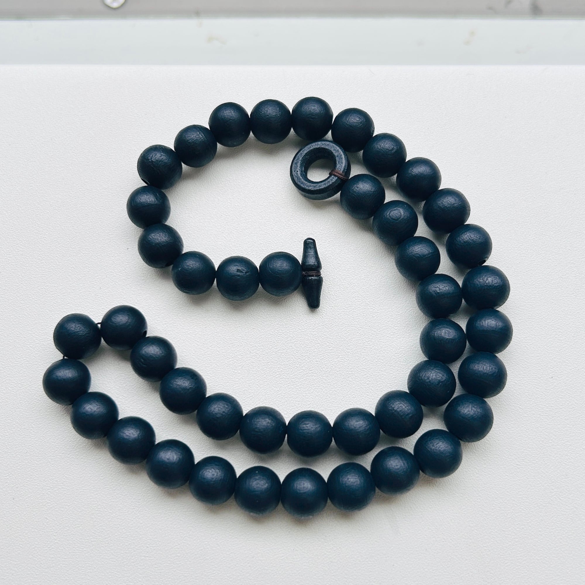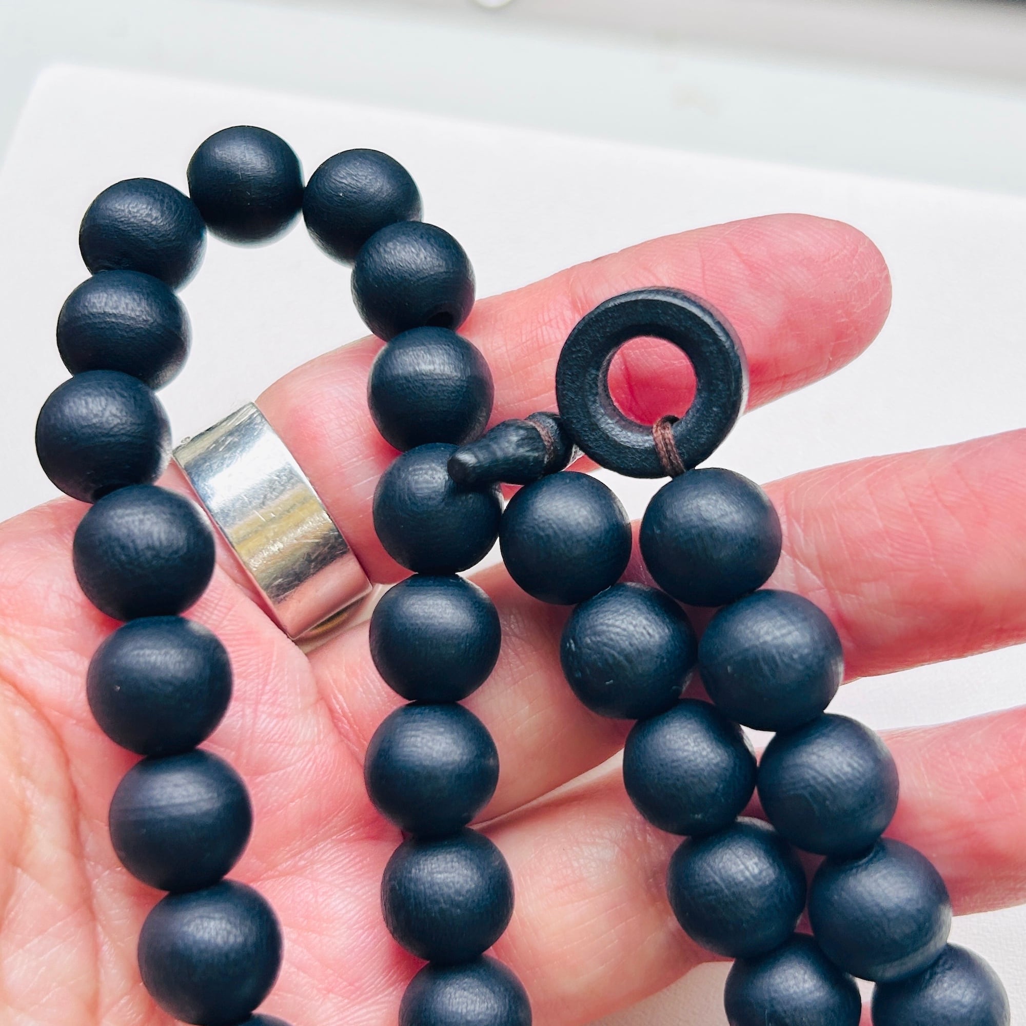 創業1954年、フィンランド、Aarikka(アーリッカ)のウッドネックレス。黒く染色された直径10mmの白樺ウッドビーズ。全て職人さんのハンドメイドで手染めです。木の風合いが残った優しい炭クロカラー(写真6参照)。トグル留め具も可愛い。ニーズの中は糸が通っています。こちらは1970〜80年頃、日本に輸入され関西の百貨店で販売されていたお品物で、長い間保管されていたDEADSTOCKです。もう日本国内に正規販売店はありません。是非この機会にアーリッカジュエリーをお試し下さい。モードなデザインで非常に軽く着け心地抜群です。