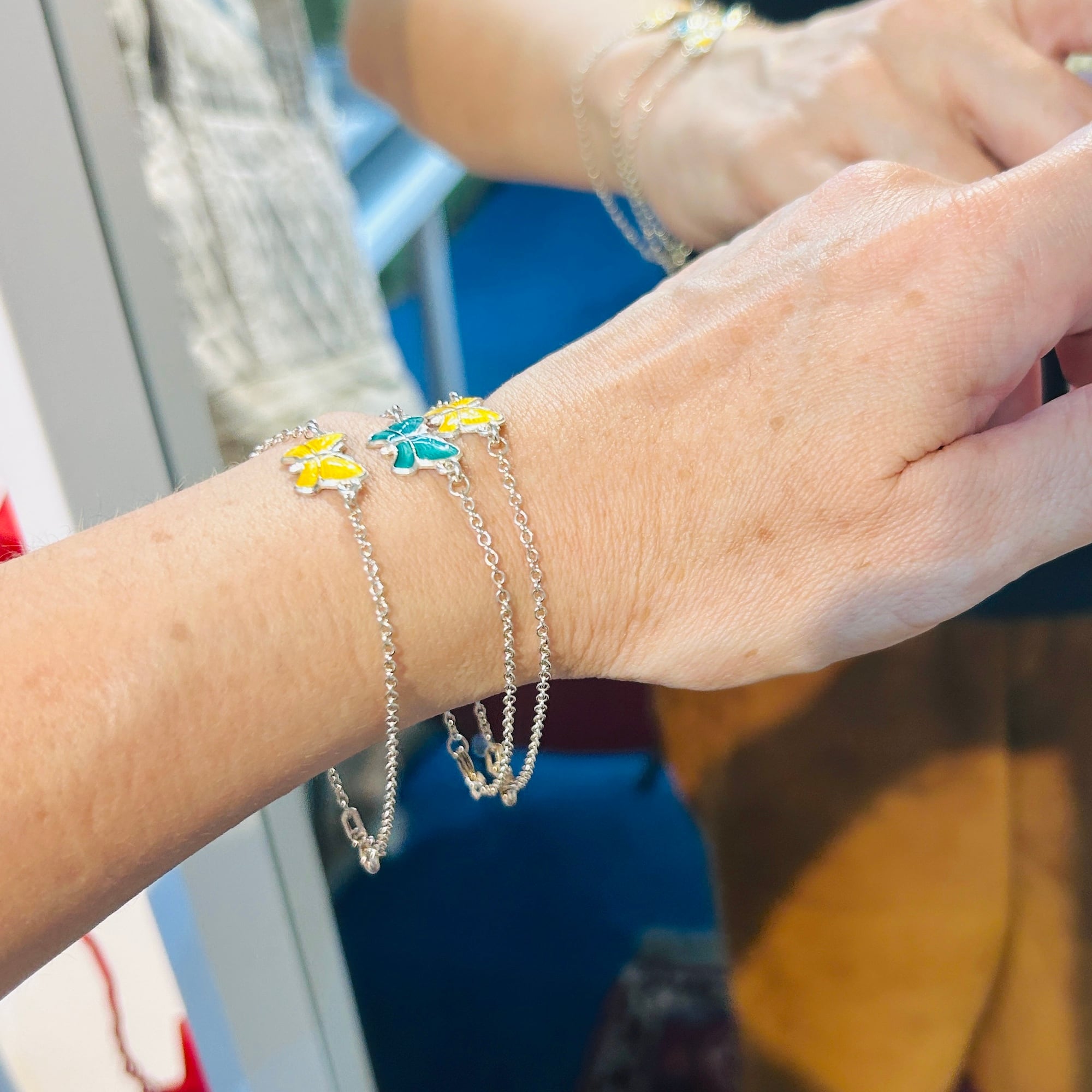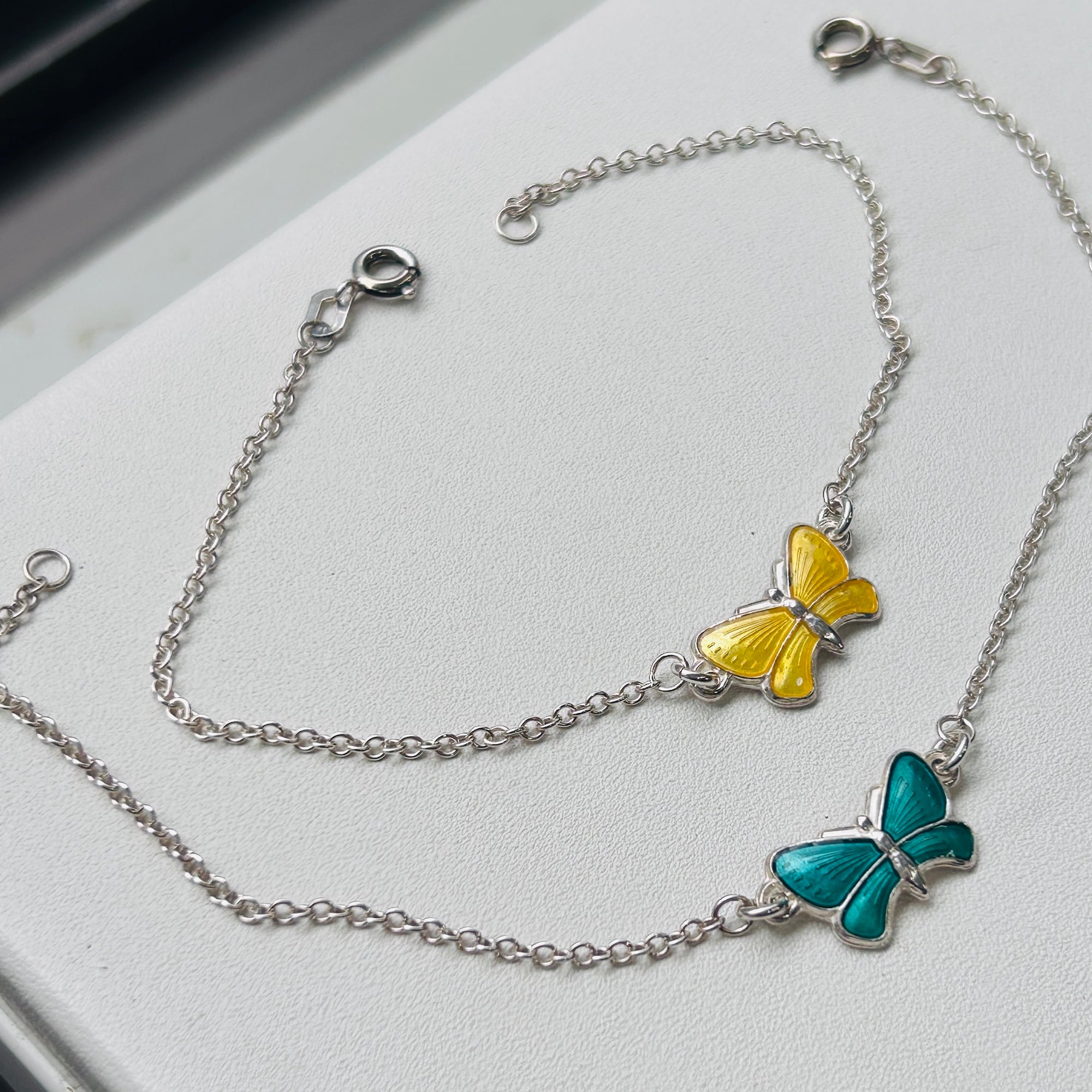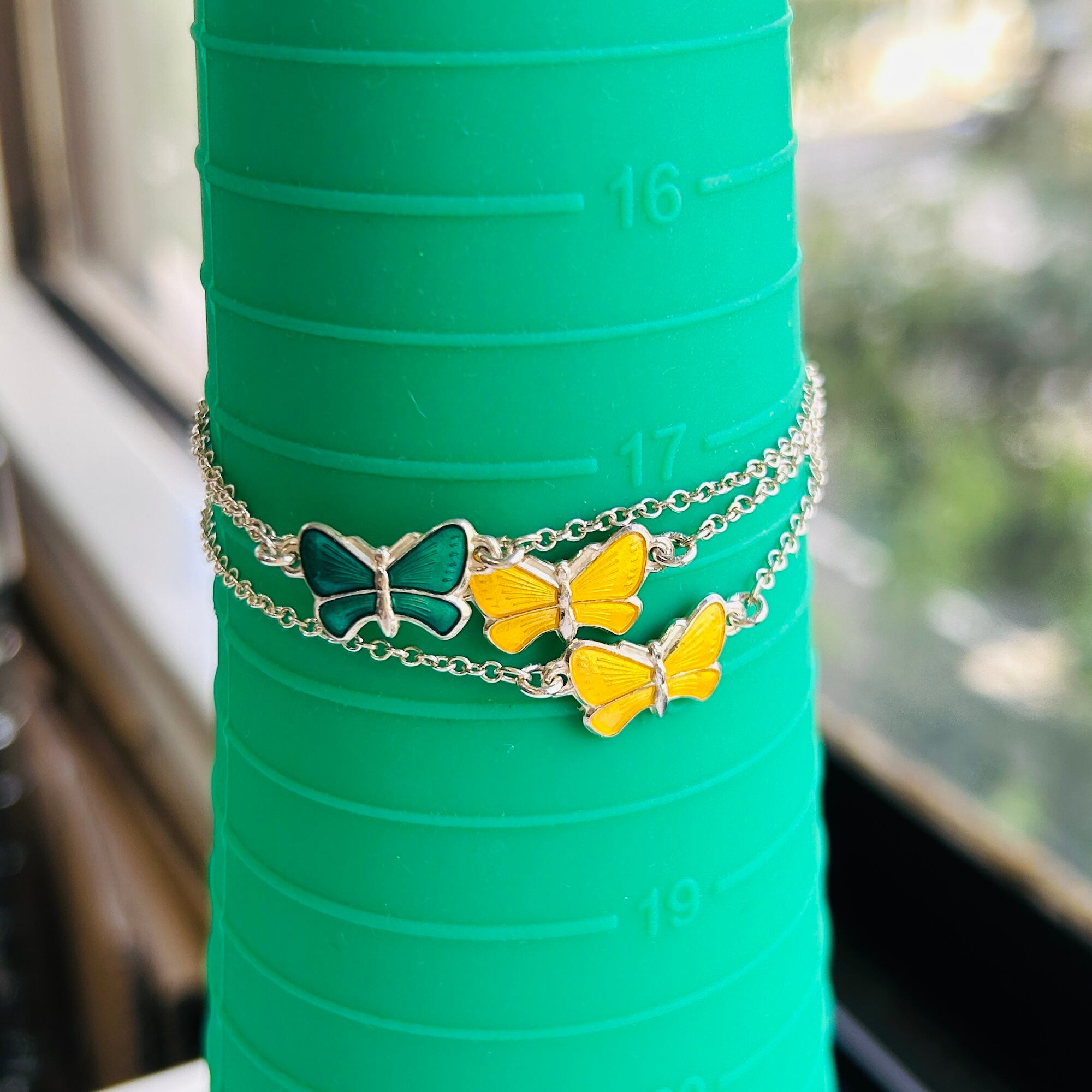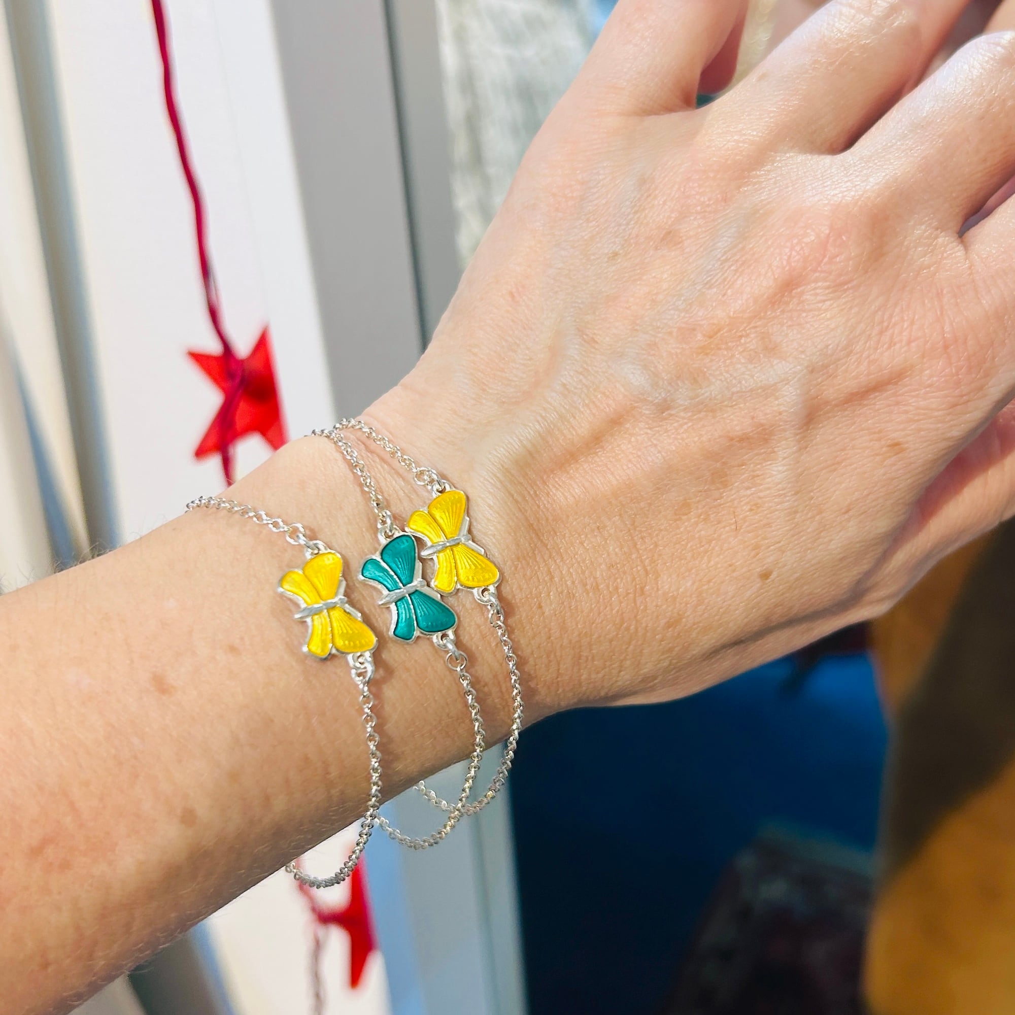 ノルウェーのジュエリー作家、Arne Nordlie(アーネ・ノールリー)によるブレスレット。シルバーチェーンにワンポイントの蝶モチーフ。鮮やかなエナメル加工を施したブレスレットです。ノルウェーの七宝(エナメル)ジュエリーで有名なギヨシェ(Guilloché)技法の美しい蝶です。グリーンの蝶は右側に引き輪、イエローは在庫2本、どちらも左側に引き輪がついています。蝶の裏にArne Nordlieマーク、「925S」、引き輪ヨコに「835」刻印。ですのでチェーン部分はシルバー835です。