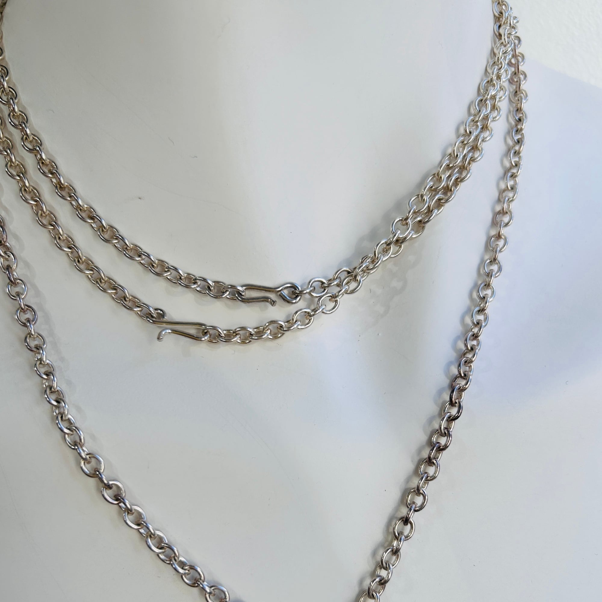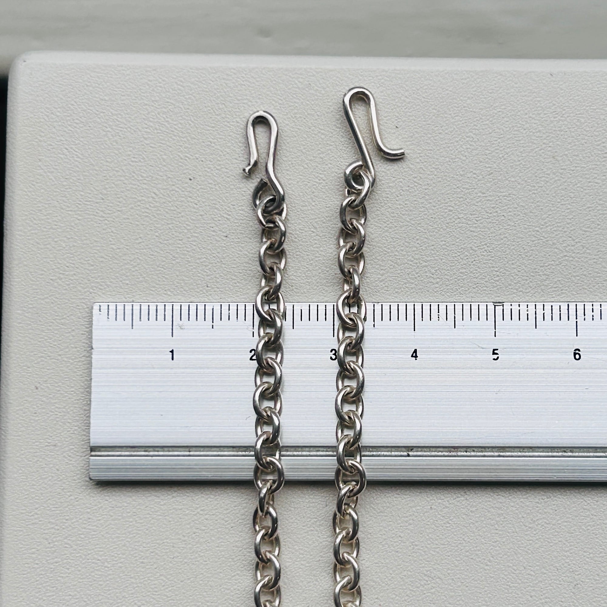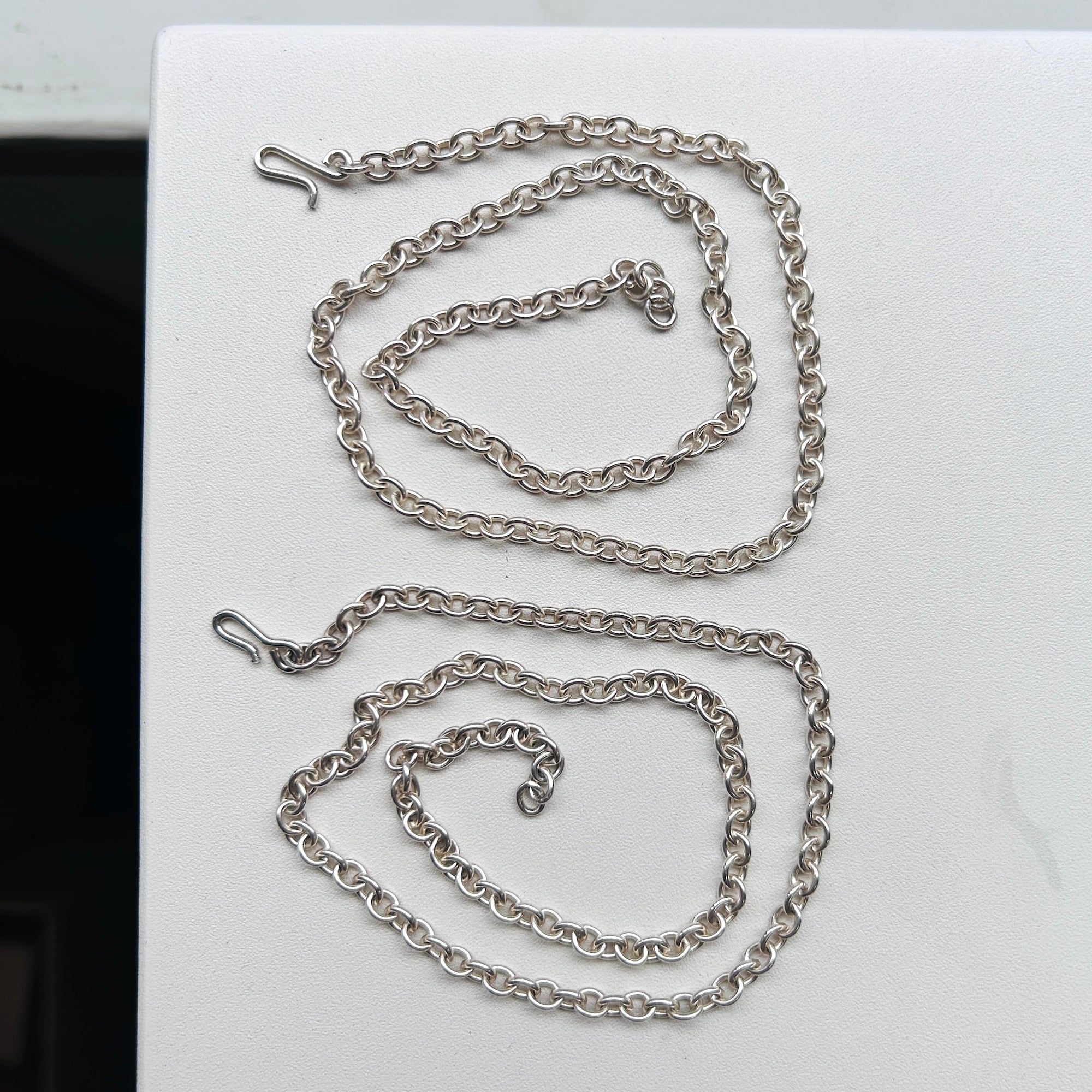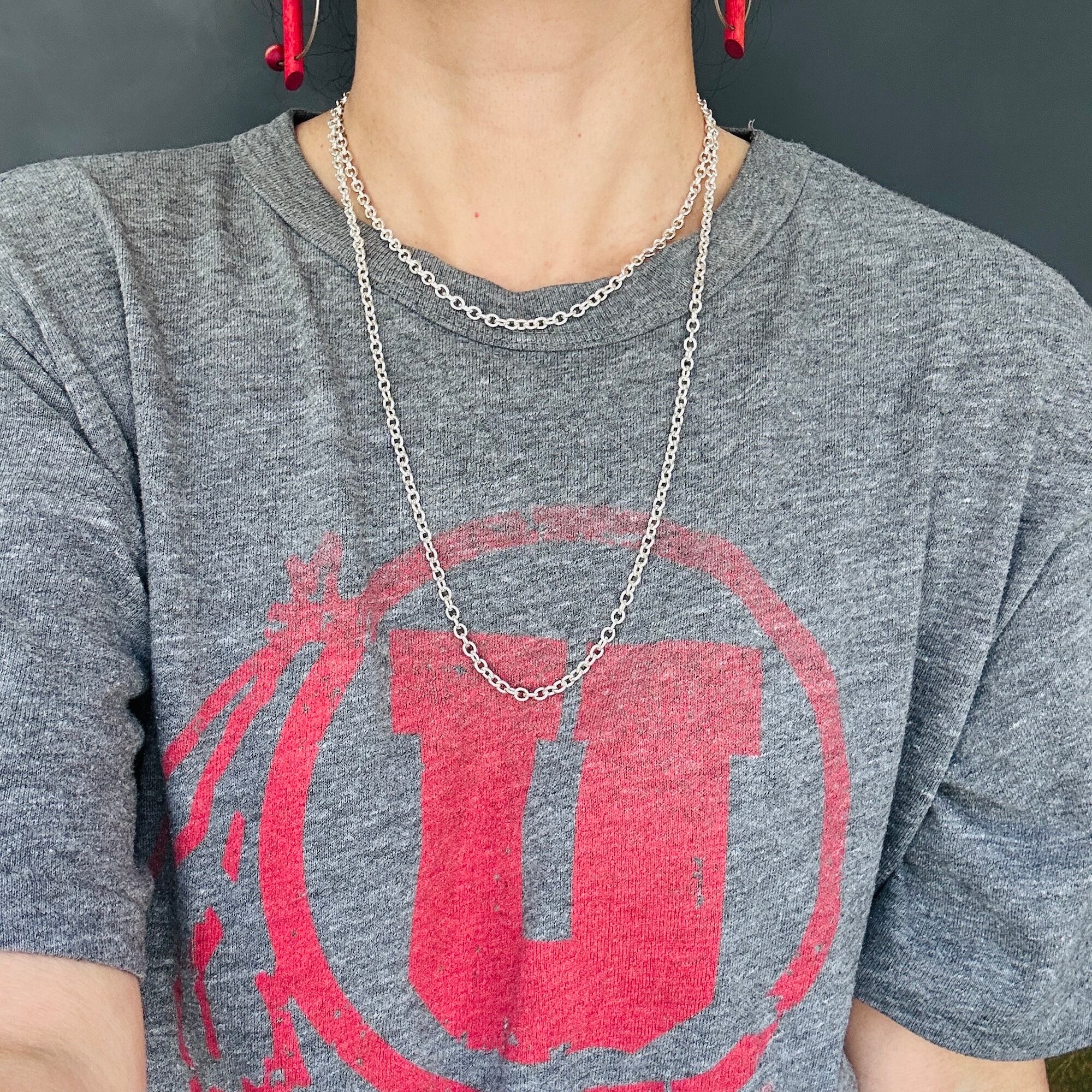 スウェーデン・ストックホルムの Rey Urban(レイ・ウルバン)ストアより直接輸入されたユティリティチェーン。程よい太さのアズキチェーンに引っ掛け金具の極シンプルな作り。単体だとスタイリッシュ、チャームとの相性も抜群。チャームを際立ててくれる品格あるチェーンです。金具のカタチはそれぞれ微妙に異なります。チェーンコマは全てロウ付けされています。引っ掛け金具は一番端っこのコマのみ引っ掛けることが可能で長さの調整はできません。(長い方のチェーンはどこにでも引っ掛けることができるので金具形状の違いかなと思いますが、詳しく解明できません)。引っ掛け金具を首の後ろから前に持ってきて取り外しがやりやすいです。現在在庫2本、長さが5mmほど違います。*シルバーアクセサリーはこちらのような留め具がないタイプが一番扱いやすいので強くオススメします。留め具は消耗しますので緩んだり、動きが悪くなってきます。その点、引っ掛け金具は金属疲労の心配がありません:)