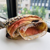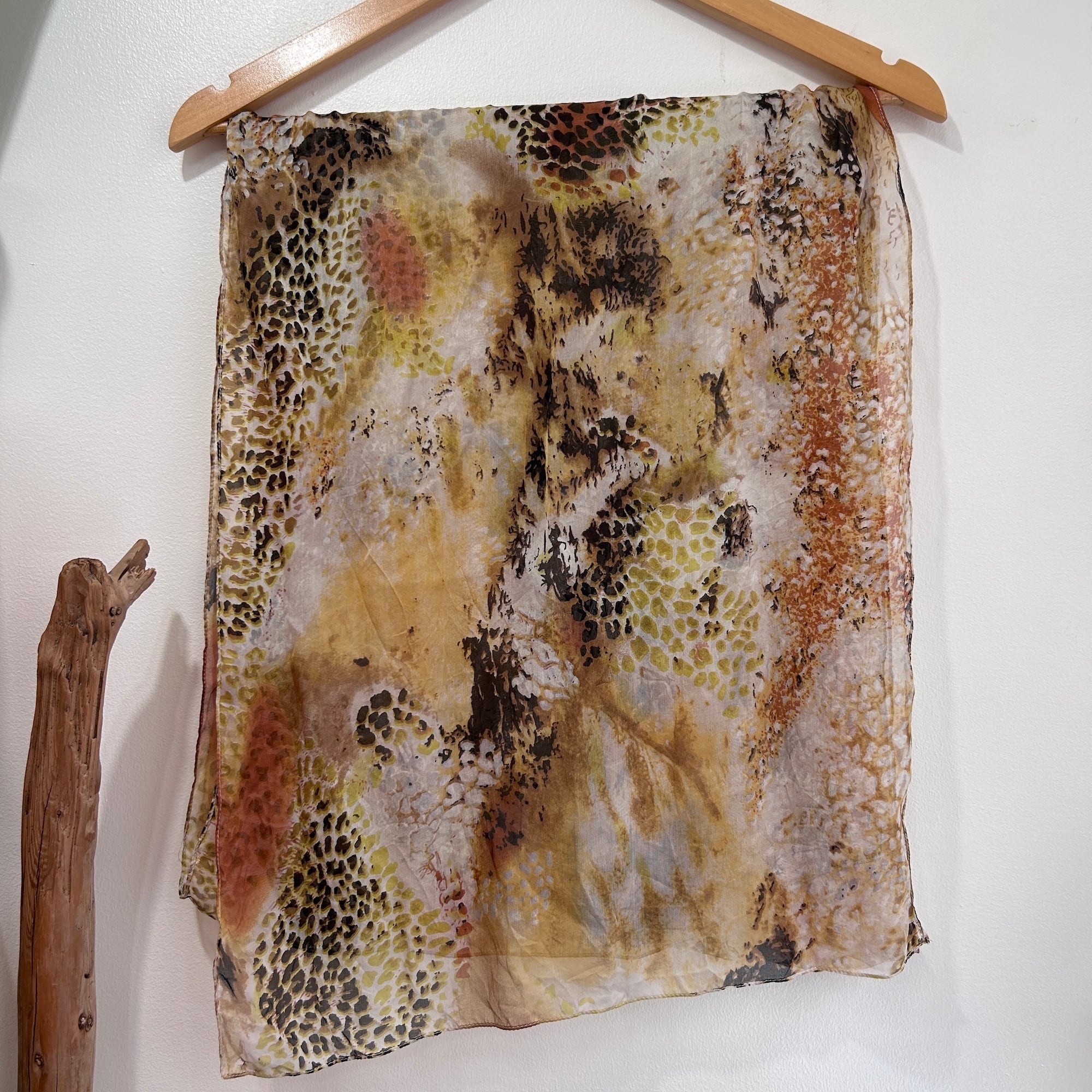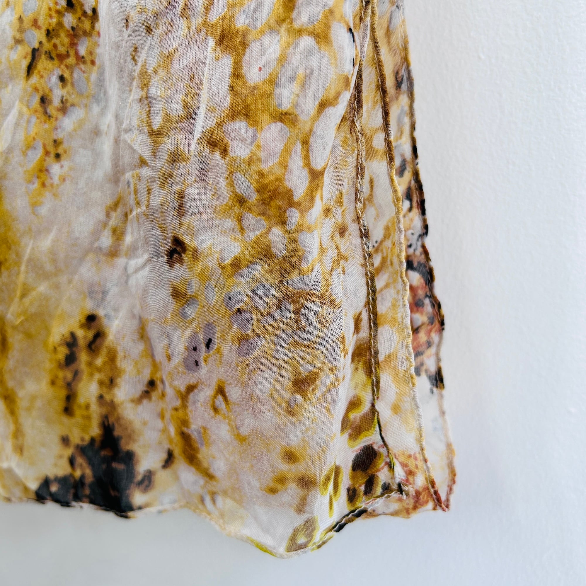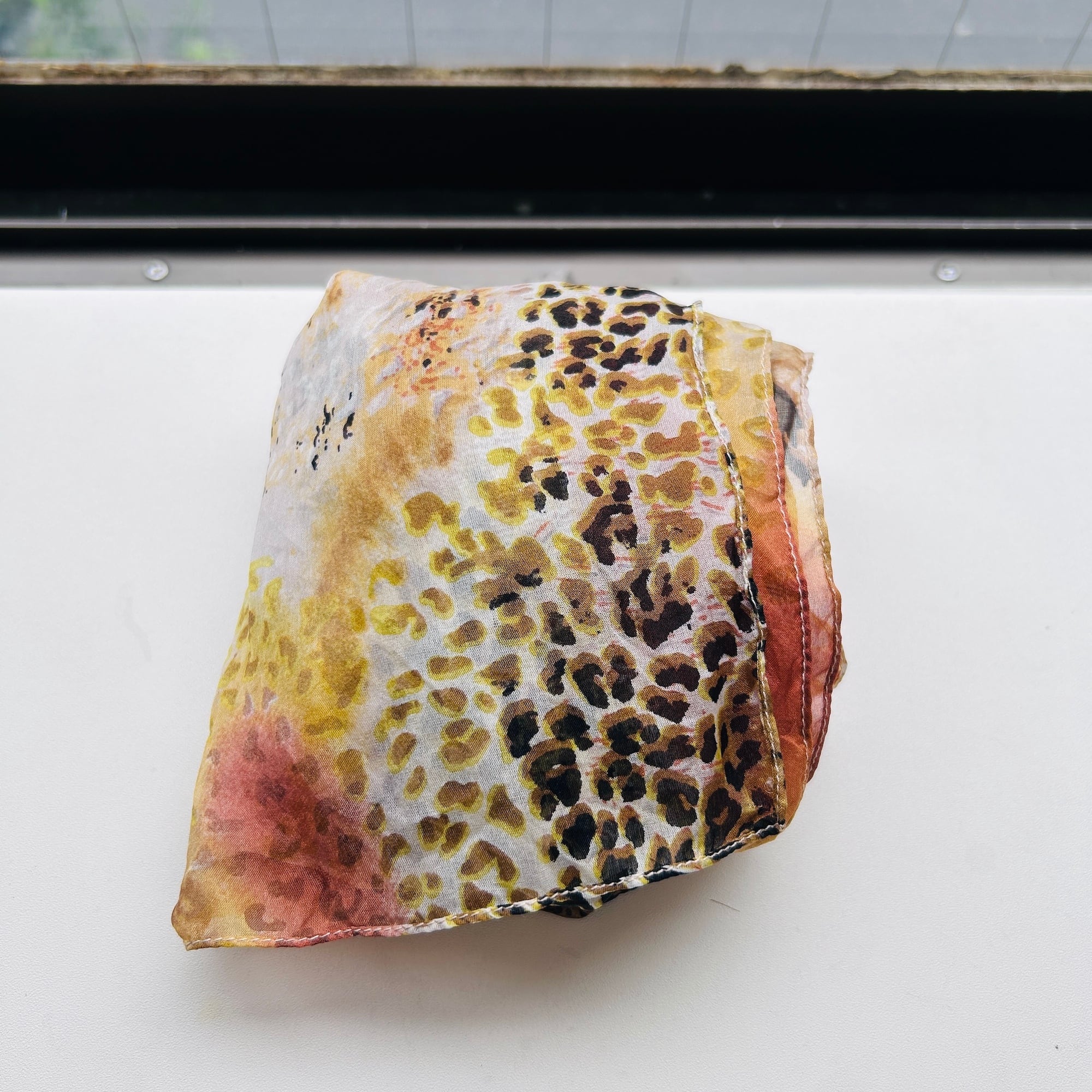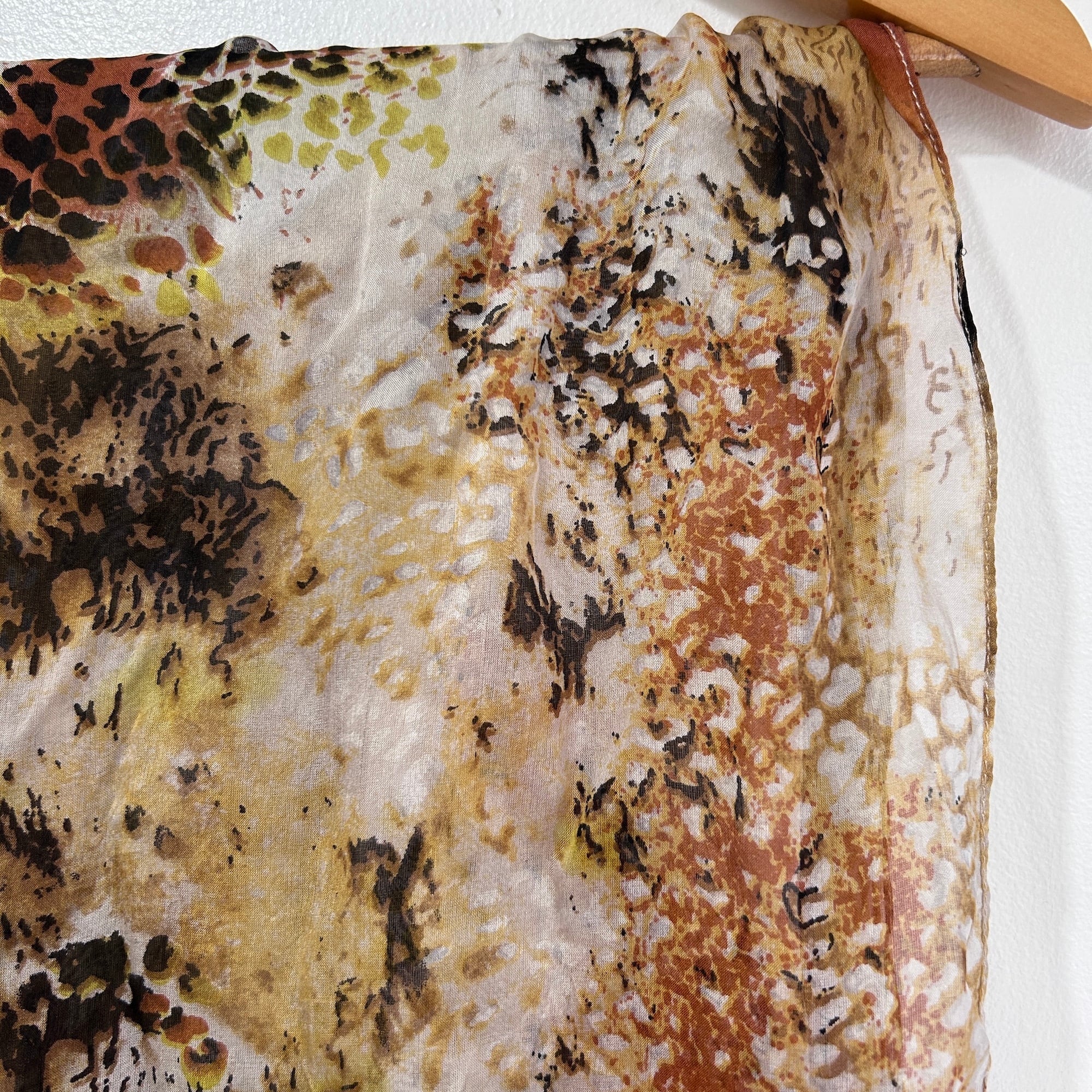 総プリントのシフォンスカーフ。レオパードと水彩が混ざり合った幻想的なアニマルプリントです。柔らかくて肌触りもすごく気持ちいいです。大きなサイズで旅行にも便利そう。特筆すべきダメージはありません。シフォンなのでシワは気になりませんがディスプレイしているので多少のシワはあります。お店にアイロンがないので申し訳ないですが現状のままお届け致します。