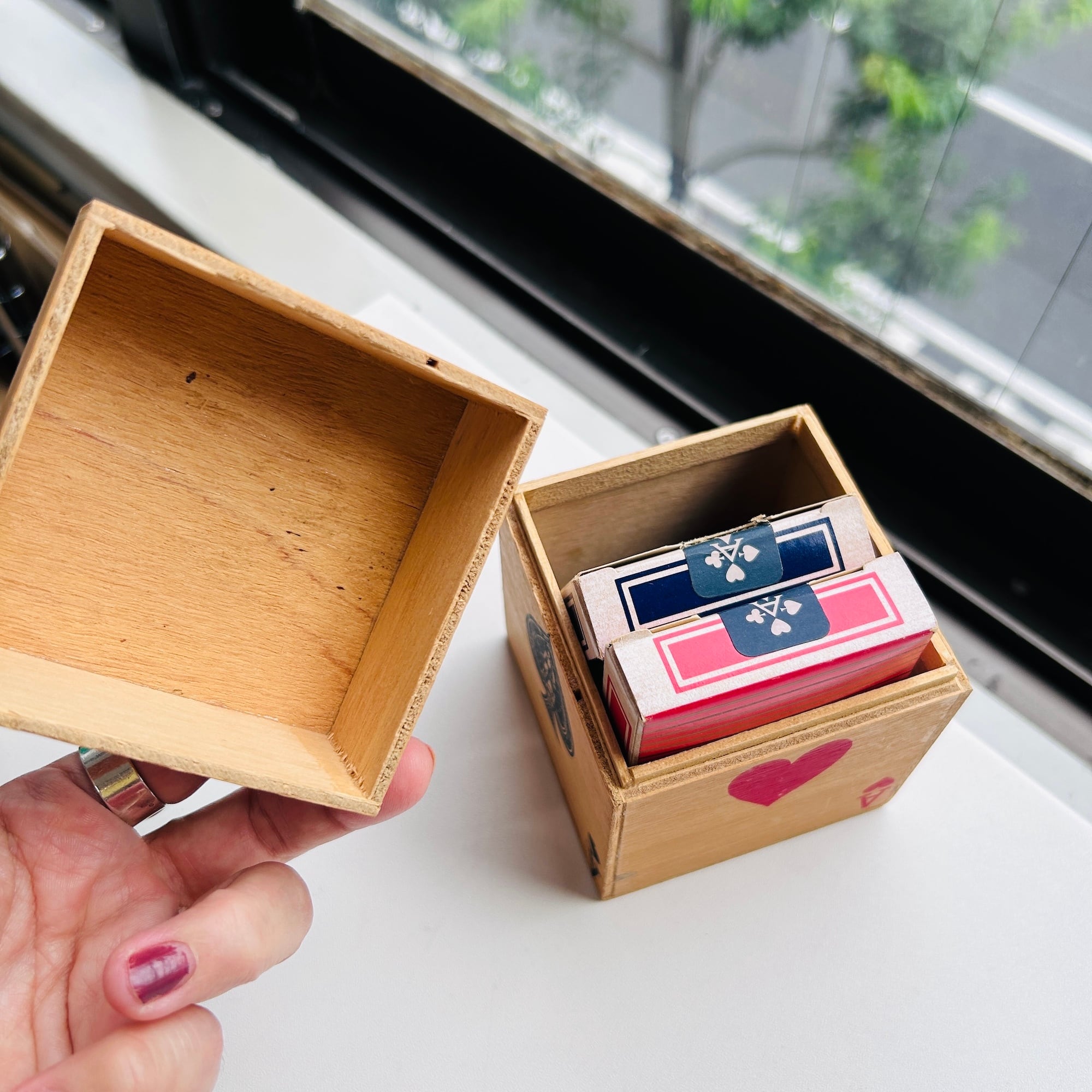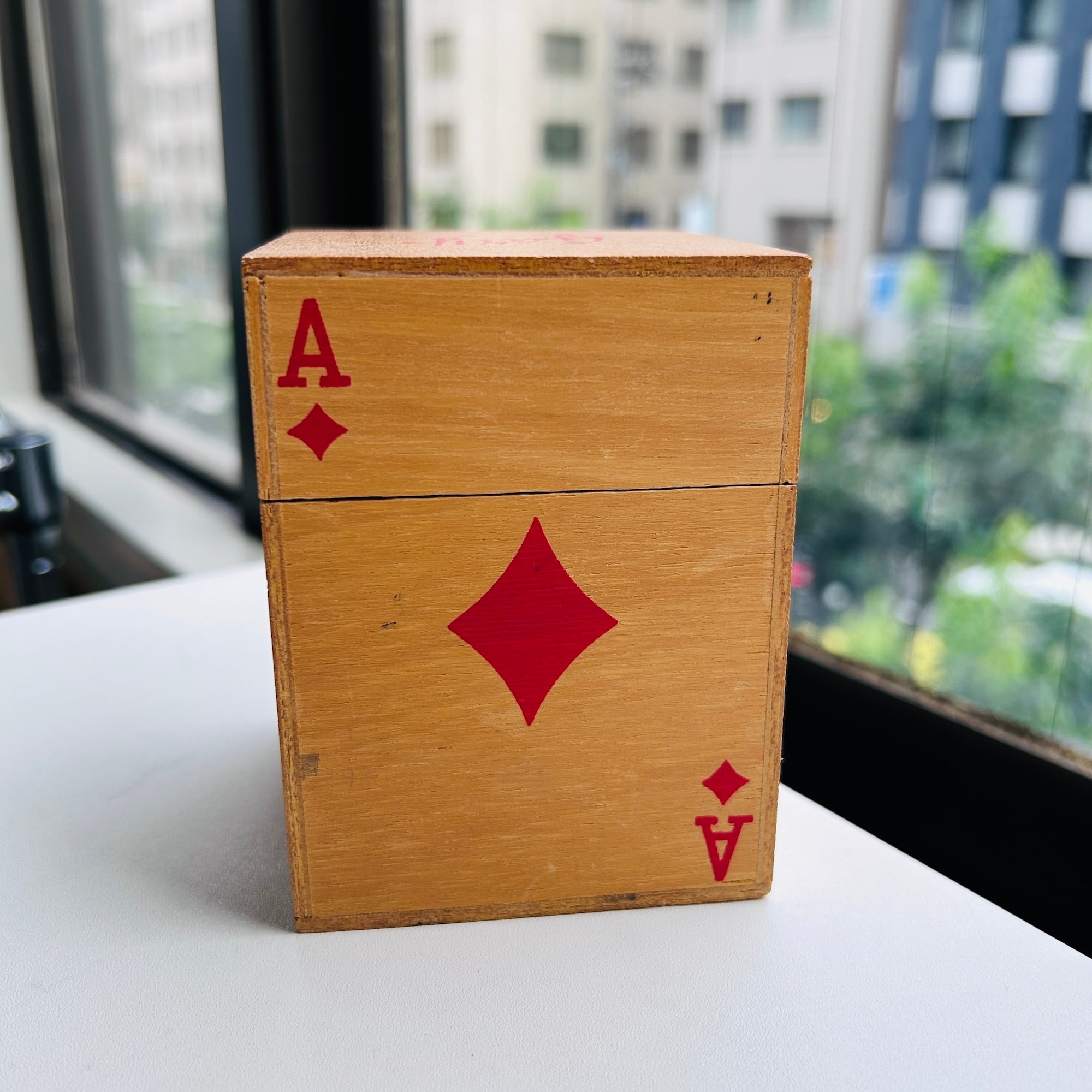 トランプ絵柄の木箱にトランプが2セット入っています。木箱は比較的薄い作りで軽いです。木箱底に「MADE IN TAIWAN」シール。2つあるトランプのうち1つは未開封。トランプ紙箱にデルタ航空のロゴ、1980年代のロゴです。開封済みのトランプについて、カードが揃っているか確認していません。アメリカヴィンテージ雑貨がお好きな方、バーなどを経営されている方、トランプ好きな方、いかがでしょうか。