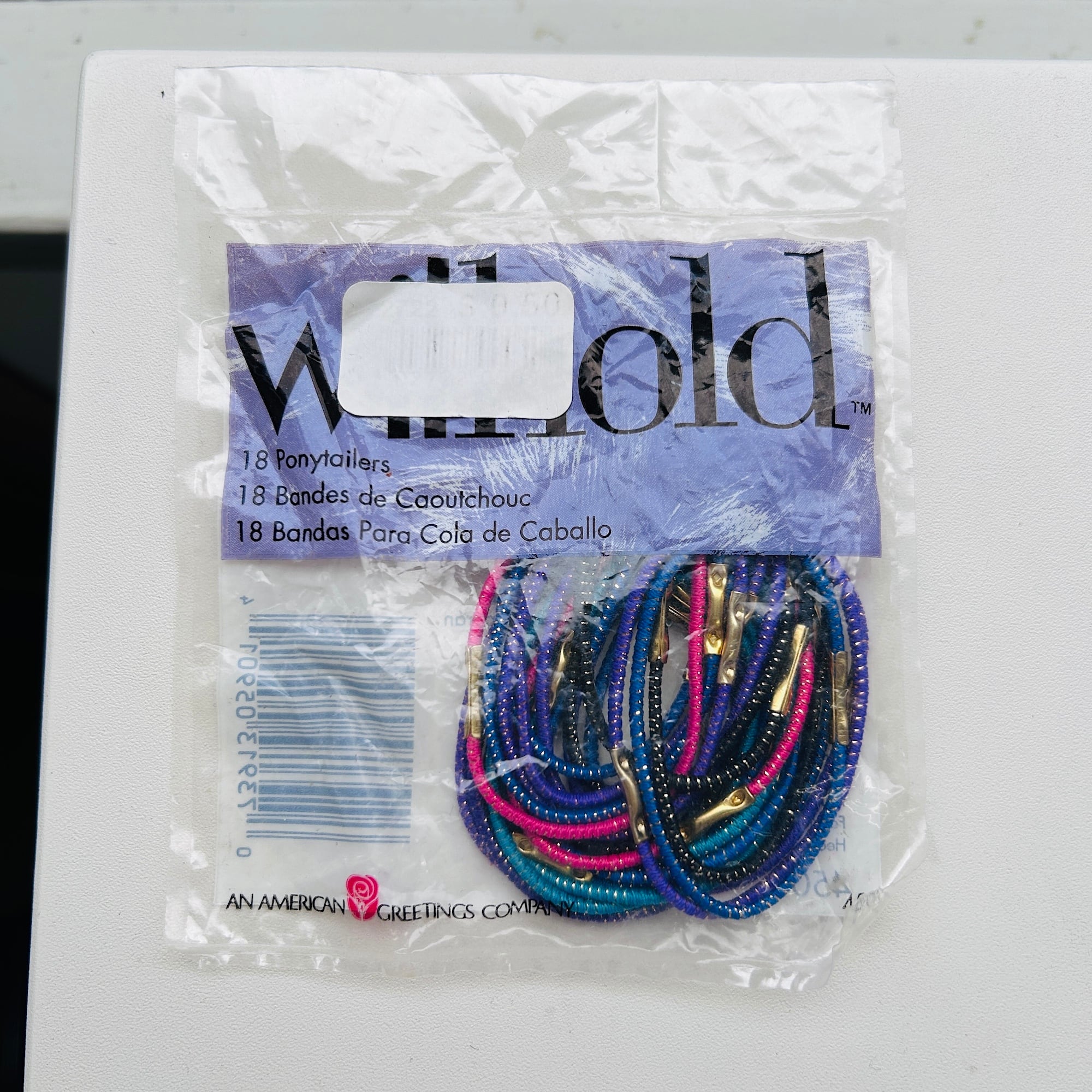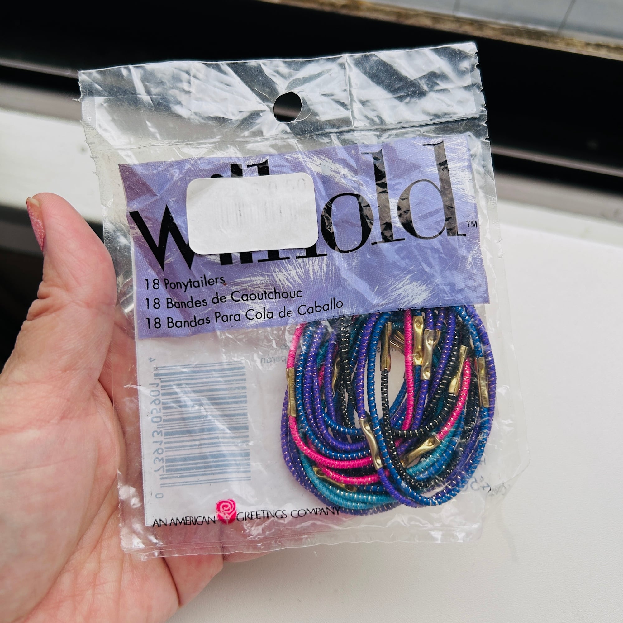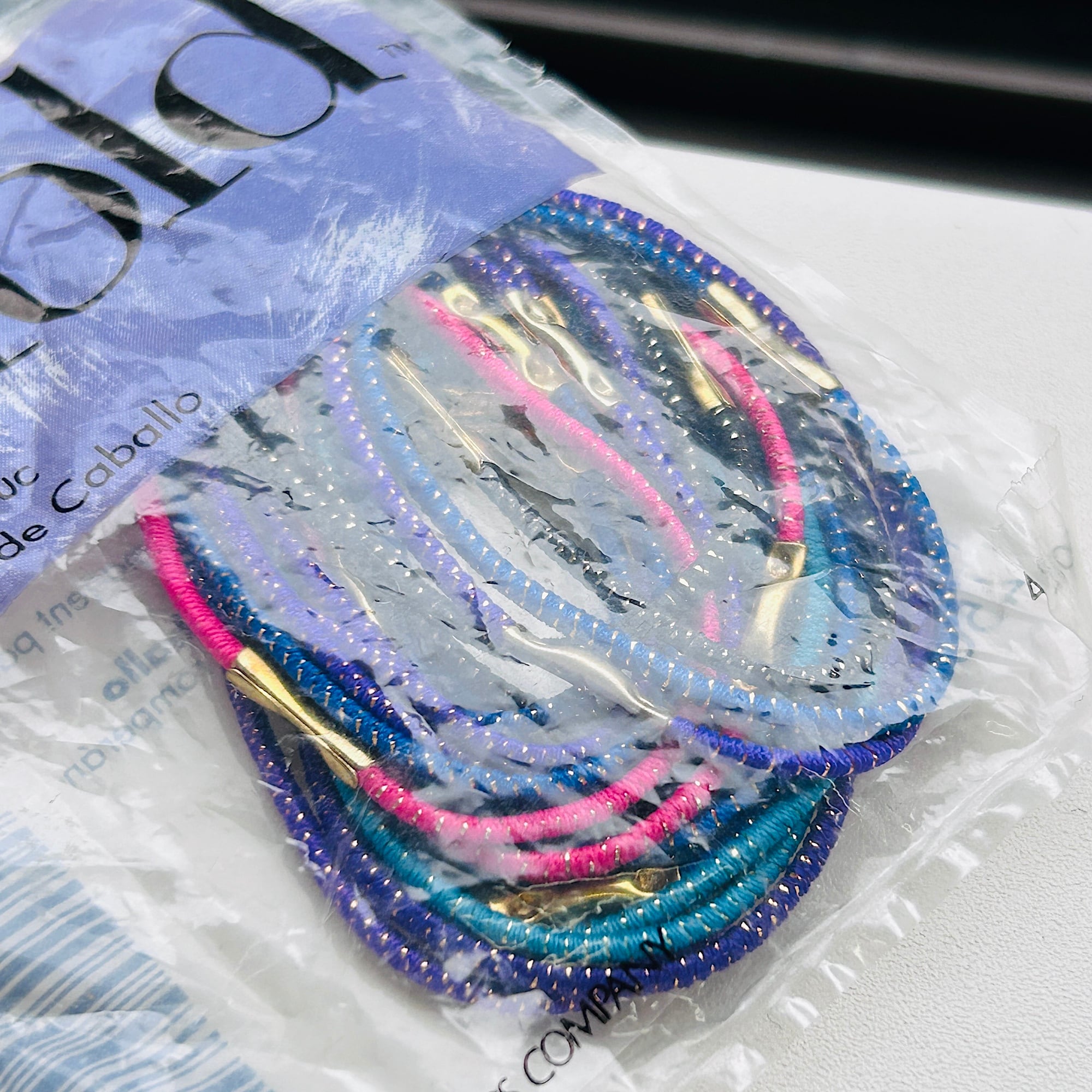 袋に入ったまま、未開封のヘアゴム。細いラメ入りカラーゴム18本入りです。