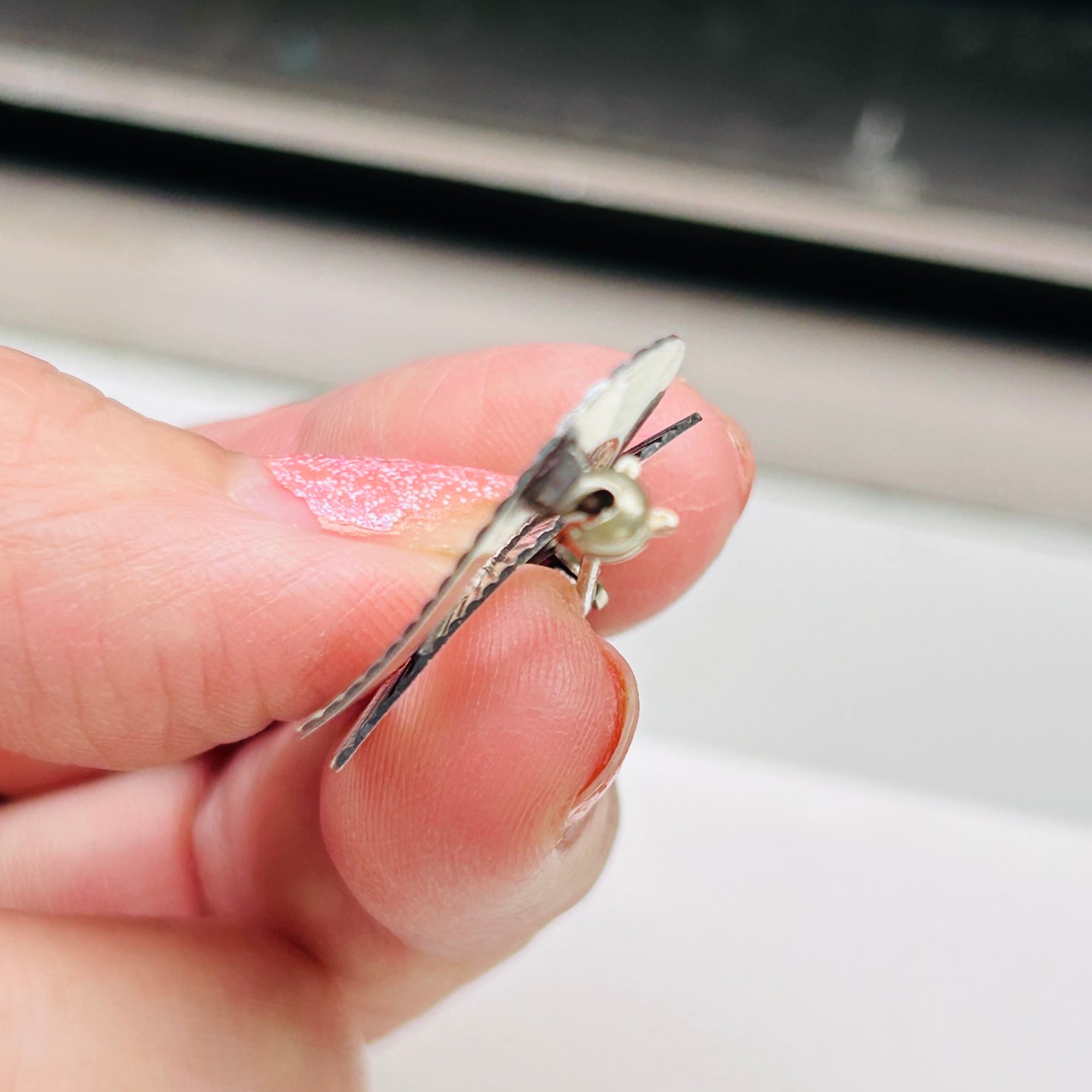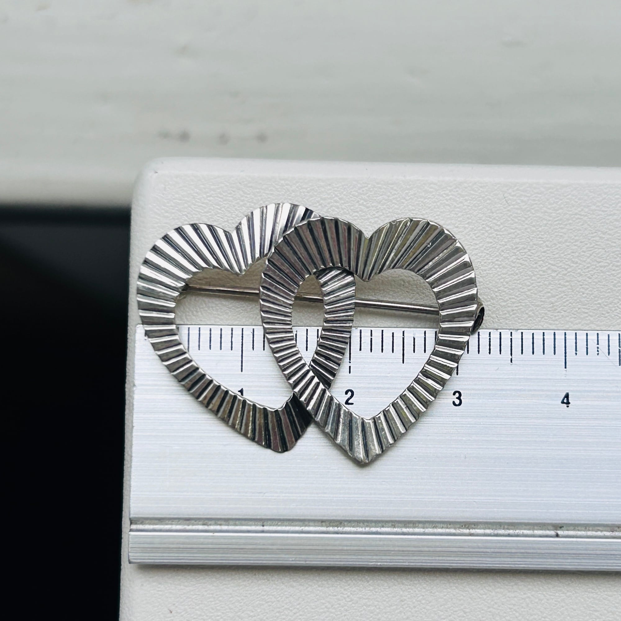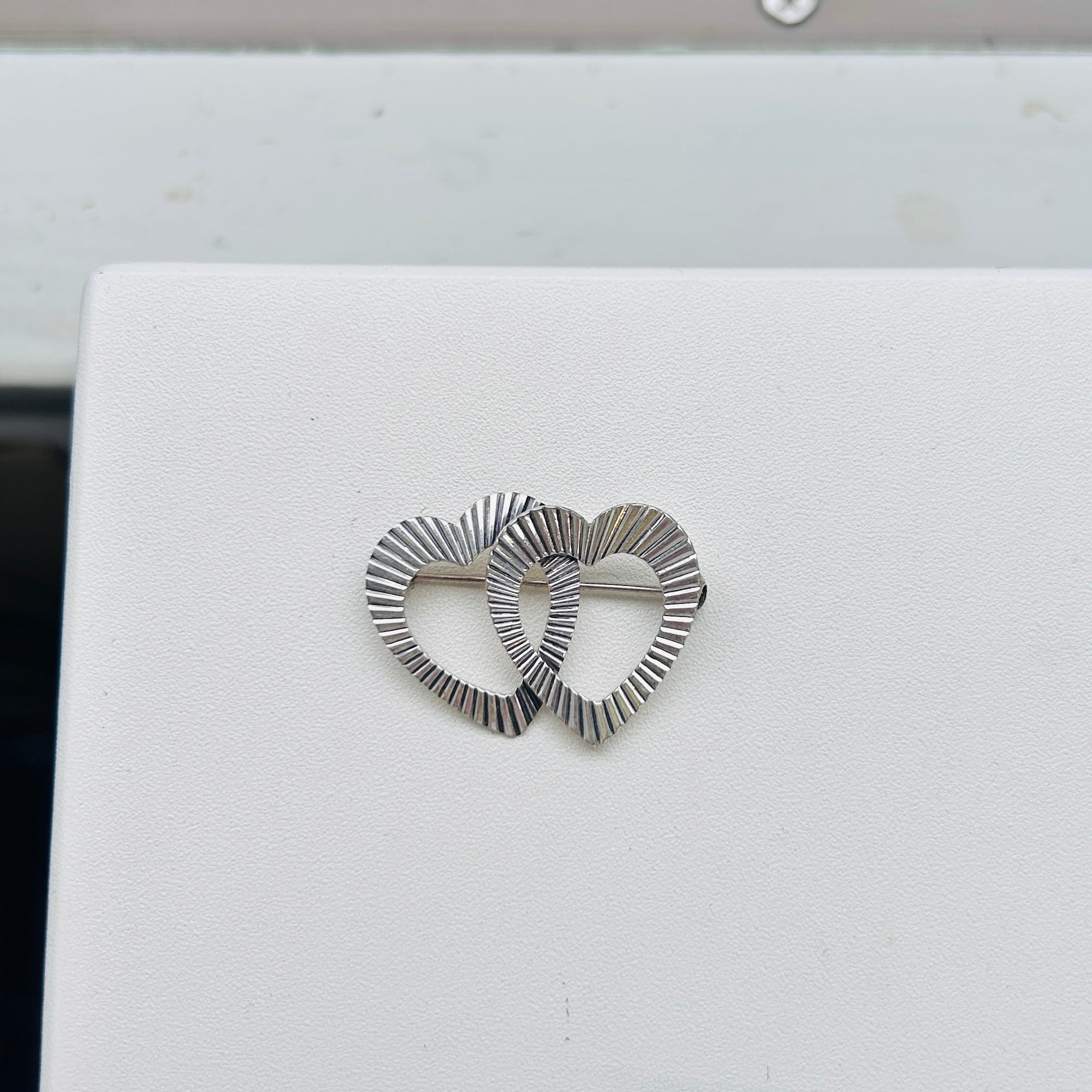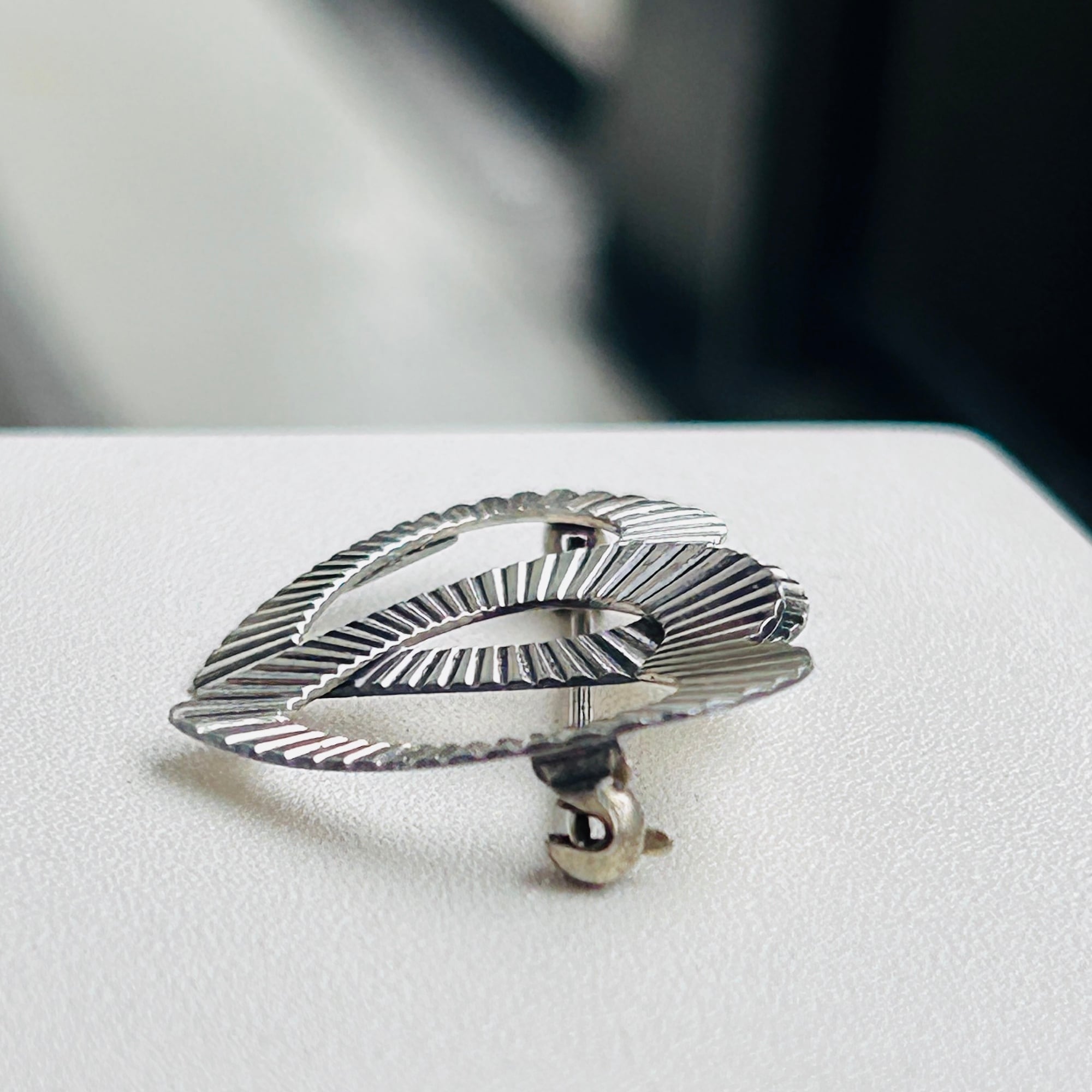 小さなバブルハートブローチ。縞模様がクラシカルな雰囲気を出してくれてます。薄くて軽いですが凹凸あるデザインで存在感があります。針が太めで着画の白シャツに刺さりません。強く刺したら丸穴が空きそうな気がしたのでファー着け襟に着けました。ブローチは目の粗い生地(ニットやスウェット)に適しています。裏に「STERLING」。針の動きに問題ありません。