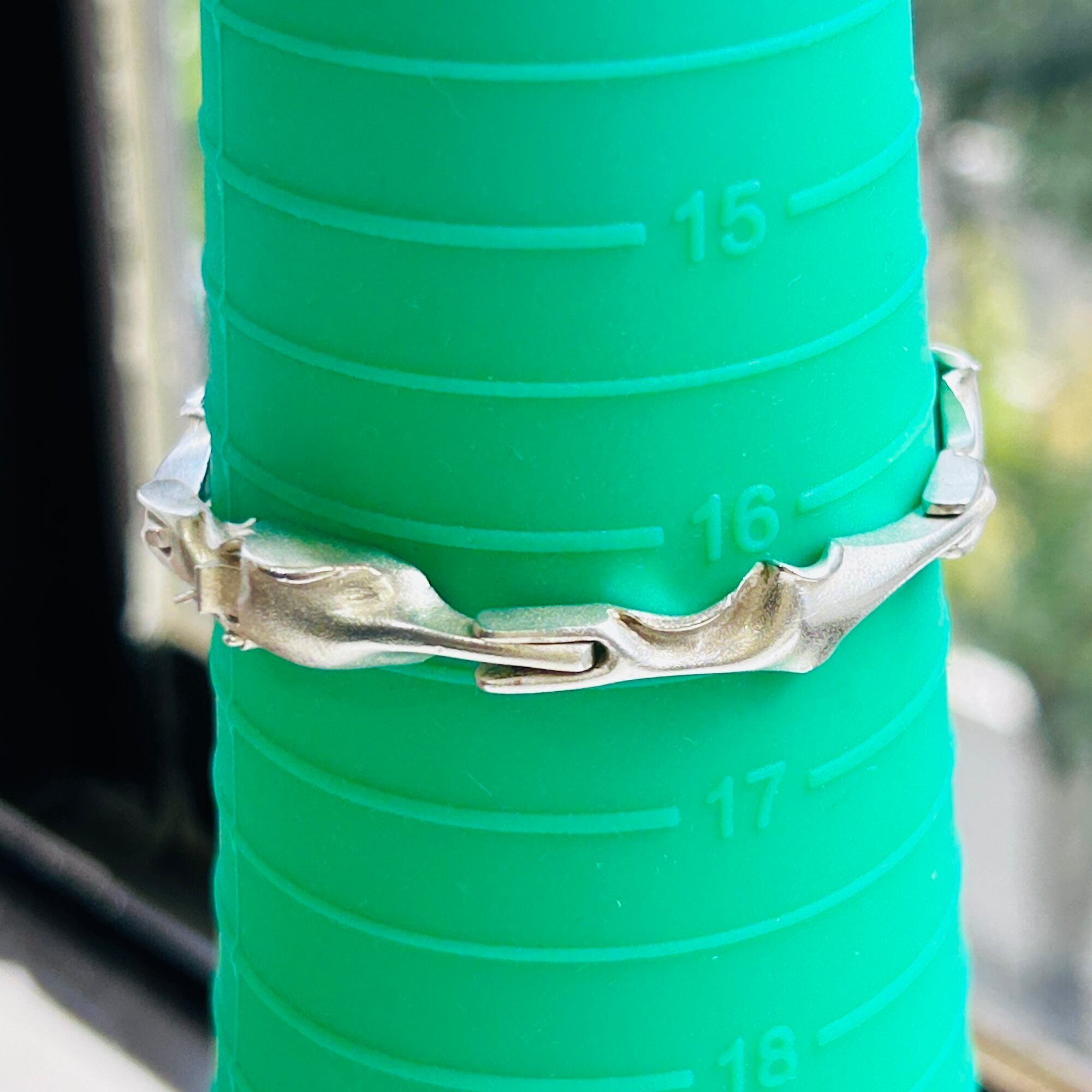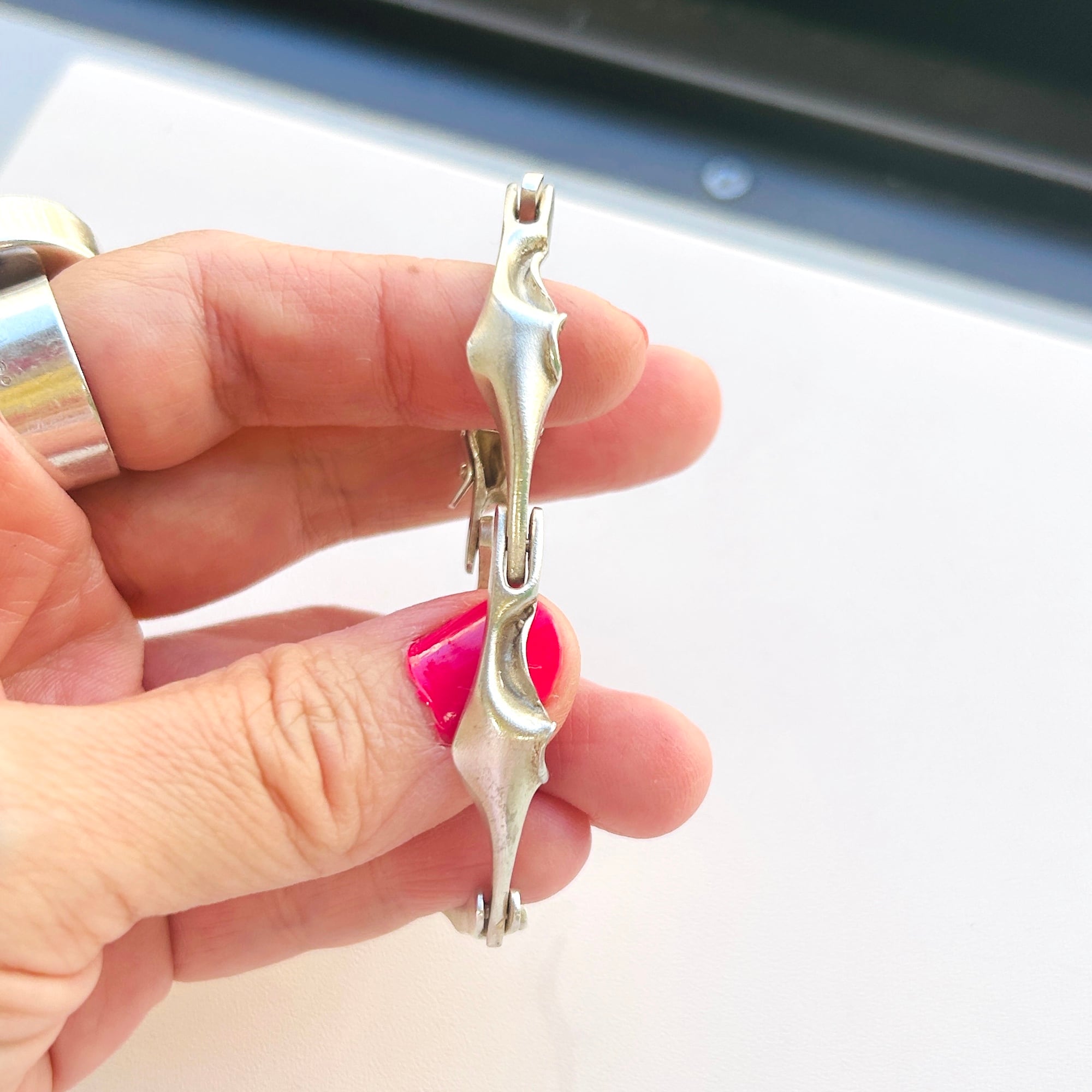 造形美が魅力の北欧ブレスレット。造形パーツがリンクした立体的なデザイン。ブラッシュトシルバーが放つサテン調の光彩が神秘的です。差し込み金具とセーフティフックで留めて頂けます。私の手首は約14.5cm。ちょうど良いフィットです。こちらはフィンランドで今も継続しているジュエリーブランド「Sirokoru(シロコル)」のデッドストックブレスレット。1979年製作発表の「Time Machine」というシリーズです。シコロルはMatti J. Hyvärinen(マッティ・ヒヴァリネン / 1937-2017)が1958年に設立したジュエリーブランドです。刻印は「MJH」「925」。製造年の刻印は消えていて読み取れませんがシリーズからして1979年です。当店のシロコルは1970〜80年頃、日本に輸入され関西の百貨店で販売されていましたが売却されないまま長い間保管されていたDEADSTOCKです。ご縁があって輸入元の方から当時の保管品が私のお店に巡ってきました。シルバー磨きクロスで磨いて頂くといいツヤが出ます。溝の深い部分の黒ずみが気になりましたら液体クリーナーの使用をお勧め致します。